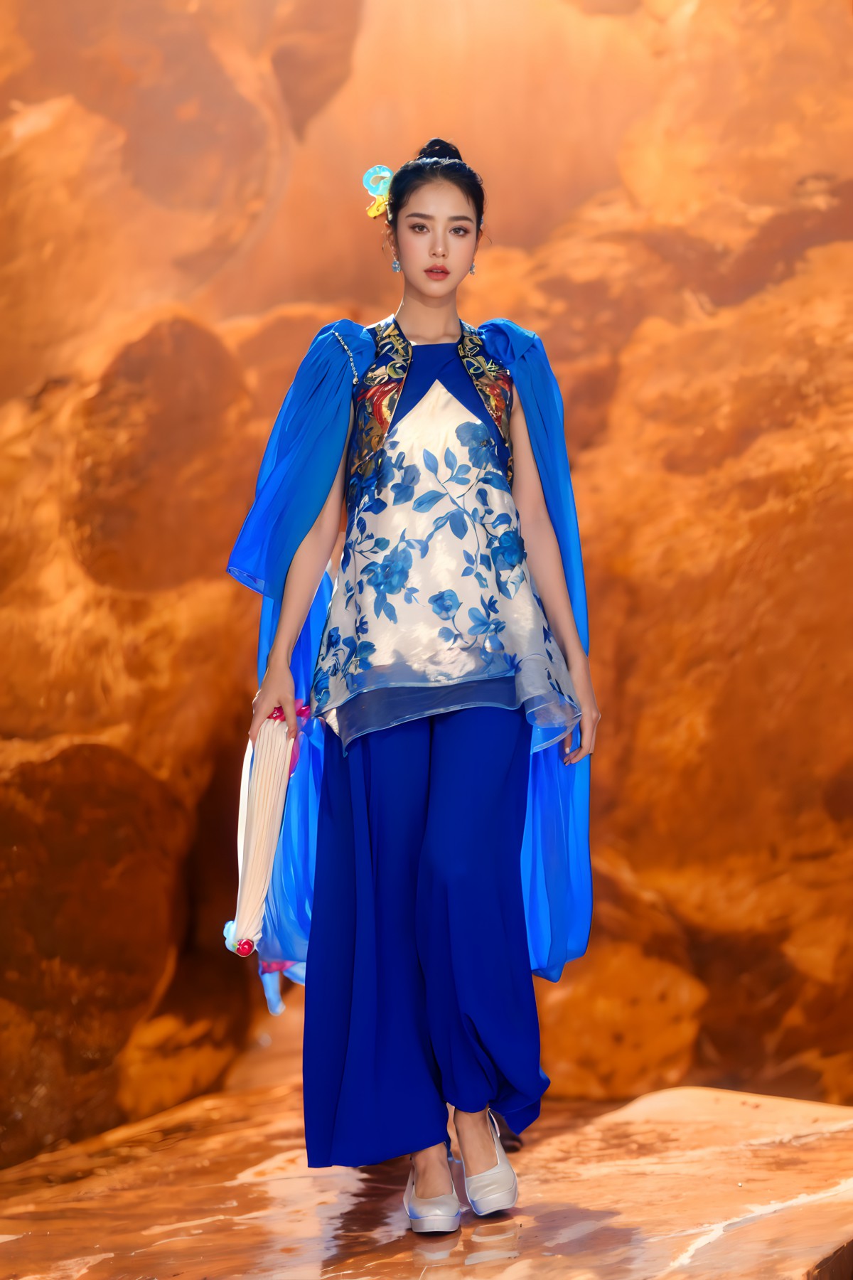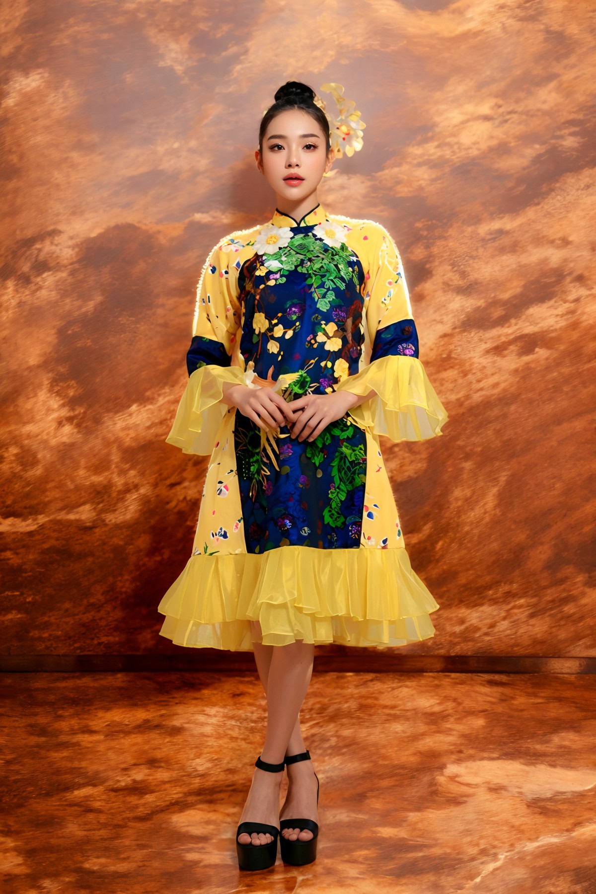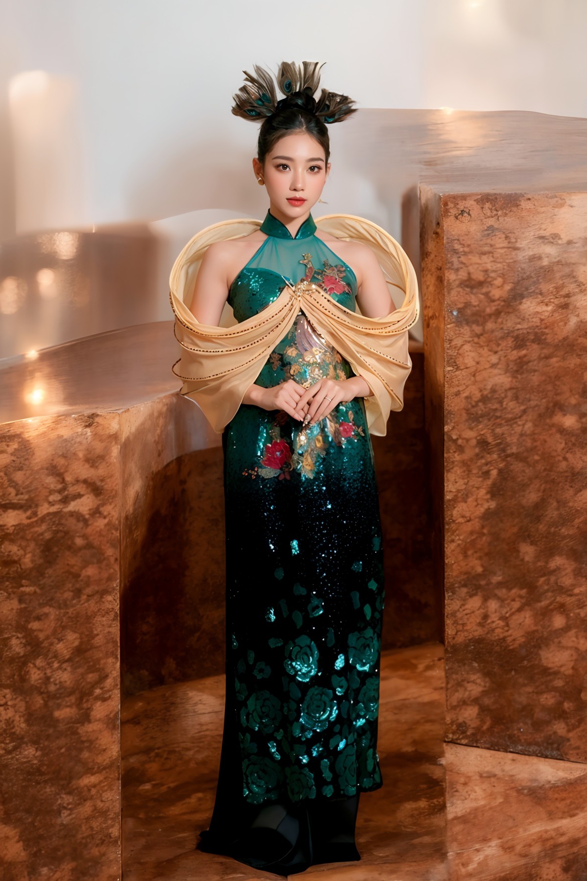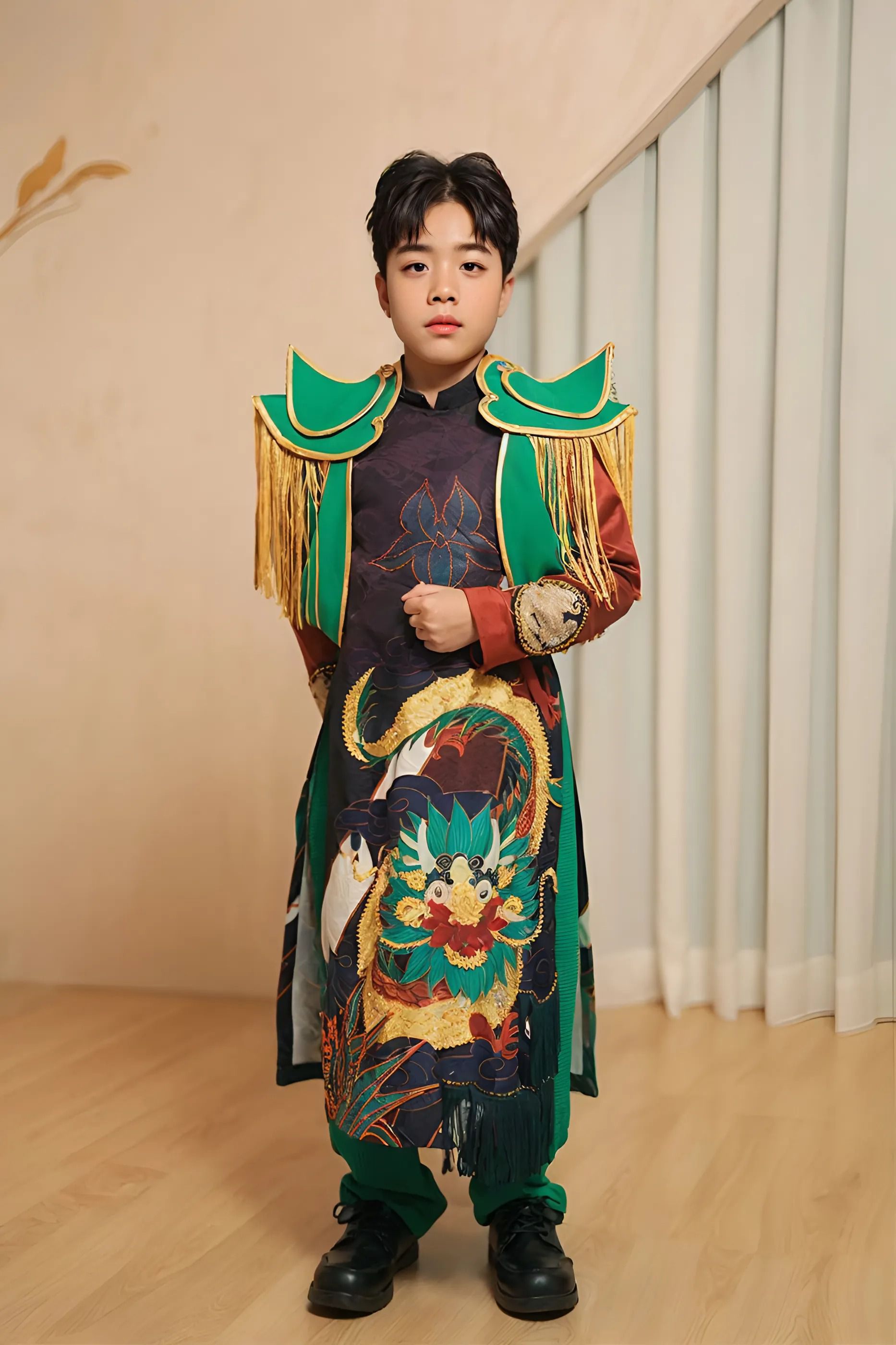 Điểm nhấn là các họa tiết long, lân, quy, phụng và các loài hoa, được in 3D sống động theo phong cách tranh thủy mặc. Tất cả tạo nên một tổng thể hài hòa, tôn vinh vẻ đẹp truyền thống Á Đông cùng hơi thở đương đại.