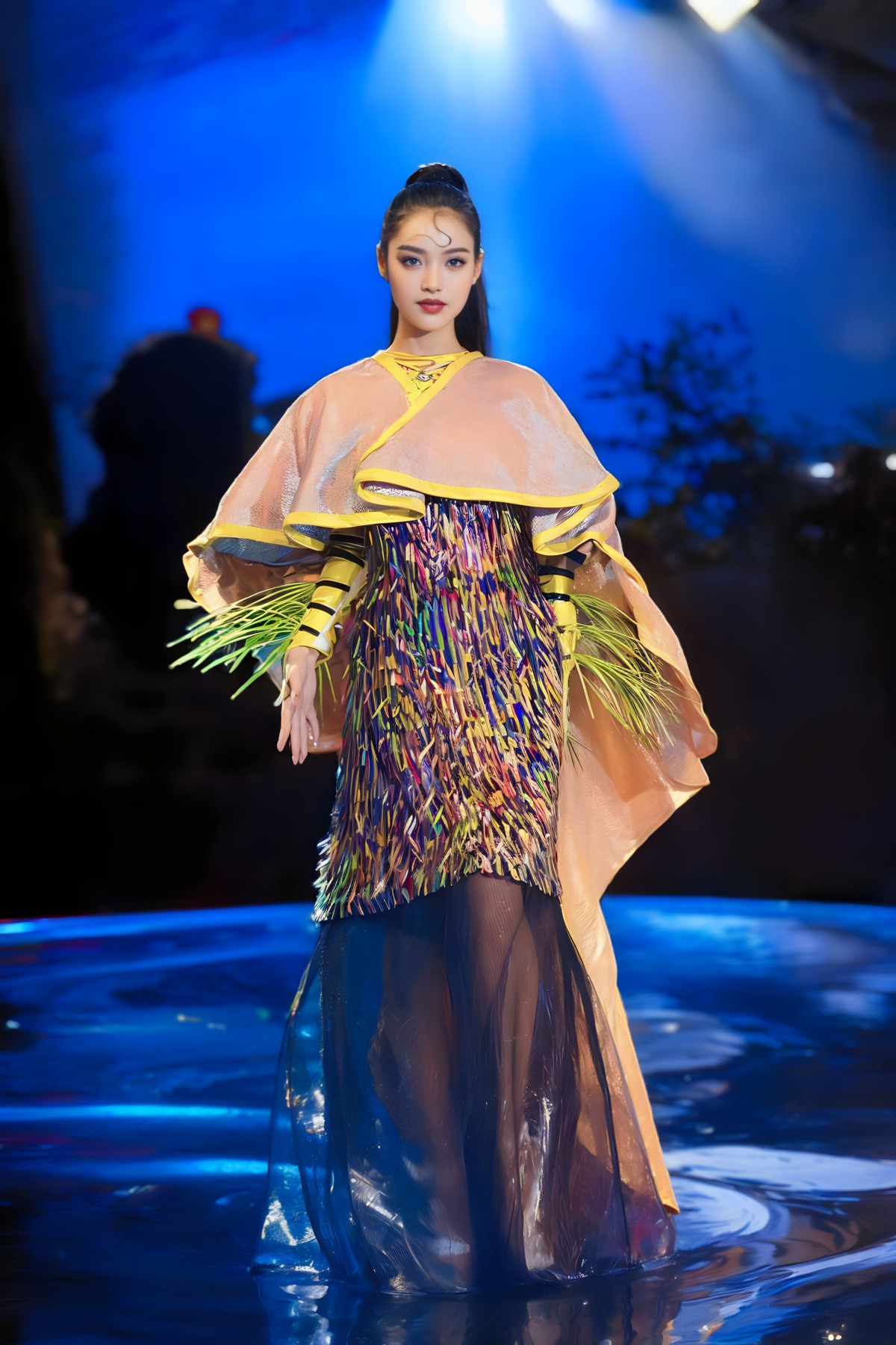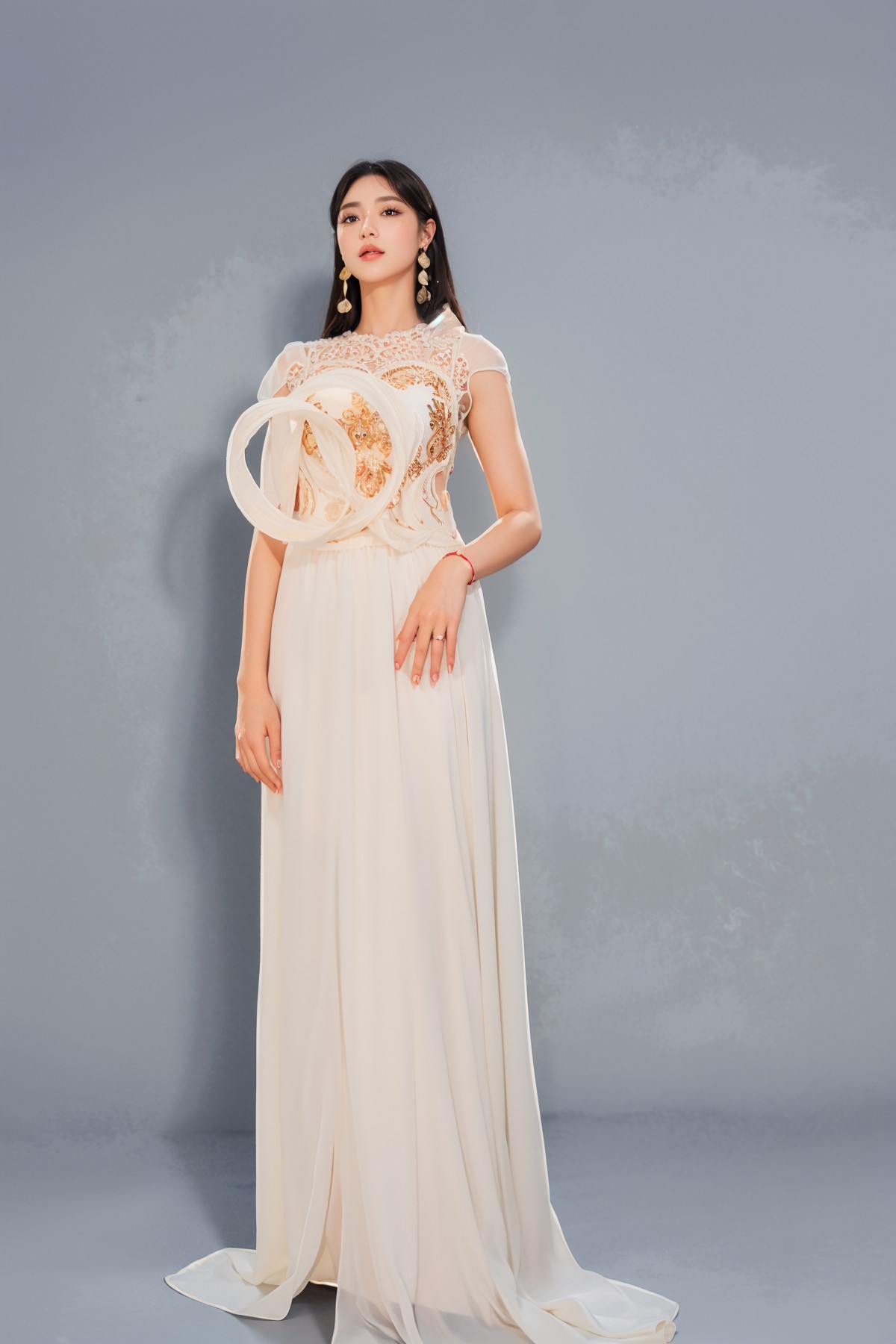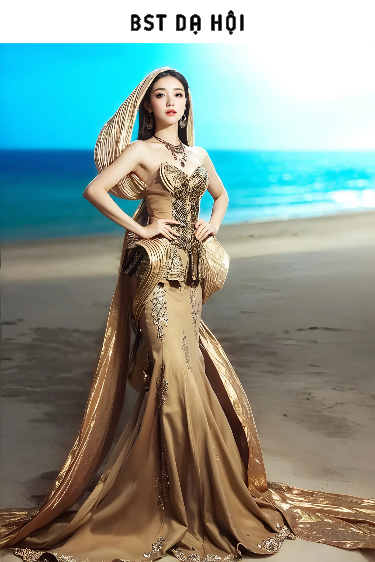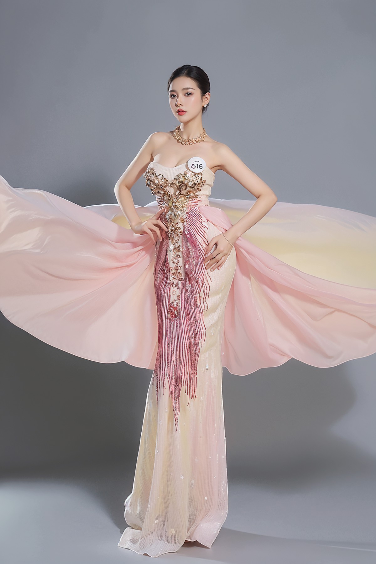 Các thiết kế nổi bật với phom dáng tinh xảo, sử dụng màu sắc sang trọng như vàng kim, xanh sapphire, cùng các họa tiết rồng, phượng được đính kết cầu kỳ. Bộ sưu tập tôn vinh vẻ đẹp kiêu sa và quyền quý của phái nữ.