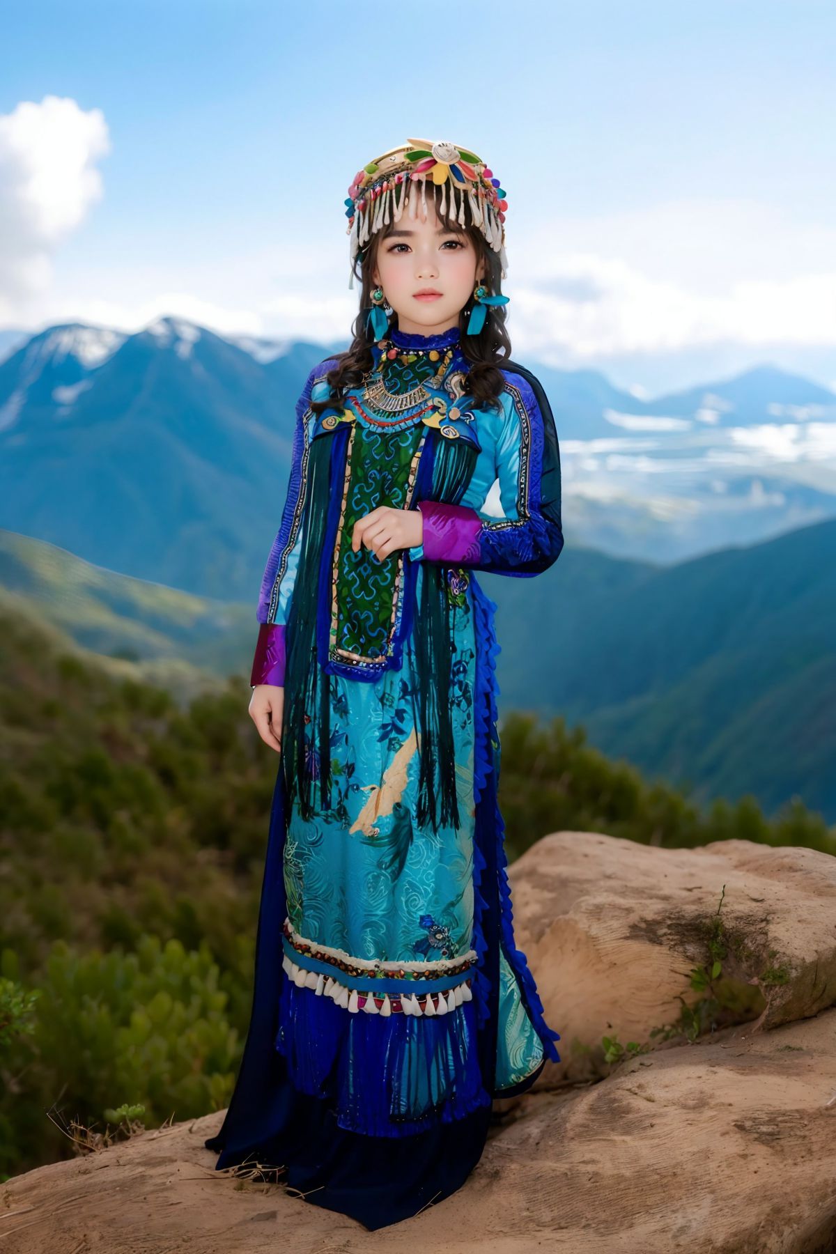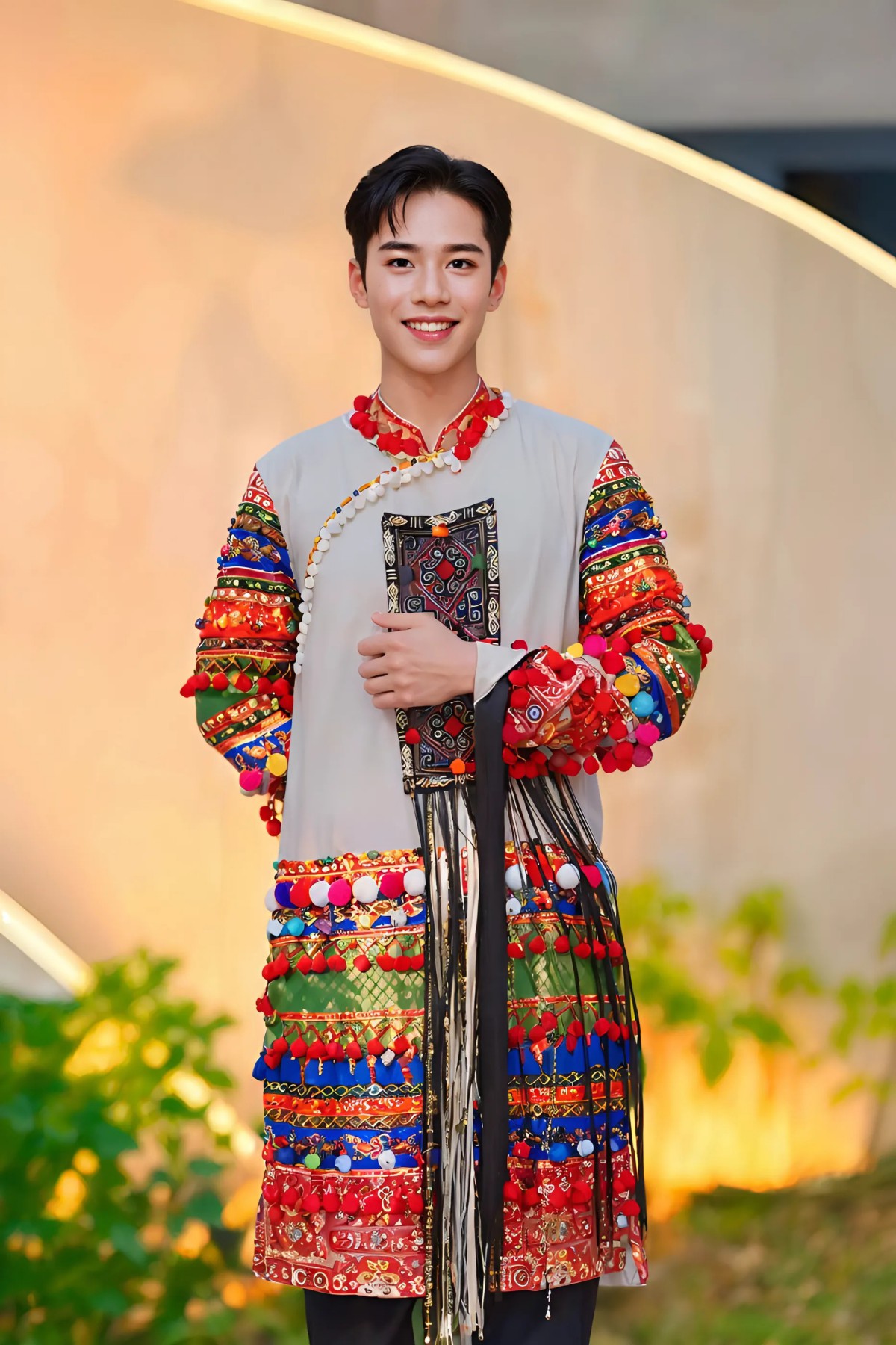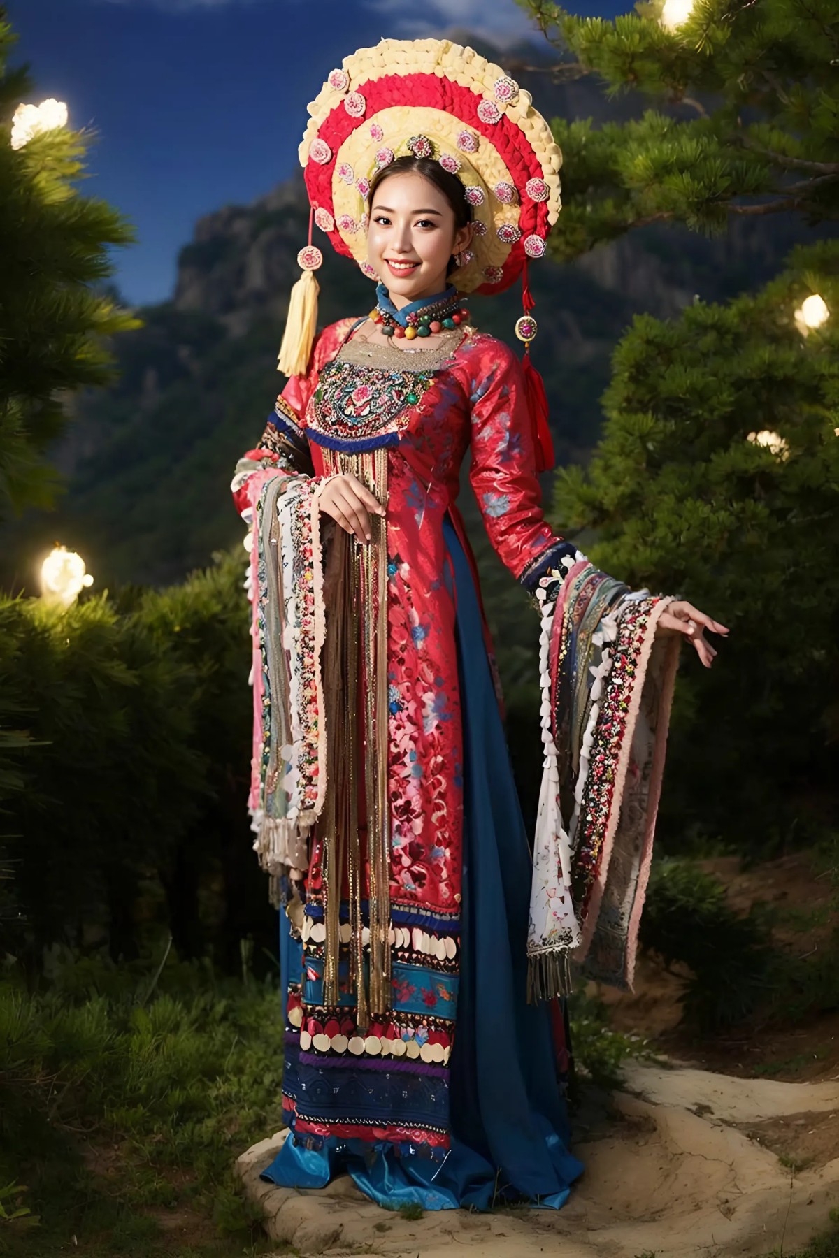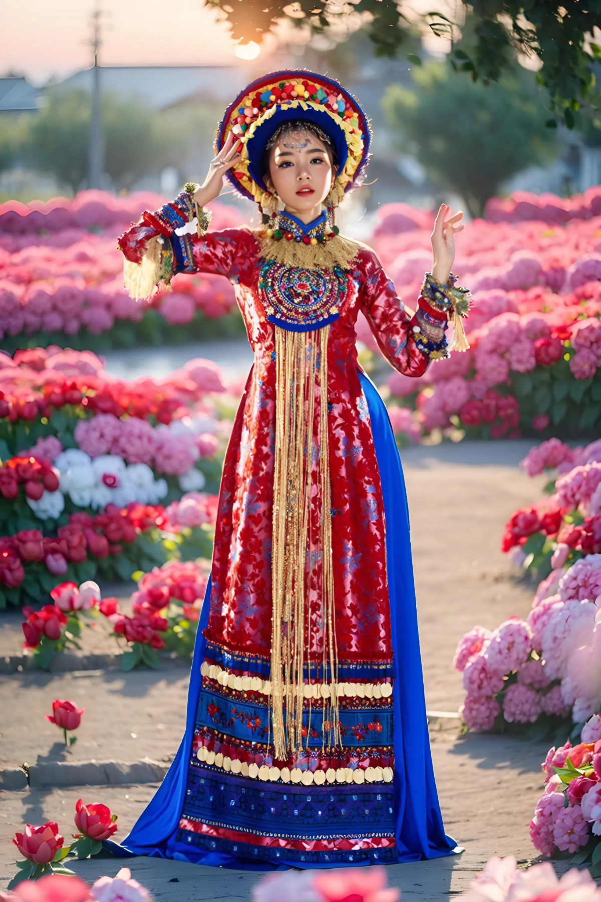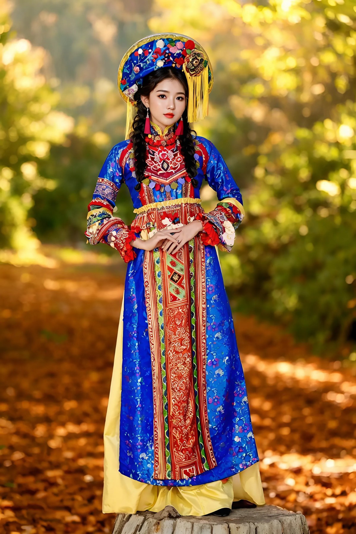 Chi tiết: Thêu tay hoa văn dân tộc, đính kết hạt cườm, tua rua, phối khăn choàng và mấn đội đầu.