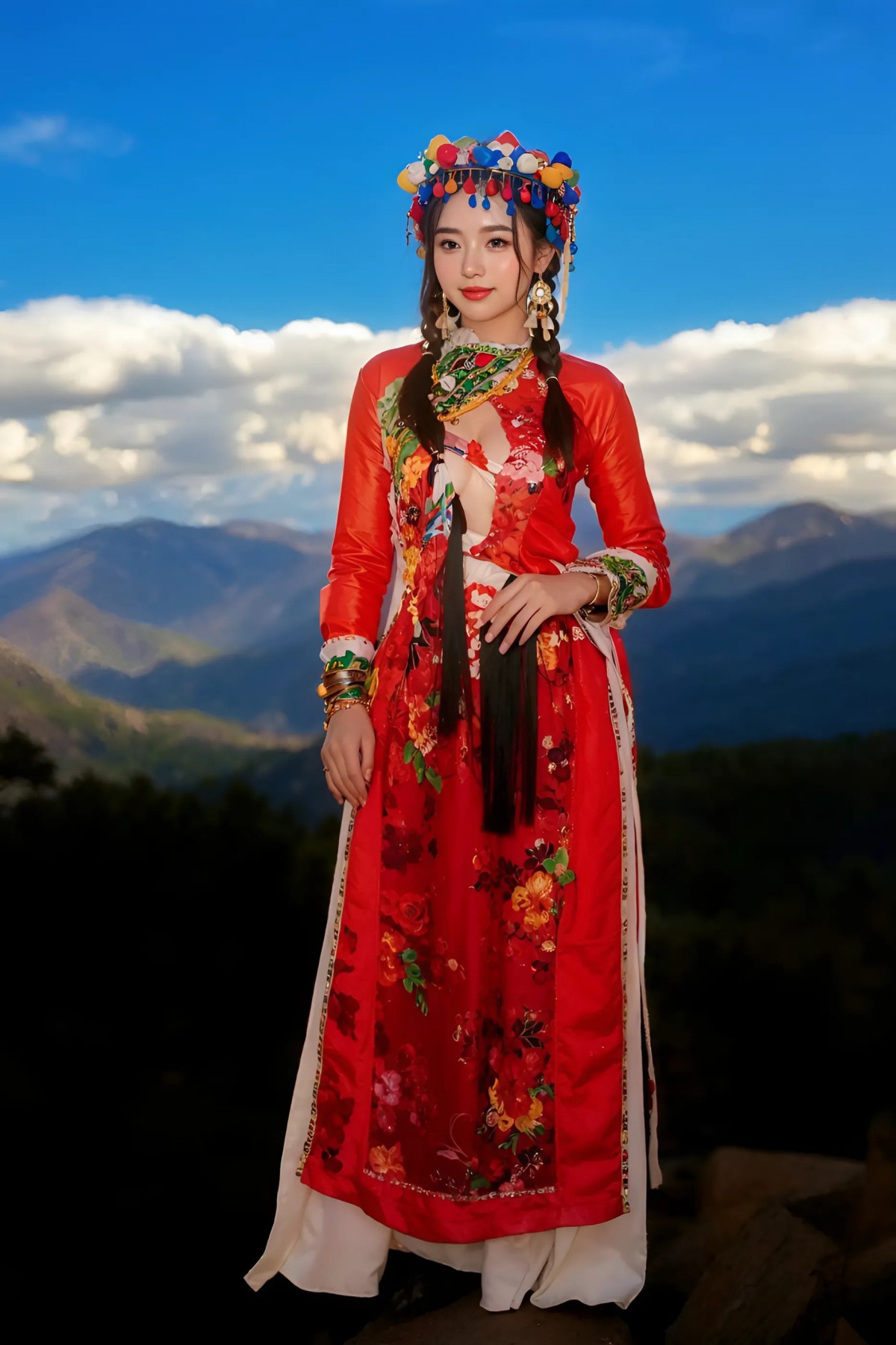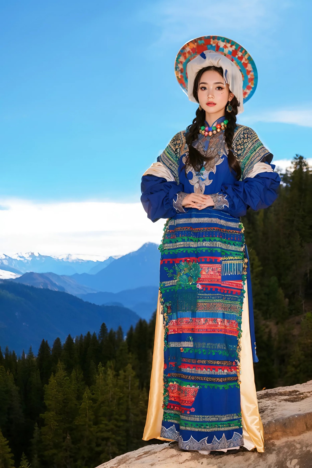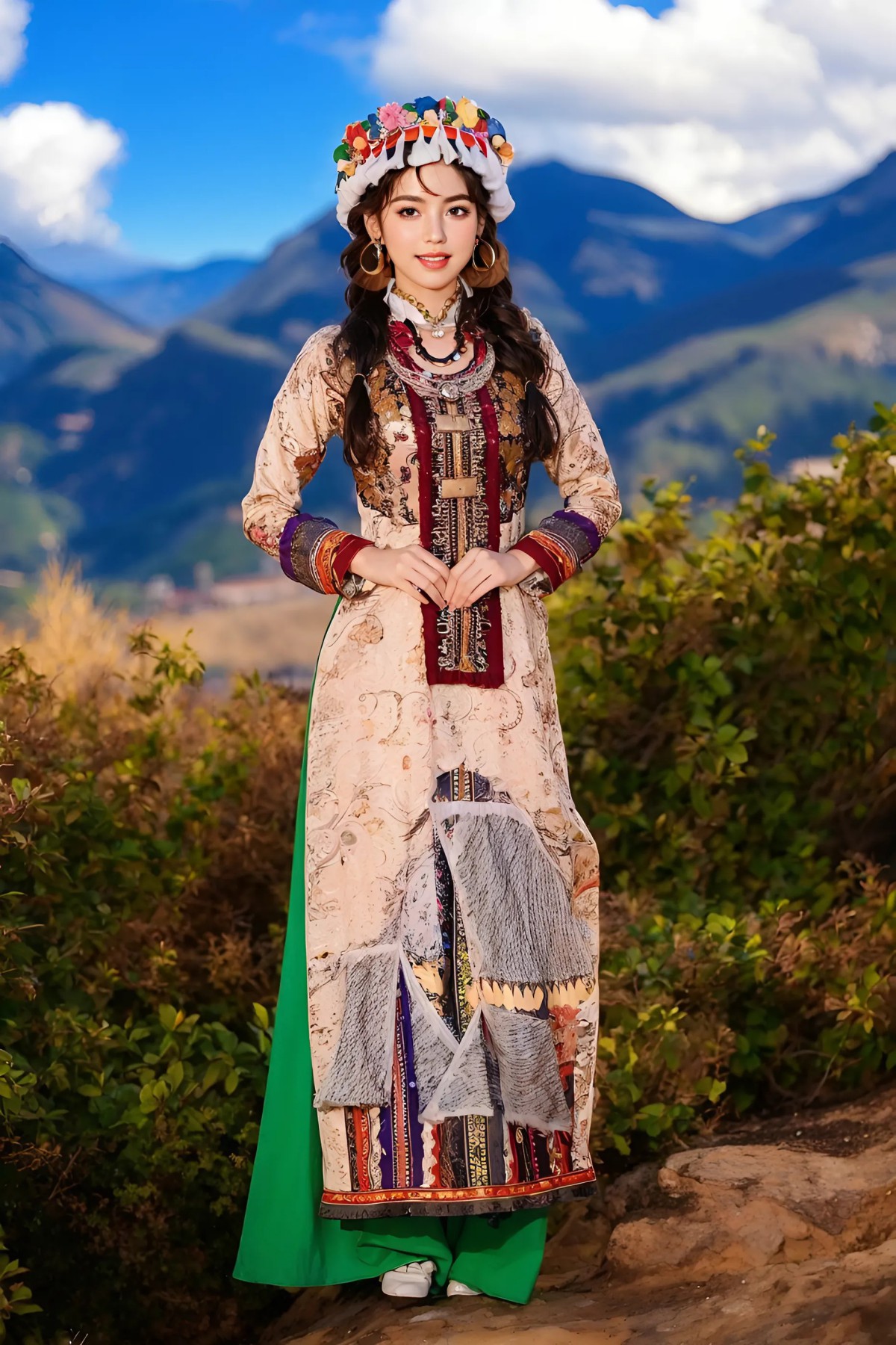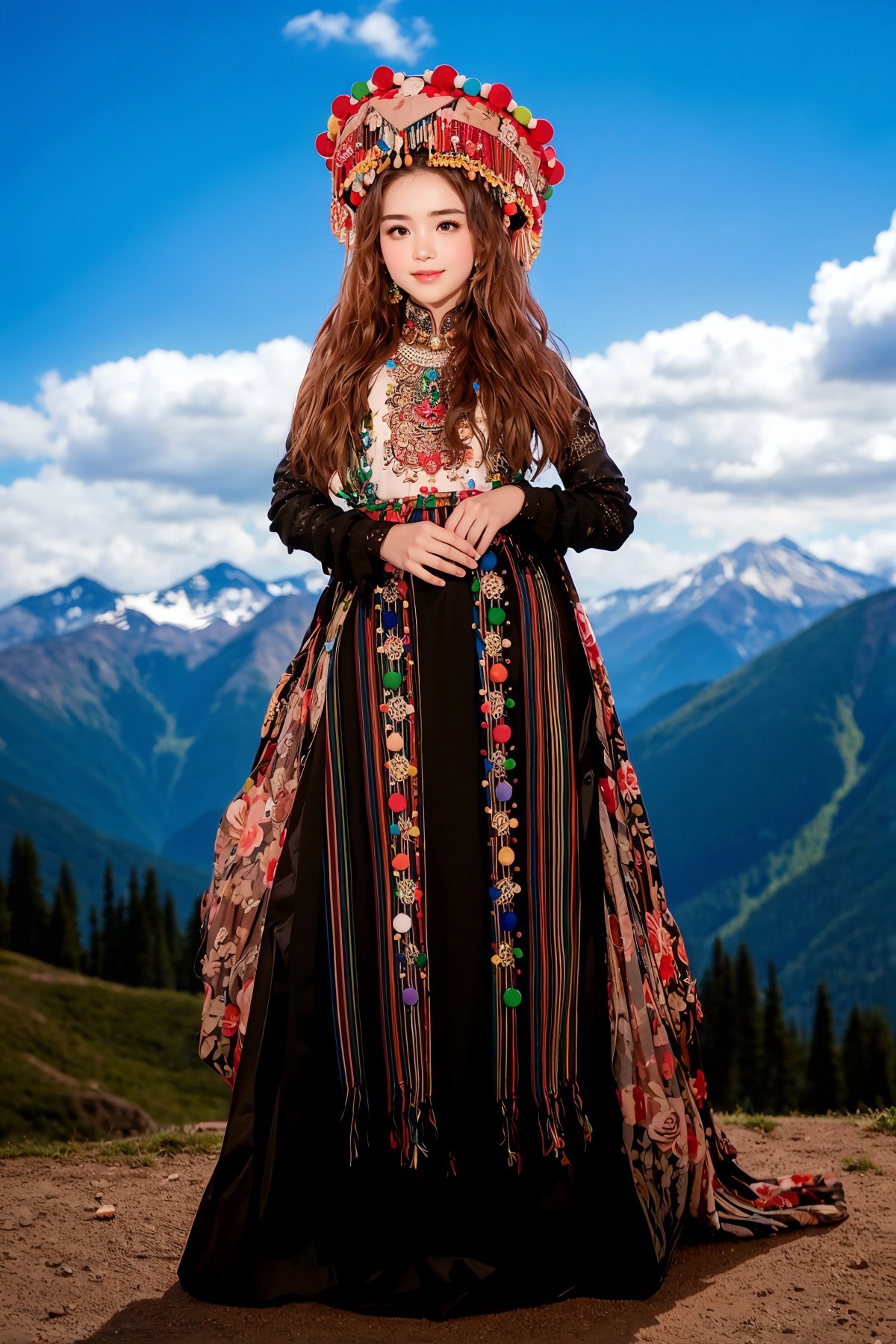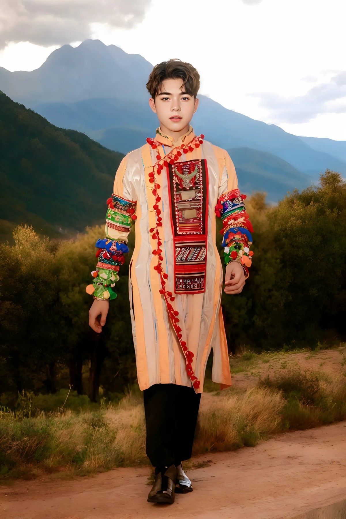 Chi tiết: Thêu tay hoa văn dân tộc, đính kết hạt cườm, tua rua, phối khăn choàng và mấn đội đầu.