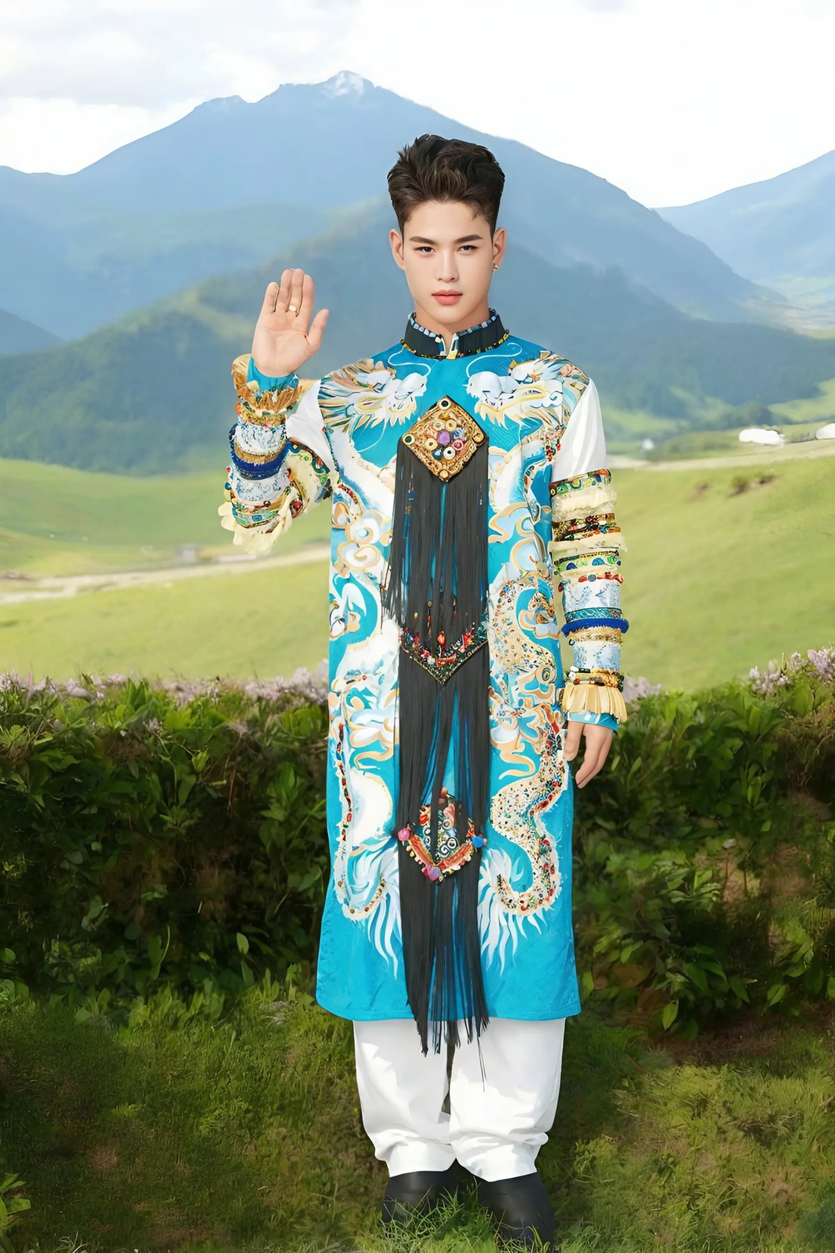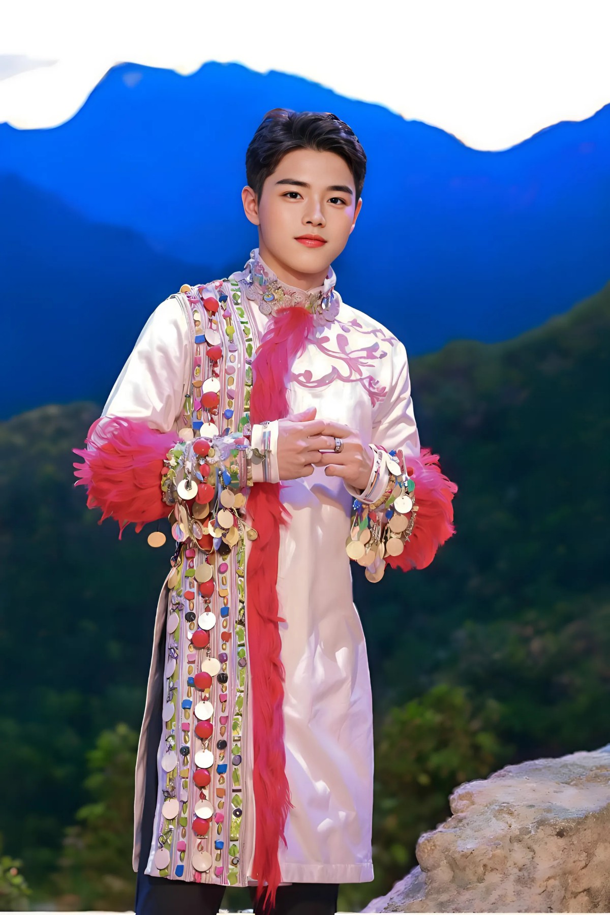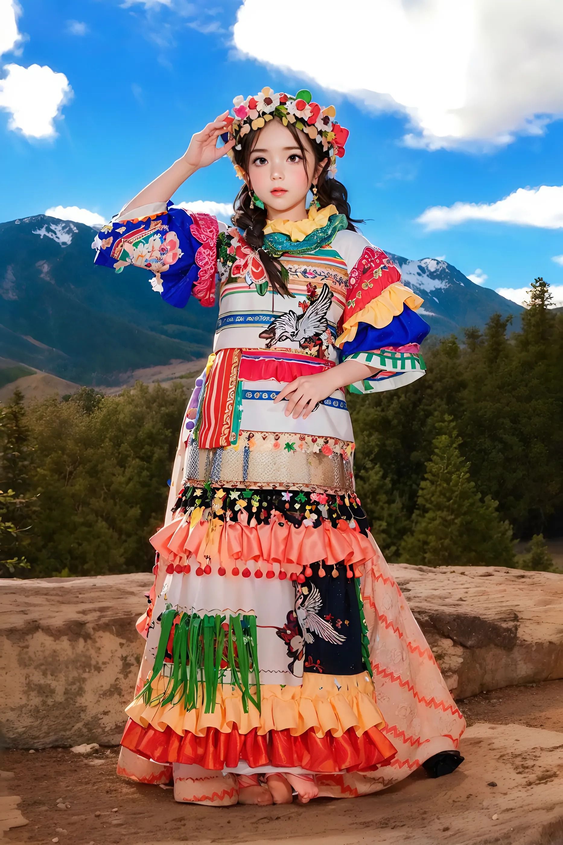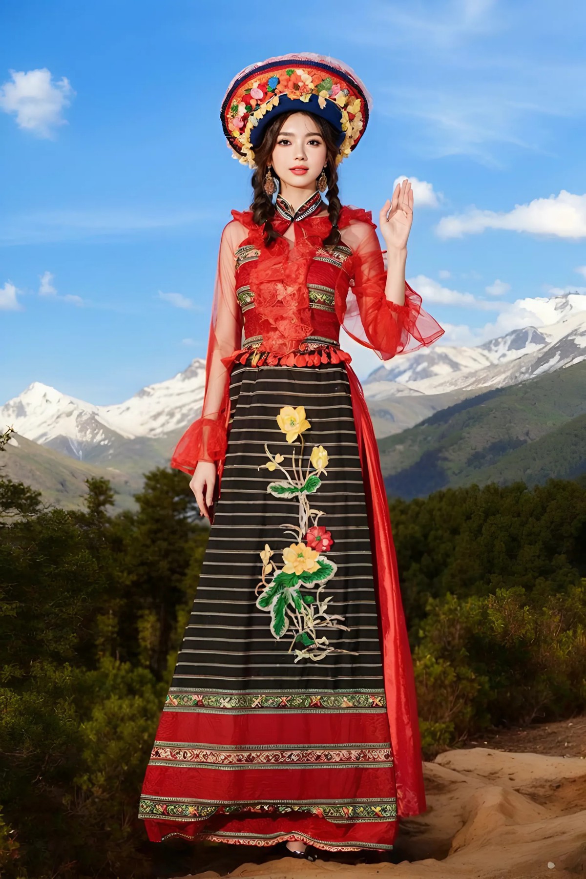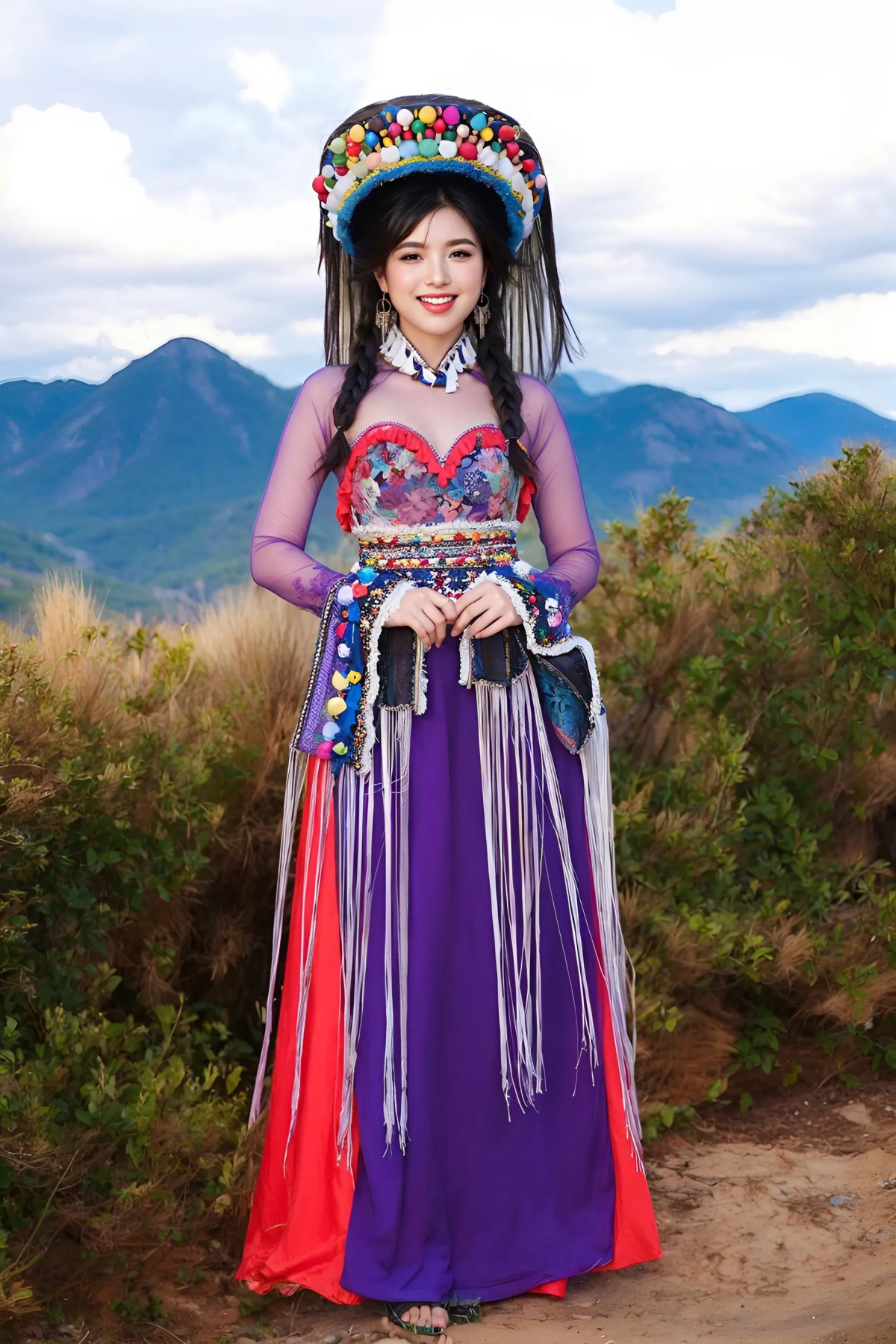 Chi tiết: Thêu tay hoa văn dân tộc, đính kết hạt cườm, tua rua, phối khăn choàng và mấn đội đầu.