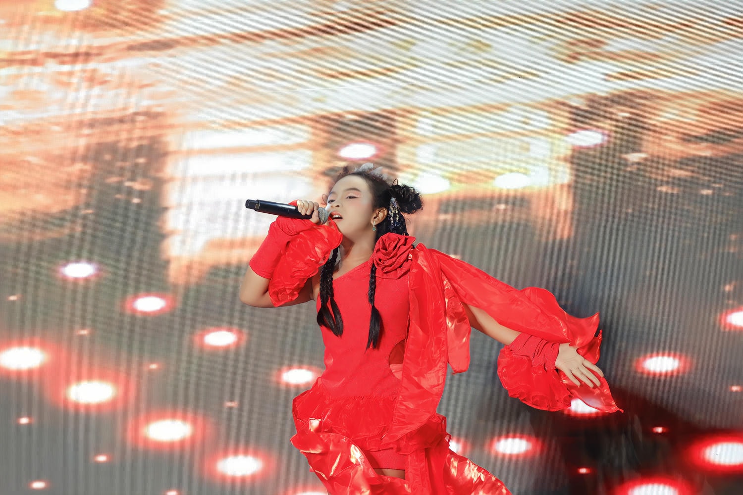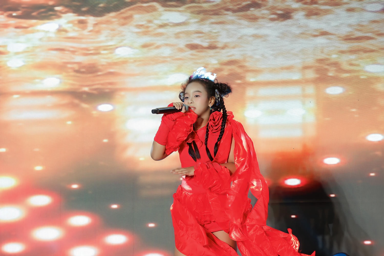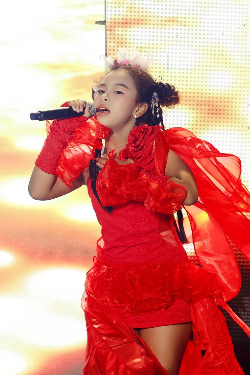 Trước tiên, khán giả đã được chiêm ngưỡng một Jasmine Sao Khuê nồng nhiệt và nội lực trong chương trình "Mỹ Vị Sông Ngàn". Khoác lên mình chiếc đầm màu đỏ rực như lửa, với những chi tiết xếp bèo và lớp vải xuyên thấu bay bổng, cô bé đứng vững vàng dưới ánh đèn sân khấu. Màu đỏ không chỉ làm nổi bật hình ảnh của một chiến binh âm nhạc mà còn cộng hưởng với chất giọng mạnh mẽ, đầy cảm xúc mà Sao Khuê truyền tải. Từng cử chỉ cầm micro, từng ánh mắt giao tiếp với khán giả đều toát lên sự chuyên nghiệp, cho thấy sự nghiêm túc và niềm đam mê vô bờ bến của cô bé dành cho âm nhạc. Đó là một màn trình diễn bùng nổ, khẳng định một giọng ca trẻ đầy tiềm năng.