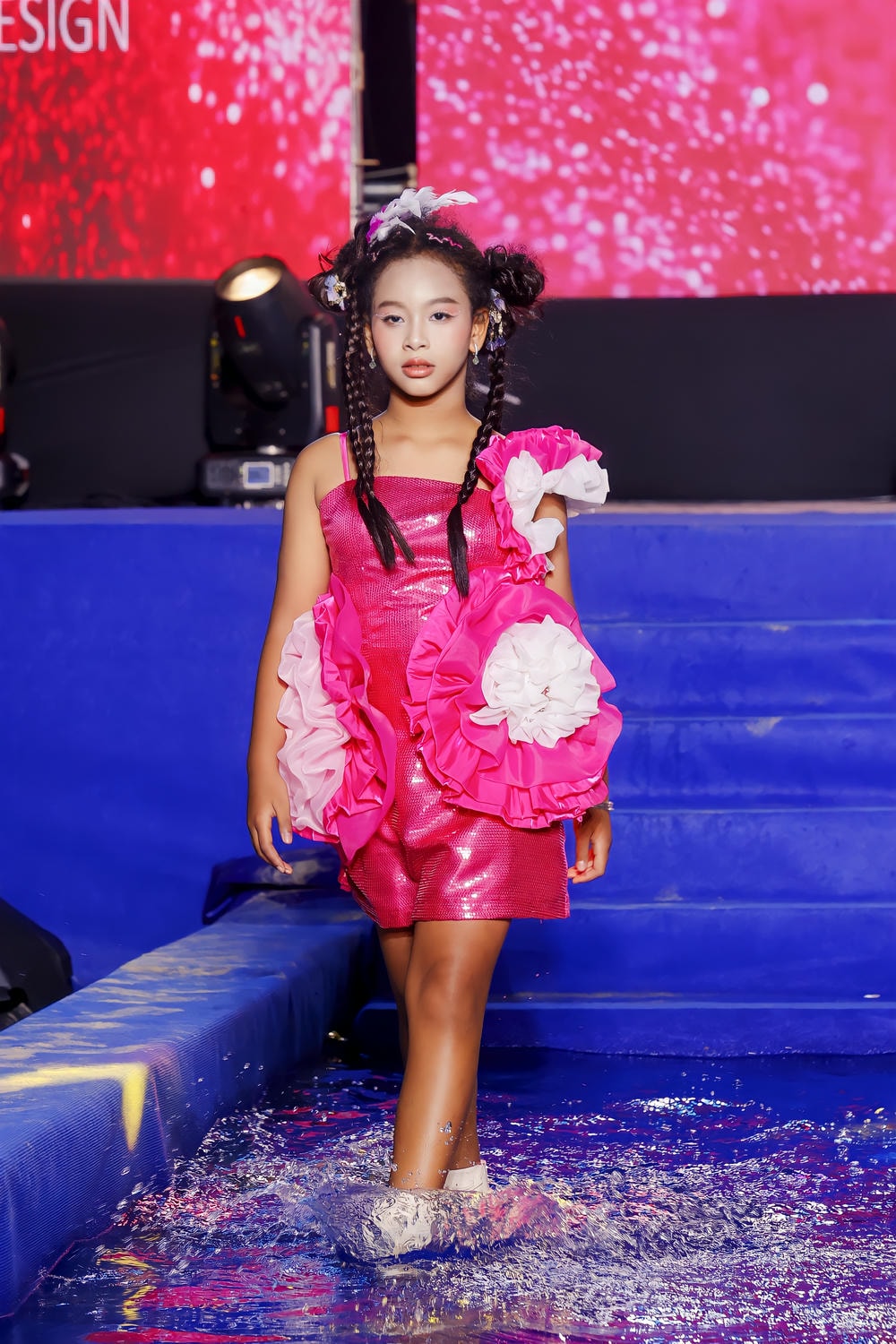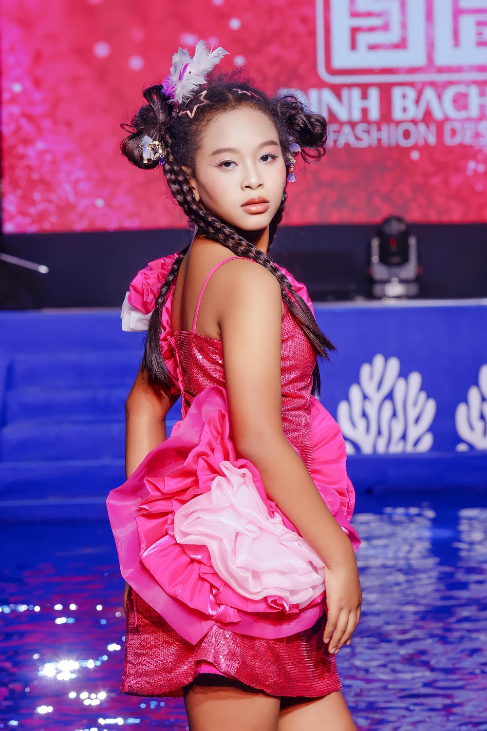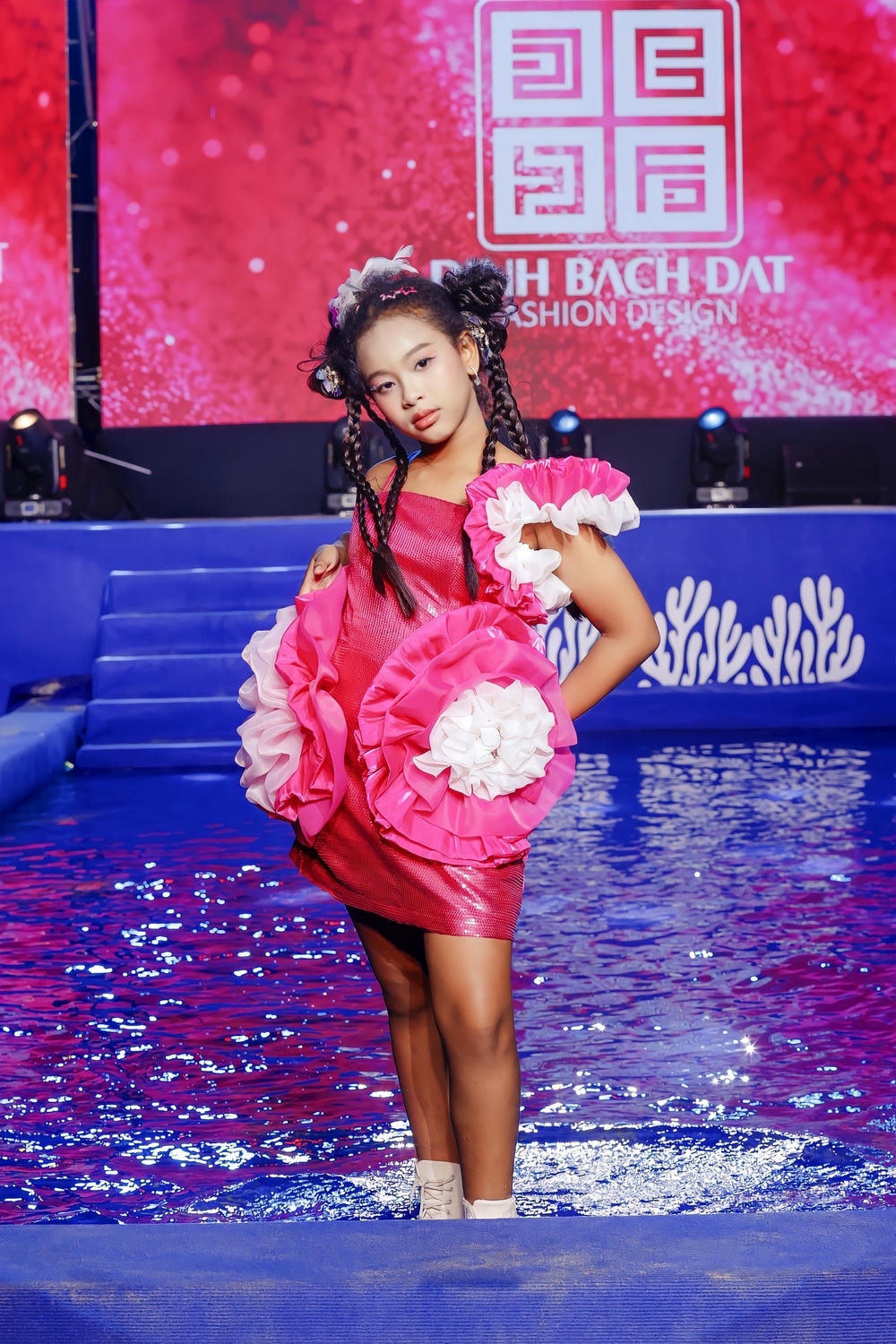 Trong chiếc đầm dạ hội mini màu hồng cánh sen lấp lánh sequin, điểm xuyết những đóa hoa bèo nhún trắng và hồng bồng bềnh như những đám mây, Sao Khuê hóa thân thành một nàng thơ hiện đại. Hình ảnh cô bé bước đi dứt khoát trên mặt nước xanh thẫm, làm bắn lên những giọt nước long lanh, đã tạo nên một khung cảnh siêu thực và mãn nhãn. Dù phải đối mặt với thử thách catwalk trong điều kiện khó khăn, Sao Khuê vẫn duy trì được thần thái sắc lạnh và tự tin. Mỗi bước đi, mỗi chuyển động cơ thể đều được kiểm soát hoàn hảo, không hề bị phân tâm bởi làn nước. Cô bé đã thành công trong việc truyền tải trọn vẹn tinh thần lãng mạn, bay bổng nhưng cũng không kém phần mạnh mẽ của bộ sưu tập.