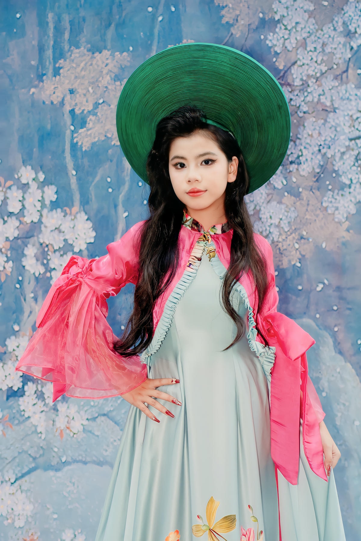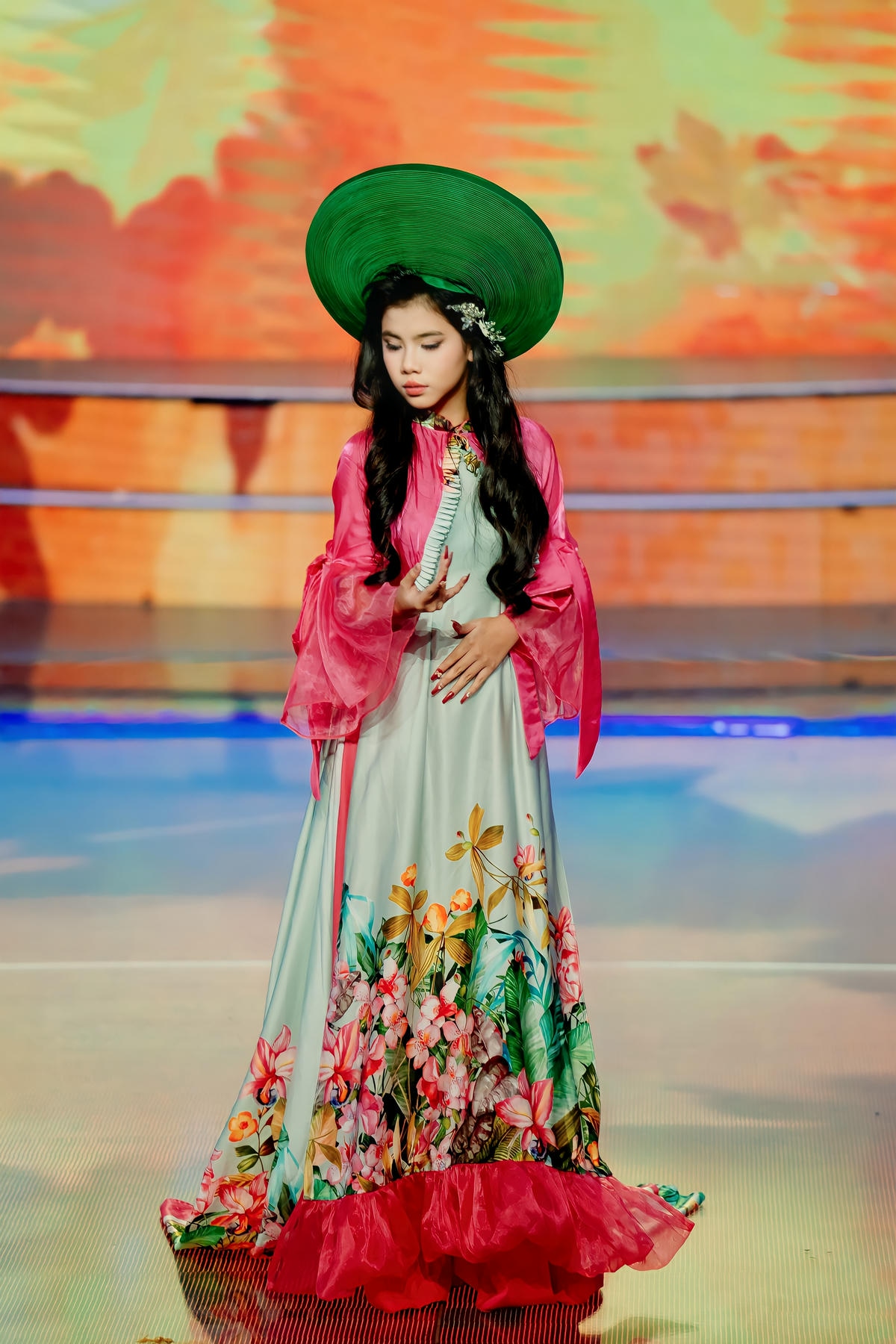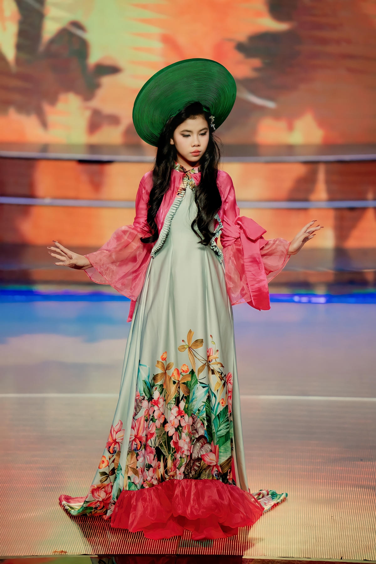 Ngay từ những bước đi đầu tiên trên sàn catwalk, Châu Ngân đã lập tức thu hút mọi ánh nhìn bằng vẻ đẹp trong trẻo, đáng yêu nhưng không kém phần cuốn hút. Gương mặt bầu bĩnh, phúc hậu, đôi mắt to tròn long lanh cùng nụ cười e ấp đã tạo nên một sức hút đặc biệt. Mái tóc dài gợn sóng nhẹ nhàng, điểm xuyết những bông hoa nhỏ xinh, kết hợp hoàn hảo với chiếc nón lá truyền thống màu xanh ngọc bích đã làm nổi bật nét đẹp Á Đông thuần khiết, dịu dàng của cô bé. Châu Ngân không chỉ có vẻ đẹp ngoại hình mà còn sở hữu một thần thái trình diễn đầy tự tin và chuyên nghiệp, thể hiện sự làm chủ sàn diễn qua từng bước đi nhẹ nhàng, uyển chuyển và những cử chỉ duyên dáng.