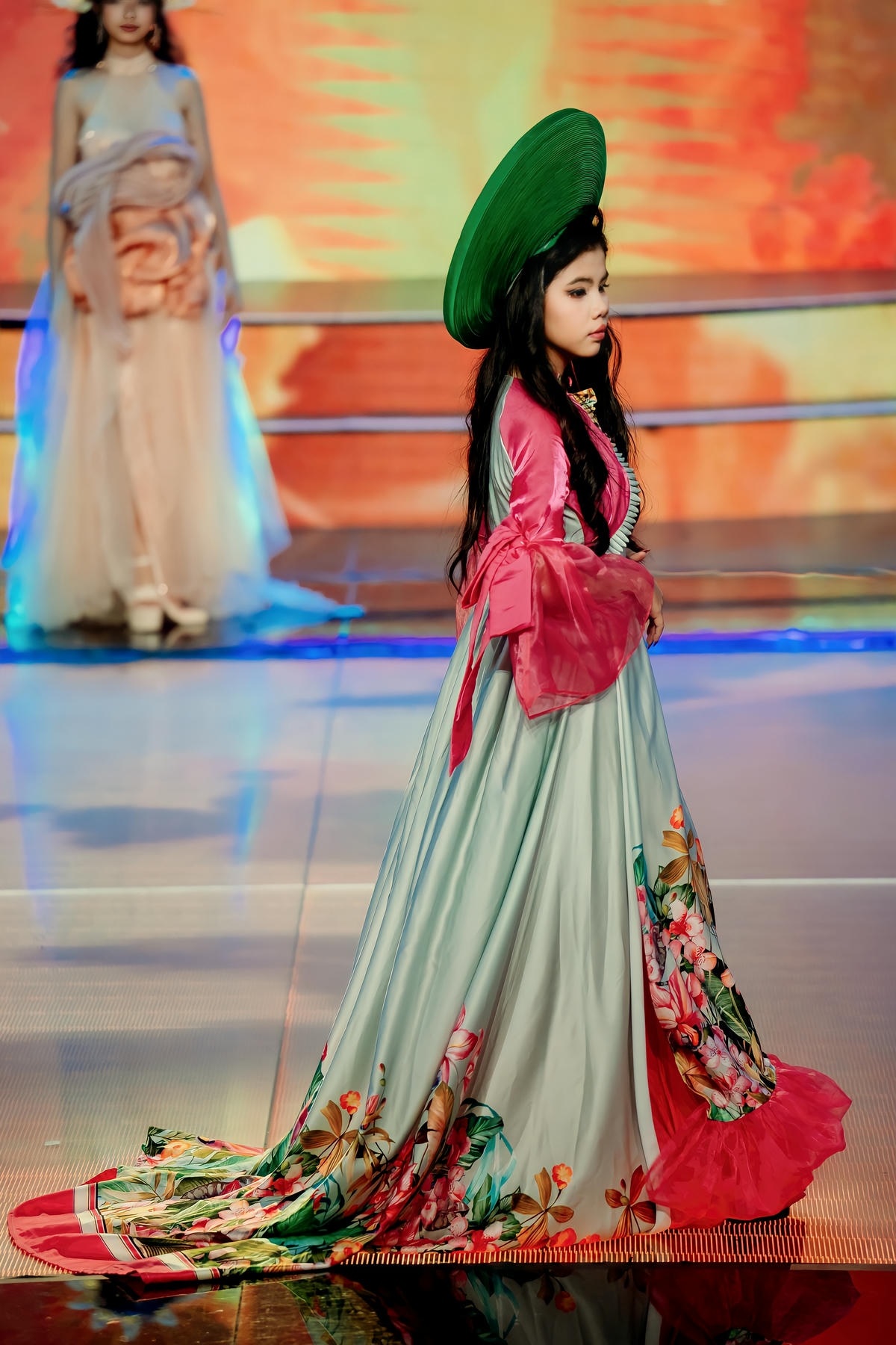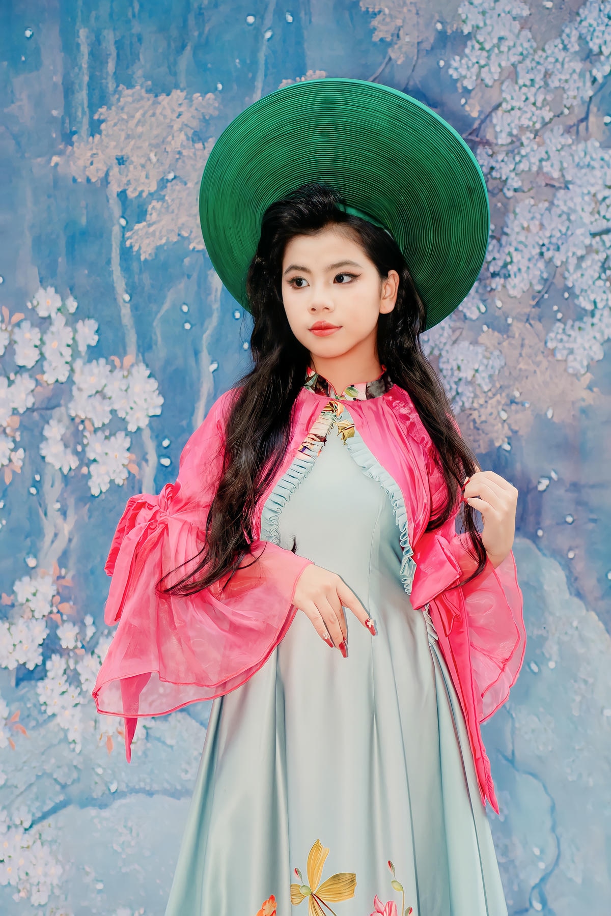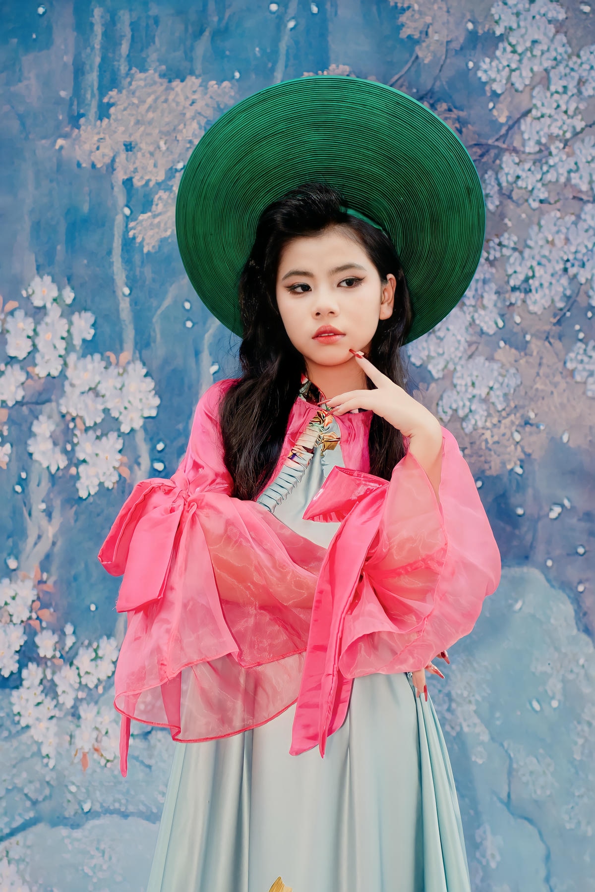 Ngay từ những bước đi đầu tiên trên sàn catwalk, Châu Ngân đã lập tức thu hút mọi ánh nhìn bằng vẻ đẹp trong trẻo, đáng yêu nhưng không kém phần cuốn hút. Gương mặt bầu bĩnh, phúc hậu, đôi mắt to tròn long lanh cùng nụ cười e ấp đã tạo nên một sức hút đặc biệt. Mái tóc dài gợn sóng nhẹ nhàng, điểm xuyết những bông hoa nhỏ xinh, kết hợp hoàn hảo với chiếc nón lá truyền thống màu xanh ngọc bích đã làm nổi bật nét đẹp Á Đông thuần khiết, dịu dàng của cô bé. Châu Ngân không chỉ có vẻ đẹp ngoại hình mà còn sở hữu một thần thái trình diễn đầy tự tin và chuyên nghiệp, thể hiện sự làm chủ sàn diễn qua từng bước đi nhẹ nhàng, uyển chuyển và những cử chỉ duyên dáng.