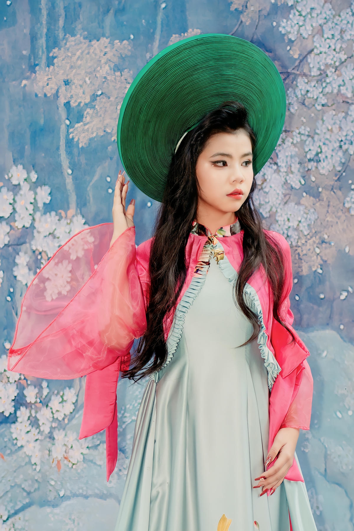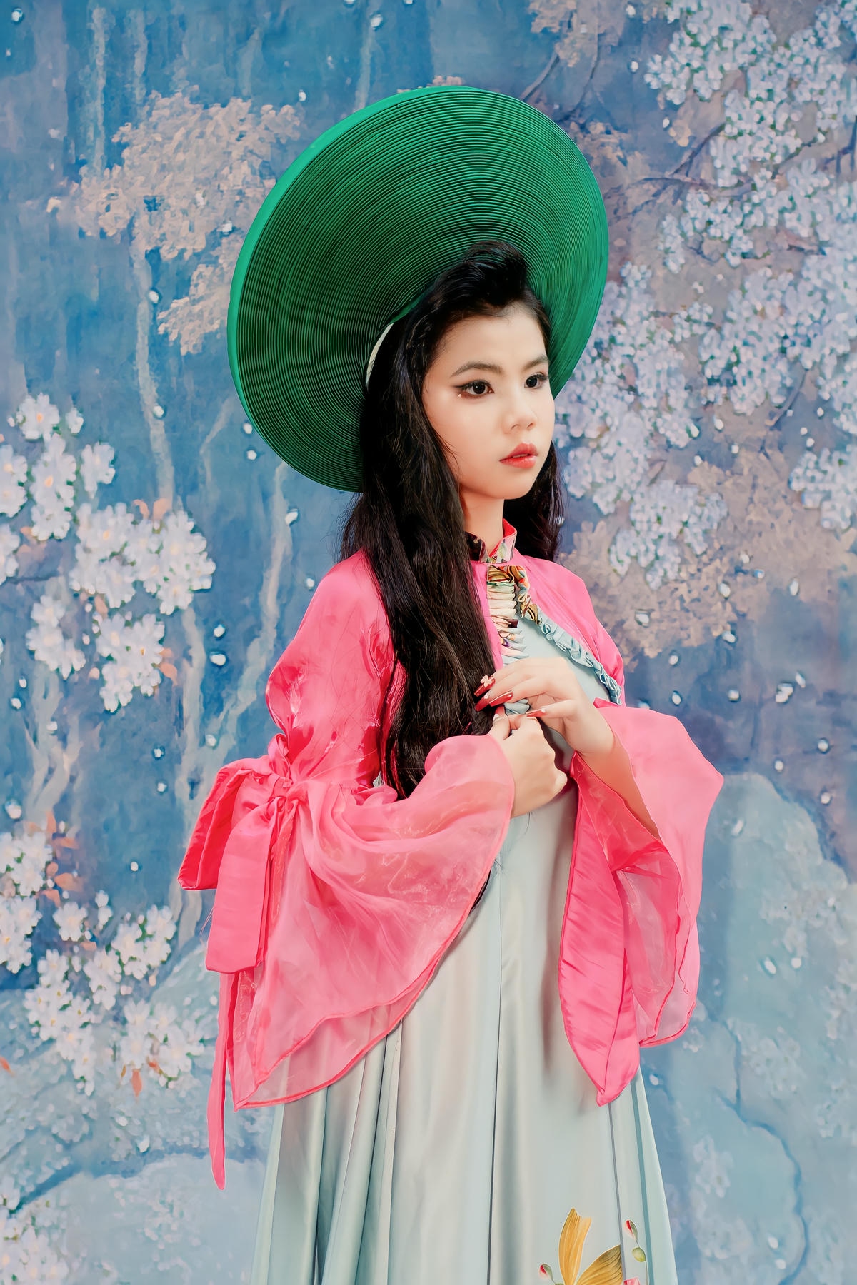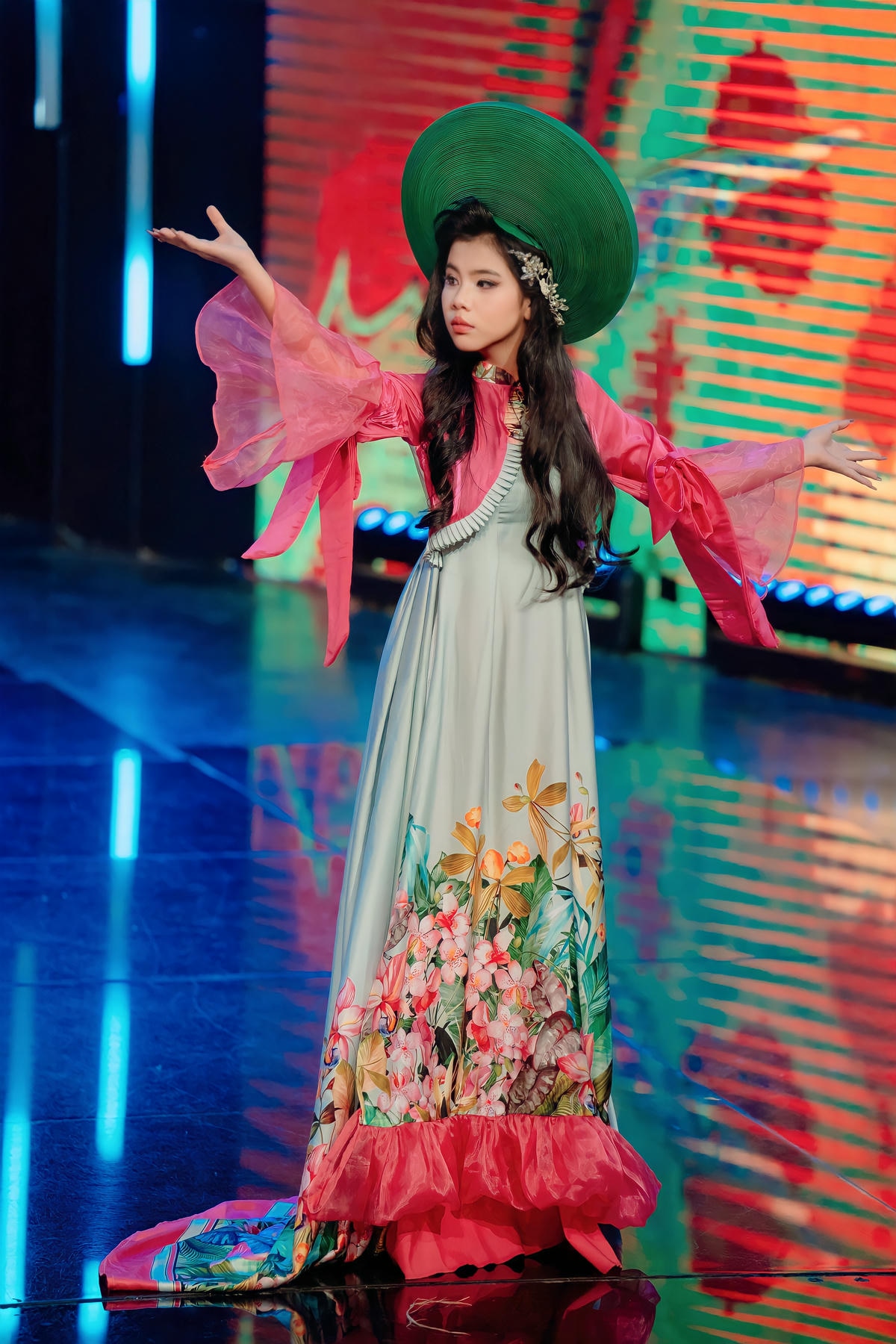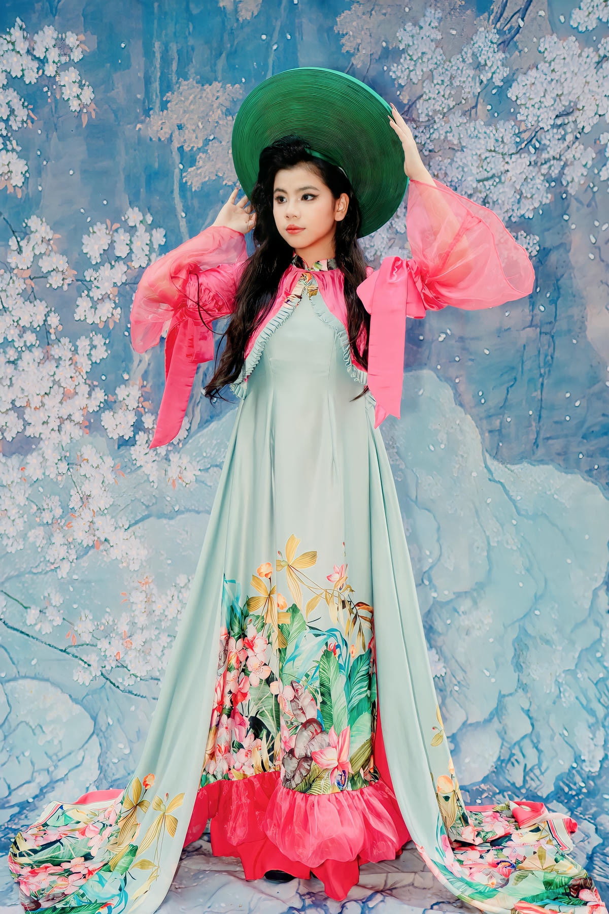 Phần tay áo phồng cách điệu bằng chất liệu voan hồng mỏng manh, bồng bềnh, cùng với tà áo dài thướt tha mang sắc hồng tươi tắn, tạo nên một hiệu ứng bay bổng, uyển chuyển trong mỗi bước đi của người mẫu. Điểm nhấn chính là sự kết hợp hài hòa của nhiều gam màu và chi tiết trang trí thủ công, từ những đường nét vẽ hoa tinh tế đến sự pha trộn chất liệu, tất cả đã thể hiện sự sáng tạo không giới hạn và tay nghề điêu luyện của nhà thiết kế Đinh Bách Đạt, biến chiếc áo dài truyền thống thành một tác phẩm nghệ thuật đương đại đầy mê hoặc.
