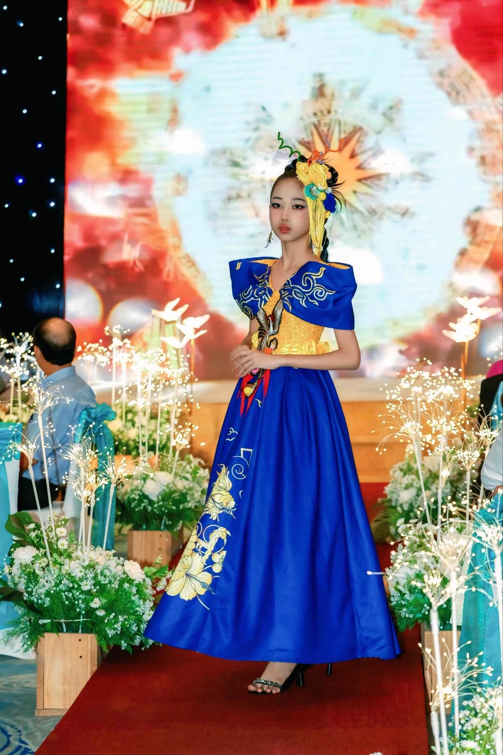 Hình 1:Kiều Vân tỏa sáng rực rỡ trên sàn diễn với thiết kế xanh hoàng tộc đầy kiêu hãnh