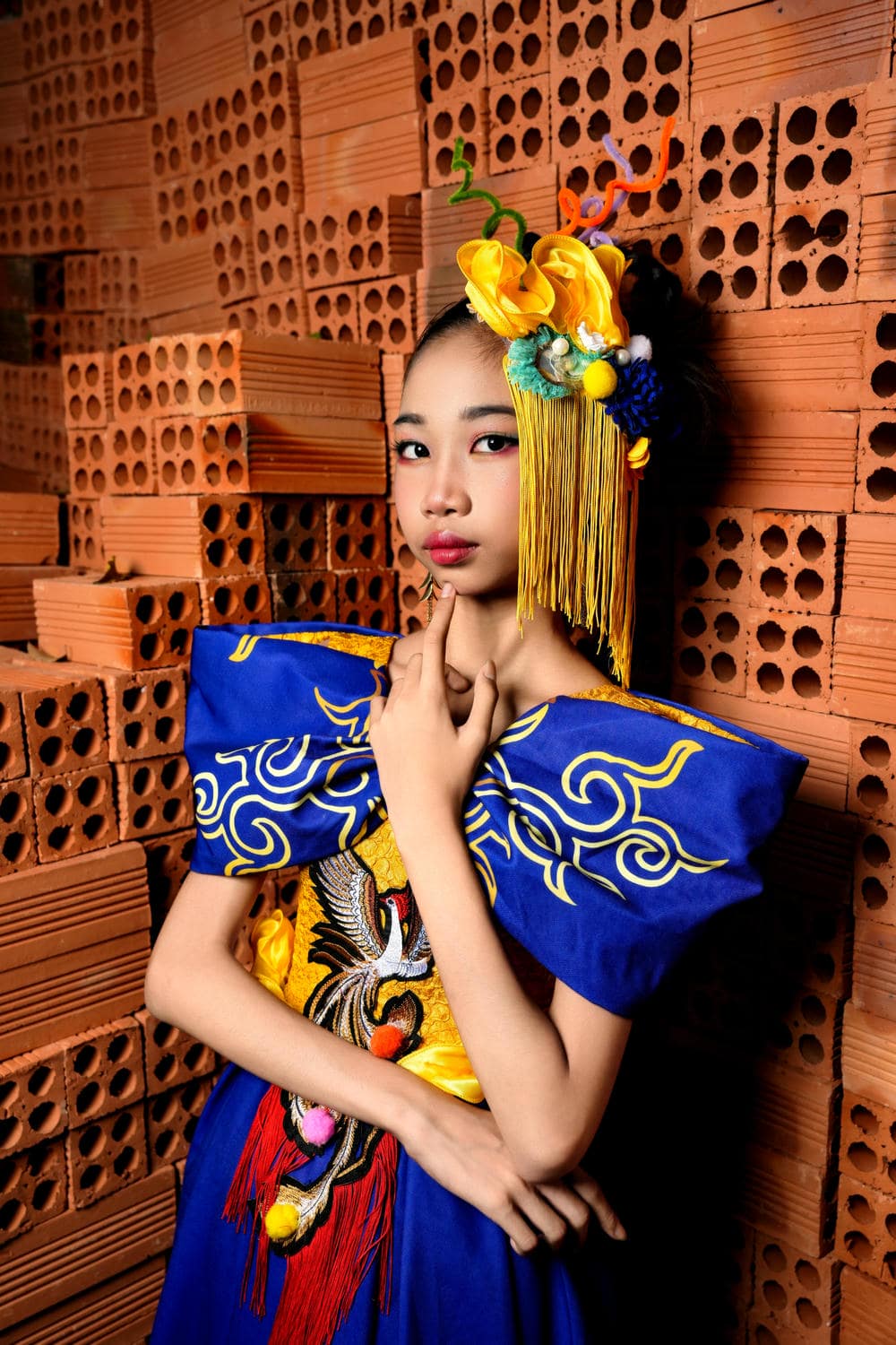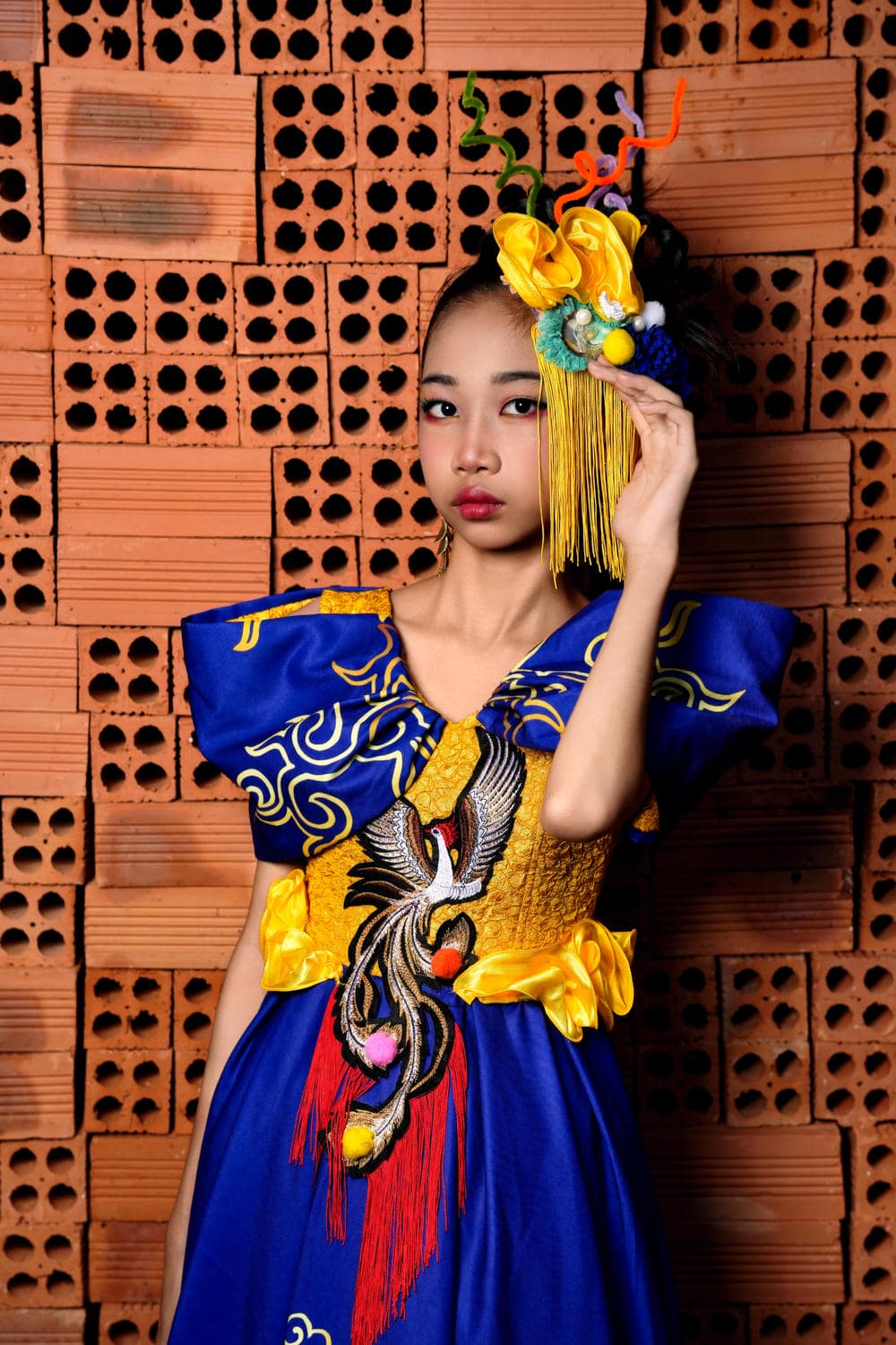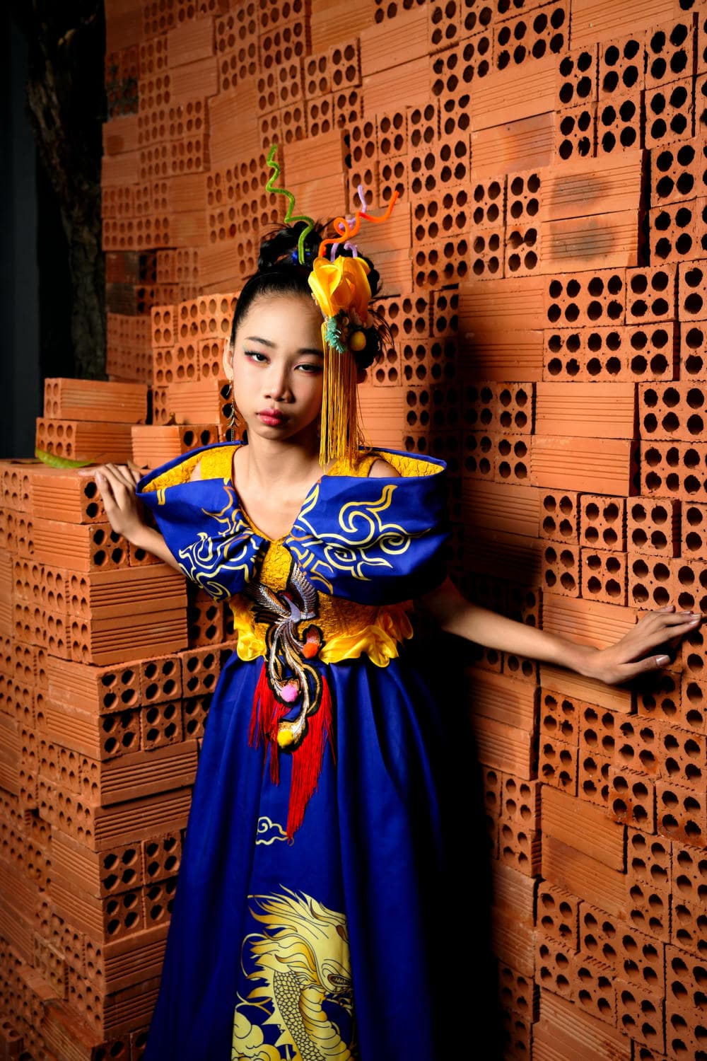 Bộ ảnh còn khai thác sự tương phản mạnh mẽ giữa sự hào nhoáng của trang phục và nét thô mộc của những viên gạch trần. Kiều Vân đã khéo léo sử dụng các động tác tay và ánh nhìn để tạo nên sự kết nối giữa hai thế giới đối lập này.