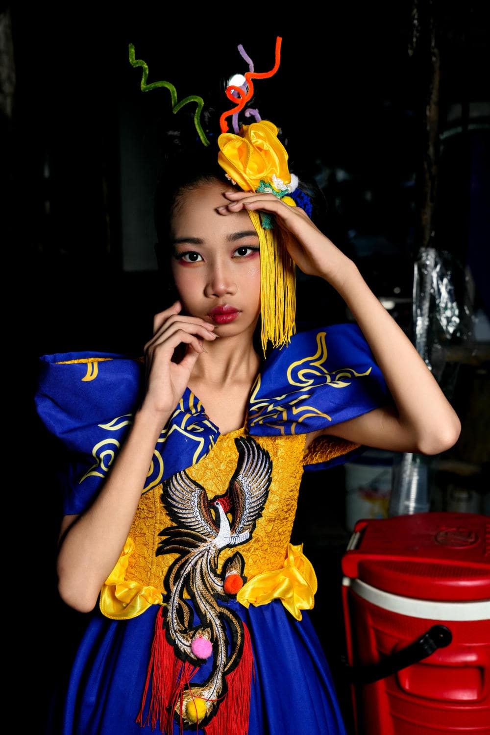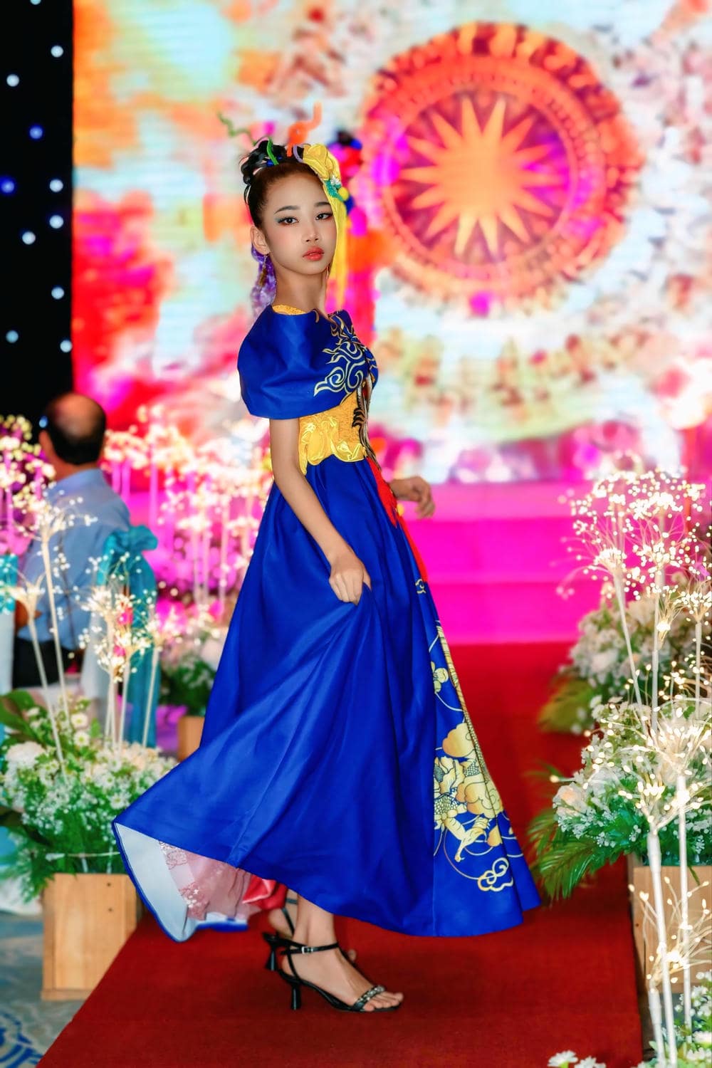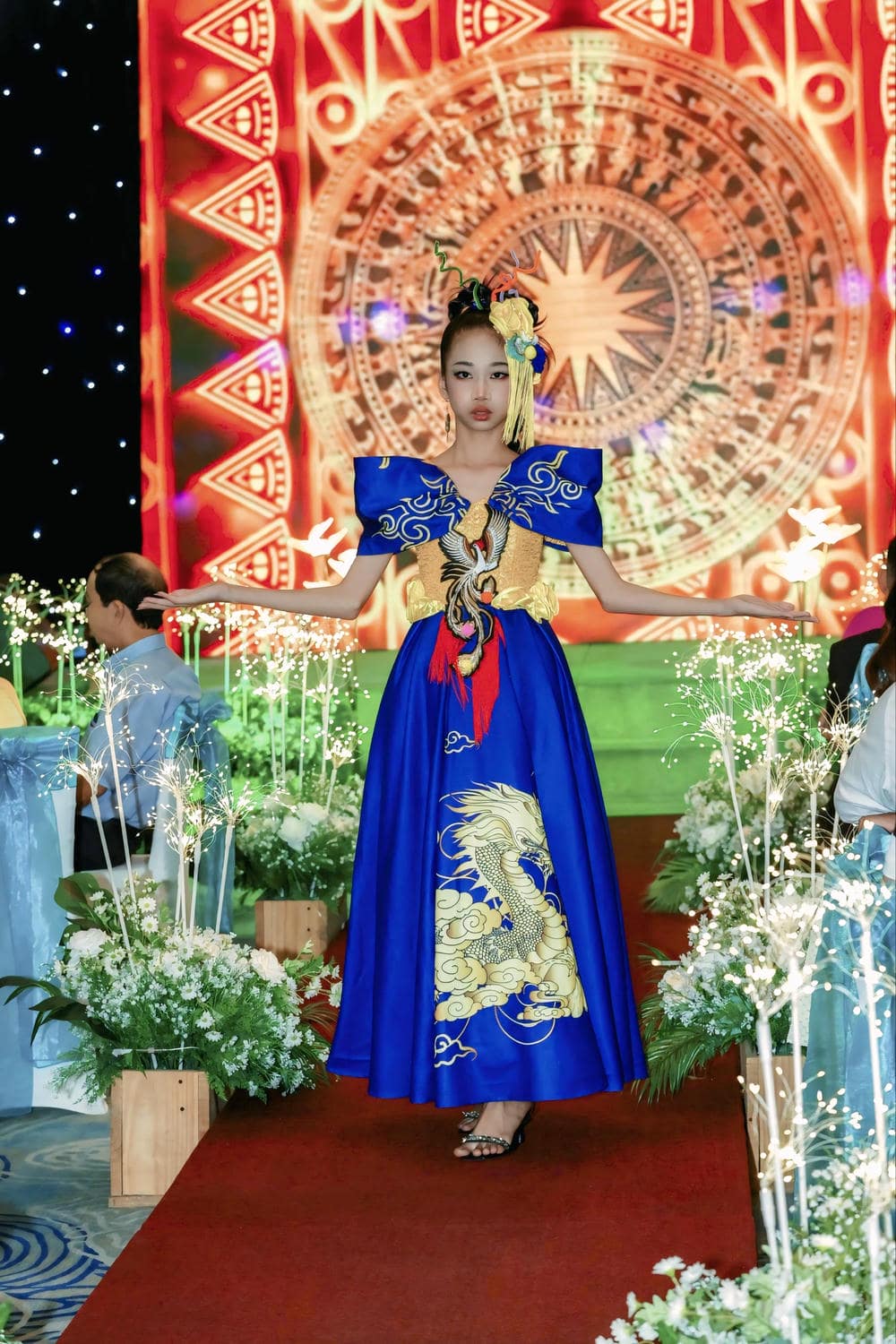 Trong lần xuất hiện này, Kiều Vân không chỉ đơn thuần là một người mẫu, cô bé đã thực sự trở thành một "Fashion Icon" khi làm chủ hoàn toàn bộ trang phục cầu kỳ. Thiết kế lấy tông xanh dương làm chủ đạo, kết hợp với các họa tiết rồng phượng thêu tay tỉ mỉ trên nền vải gấm vàng, tạo nên một sự tương phản đầy mê hoặc.
