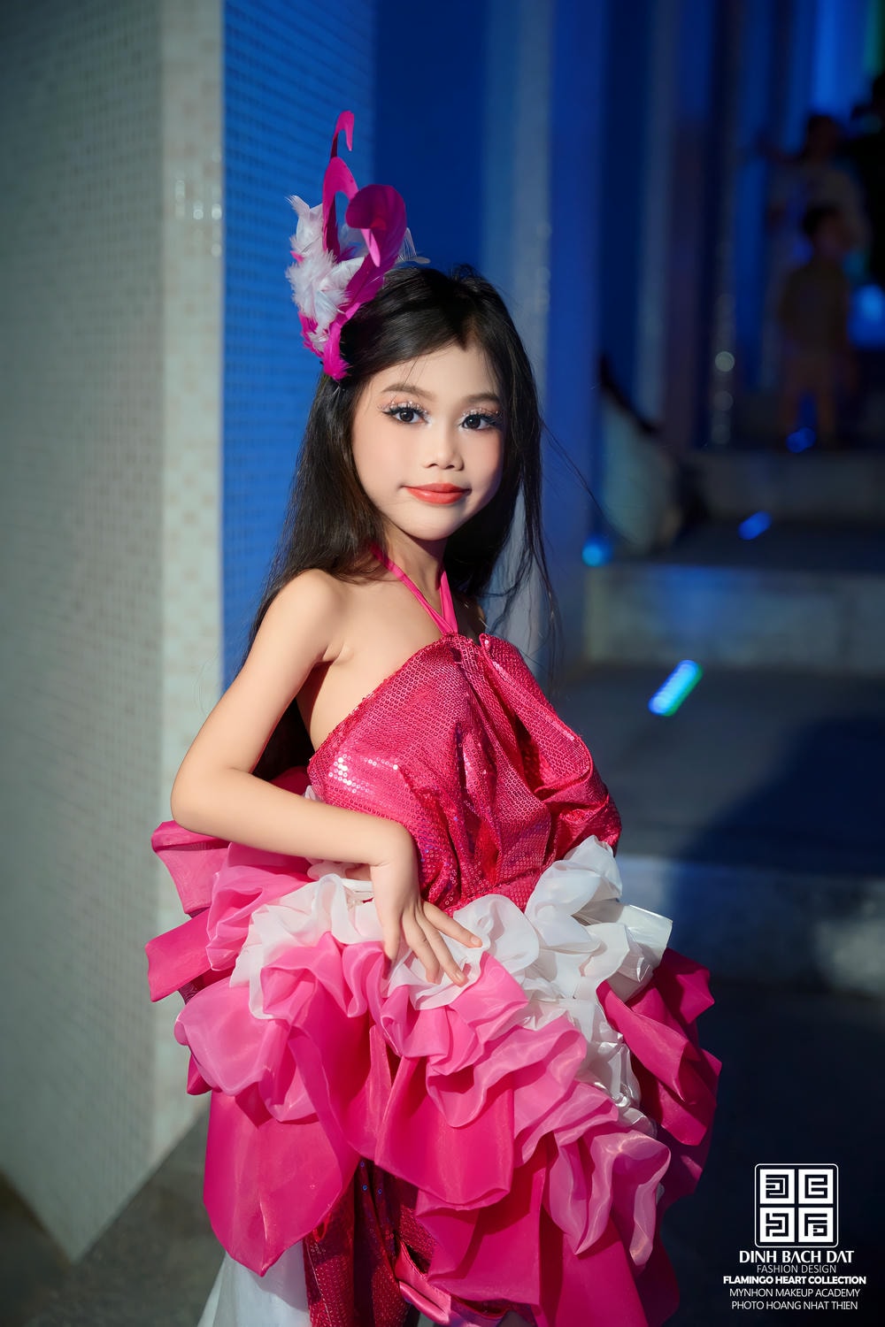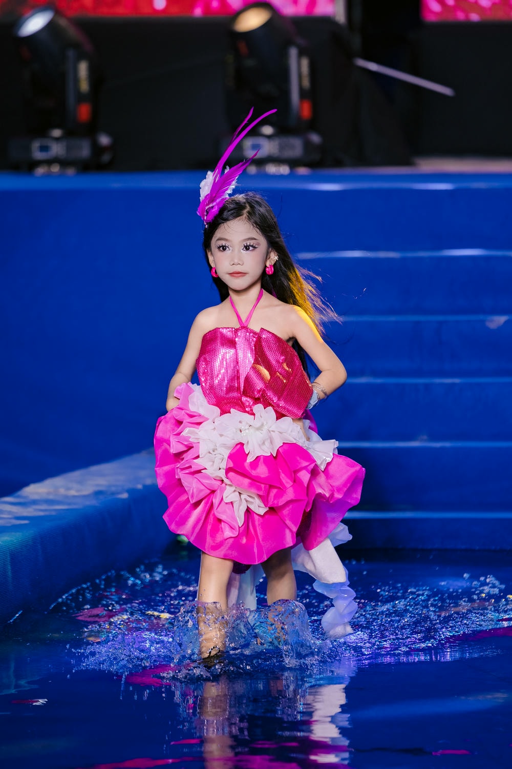 Mỗi bước chân của Kim Hiền trên mặt nước đều dứt khoát, tự tin, không một chút do dự. Cô bé giữ vững thần thái lạnh lùng, sắc sảo với ánh mắt kiên định, biểu cảm chuyên nghiệp và đôi môi hồng quyến rũ. Kim Hiền không chỉ trình diễn một bộ trang phục; cô bé đang kể một câu chuyện về sự kiêu hãnh, về tinh thần tự do và về khả năng biến hóa không giới hạn của một Fashion Icon thực thụ. Cô bé đã thổi hồn vào từng đường kim mũi chỉ, làm sống dậy thiết kế của NTK Đinh Bách Đạt, biến nó thành một màn trình diễn nghệ thuật đầy cảm xúc và khó quên.