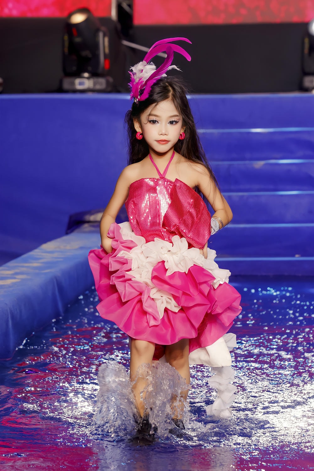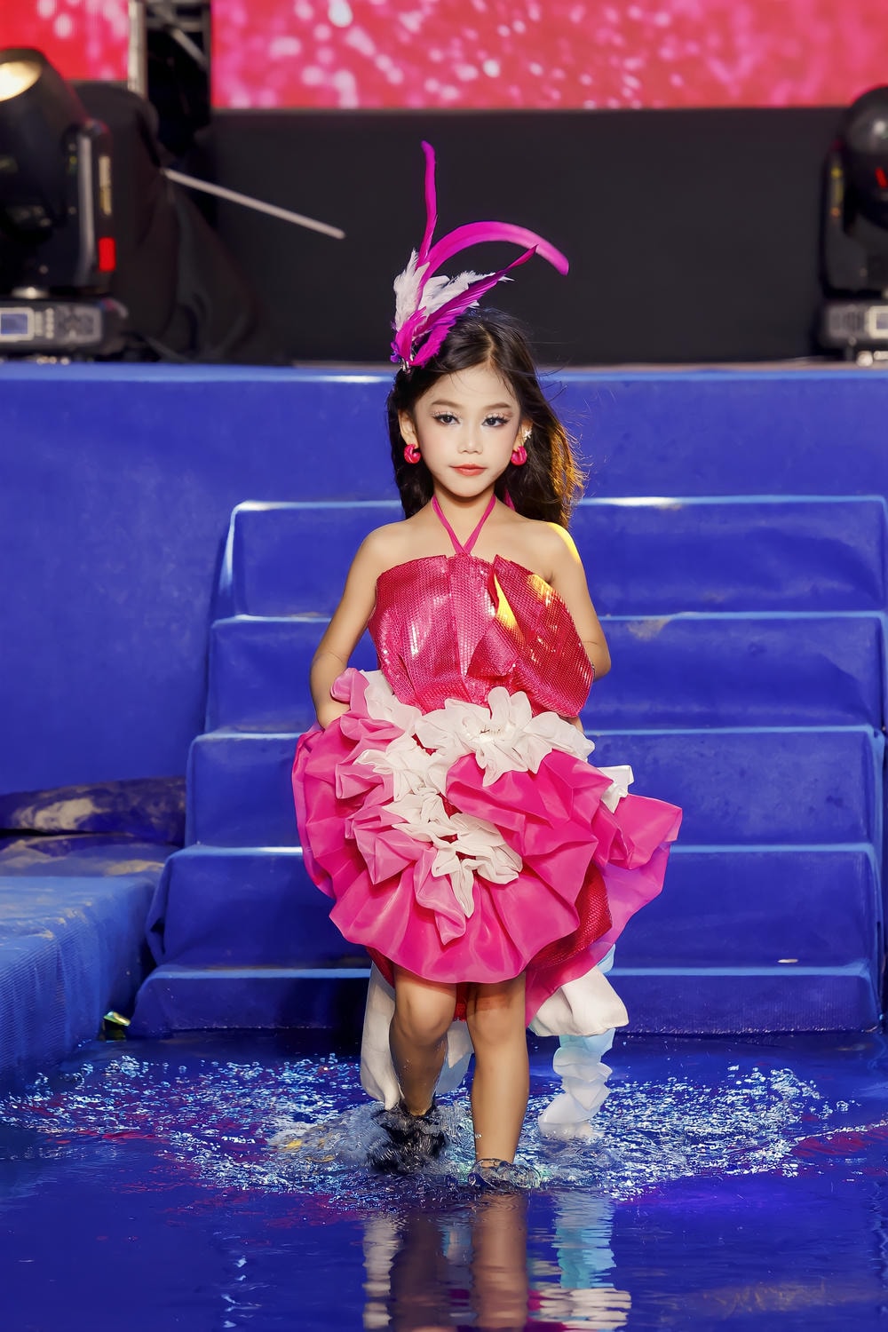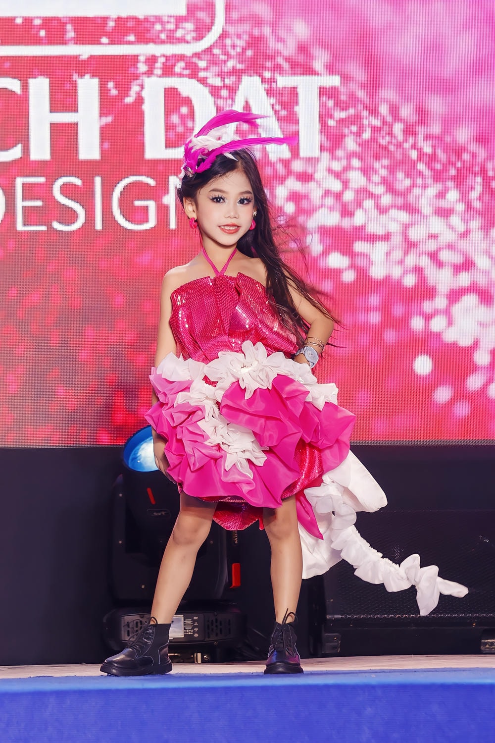 Tuy nhiên, điều thực sự làm Kim Hiền tỏa sáng không chỉ nằm ở bộ trang phục lộng lẫy mà còn ở phong thái trình diễn đỉnh cao của cô bé. Trên sàn diễn ngập nước – một bối cảnh đầy thử thách và cần sự khéo léo – Kim Hiền đã có màn thể hiện xuất sắc. Thay vì chọn những đôi giày sandal nhẹ nhàng, cô bé lại sải bước mạnh mẽ trên đôi bốt cao cổ màu đen cá tính. Sự kết hợp tưởng chừng đối lập này lại tạo nên một tuyên ngôn thời trang mạnh mẽ, phá vỡ mọi khuôn mẫu, khẳng định Kim Hiền không chỉ là một "công chúa" mặc đẹp mà còn là một Fashion Icon đầy bản lĩnh, không ngại thể hiện cá tính riêng.