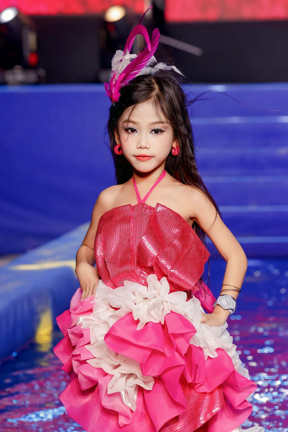 Để hoàn thiện tạo hình "Hồng Hạc cá tính", Kim Hiền được trang điểm một cách ấn tượng, đôi mắt được kẻ sắc sảo và đôi môi tô son hồng nổi bật, tạo nên vẻ ngoài mạnh mẽ và cuốn hút. Phụ kiện đi kèm là chiếc mũ cài đầu đính lông vũ màu hồng và trắng, cùng đôi hoa tai bản lớn và vòng tay cá tính, tất cả đều đồng điệu, góp phần khẳng định phong cách độc đáo của cô bé.