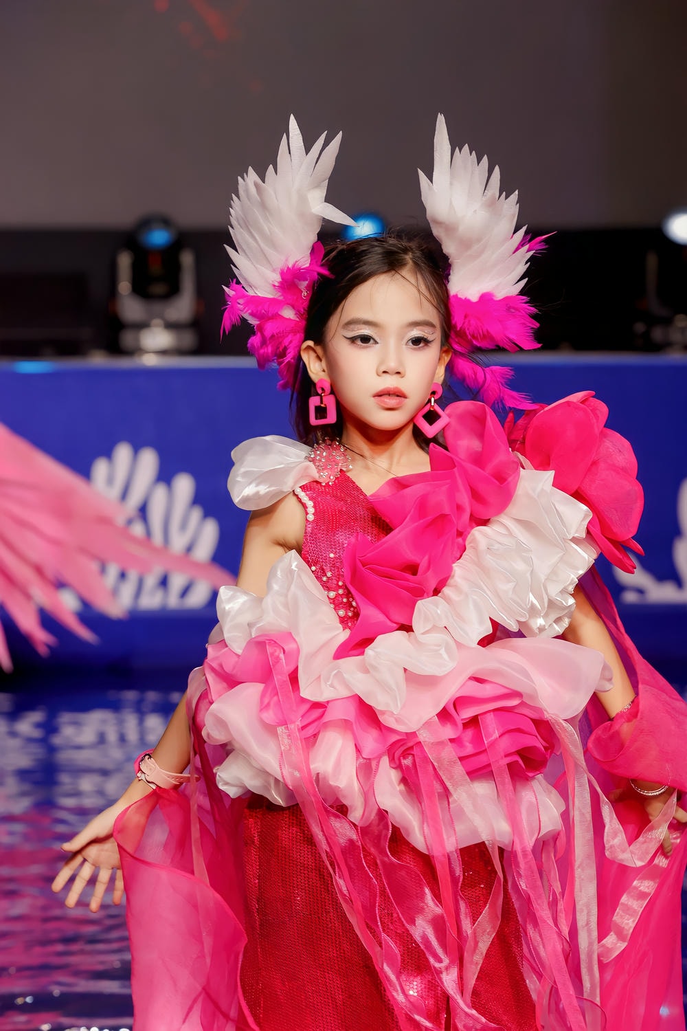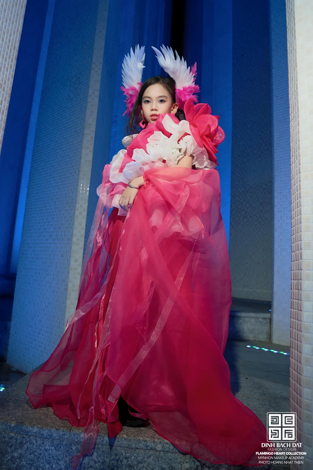 Trên sàn diễn đặc biệt ngập nước, nơi mỗi bước đi đều là một thách thức, Vedette Kim Hân đã thể hiện bản lĩnh sân khấu phi thường. Cô bé làm chủ hoàn toàn bộ trang phục phức tạp, điều khiển độ bồng bềnh và dài rộng của tà váy một cách duyên dáng. Phong thái kiêu sa, điềm tĩnh cùng những bước chân vững vàng đã khẳng định sự chuyên nghiệp và khí chất "vedette" của mình. Ánh mắt sâu lắng, biểu cảm tự tin nhưng vẫn giữ được nét thơ ngây đã truyền tải một thông điệp nghệ thuật sâu sắc: vẻ đẹp kiêu hãnh phải đi đôi với sự thuần khiết.