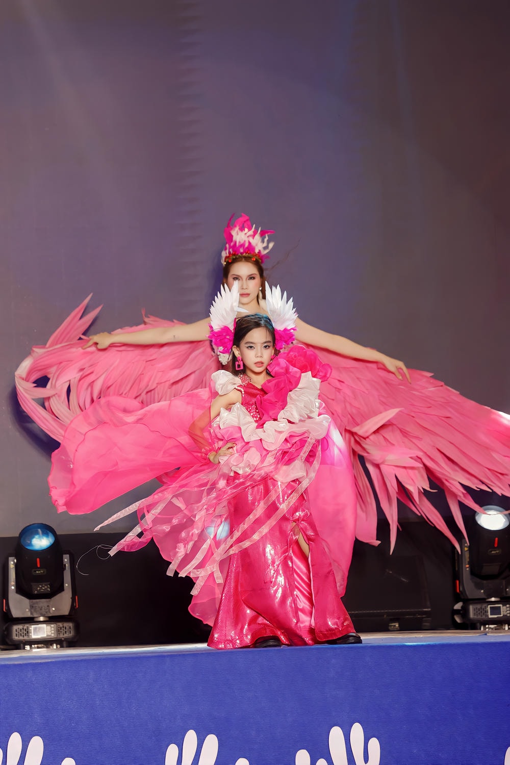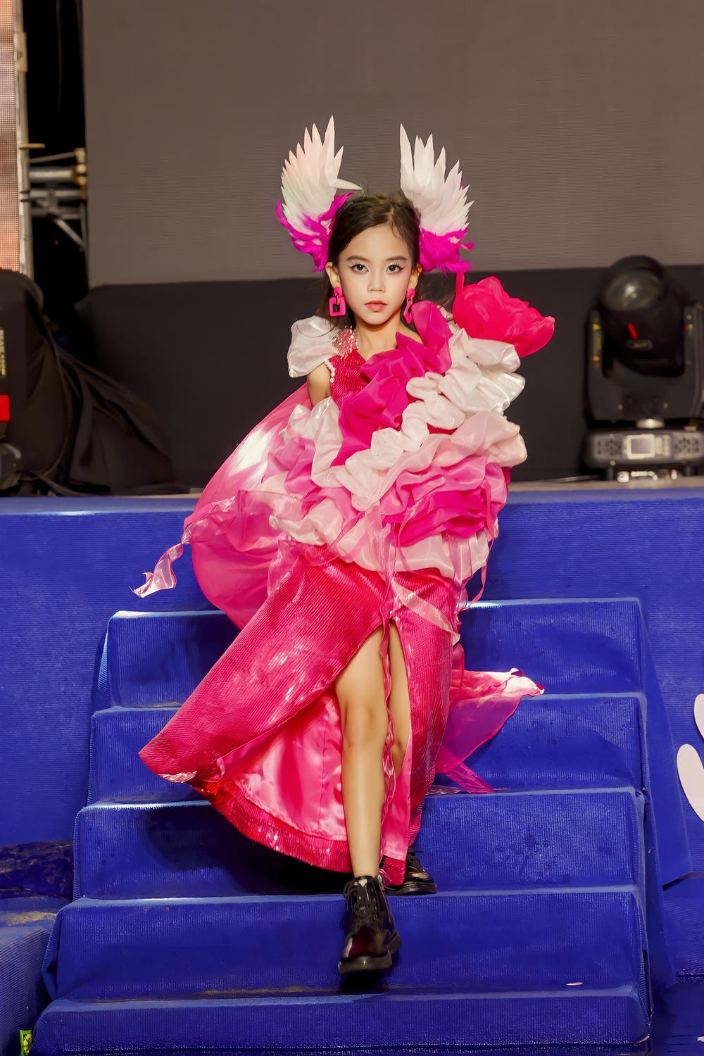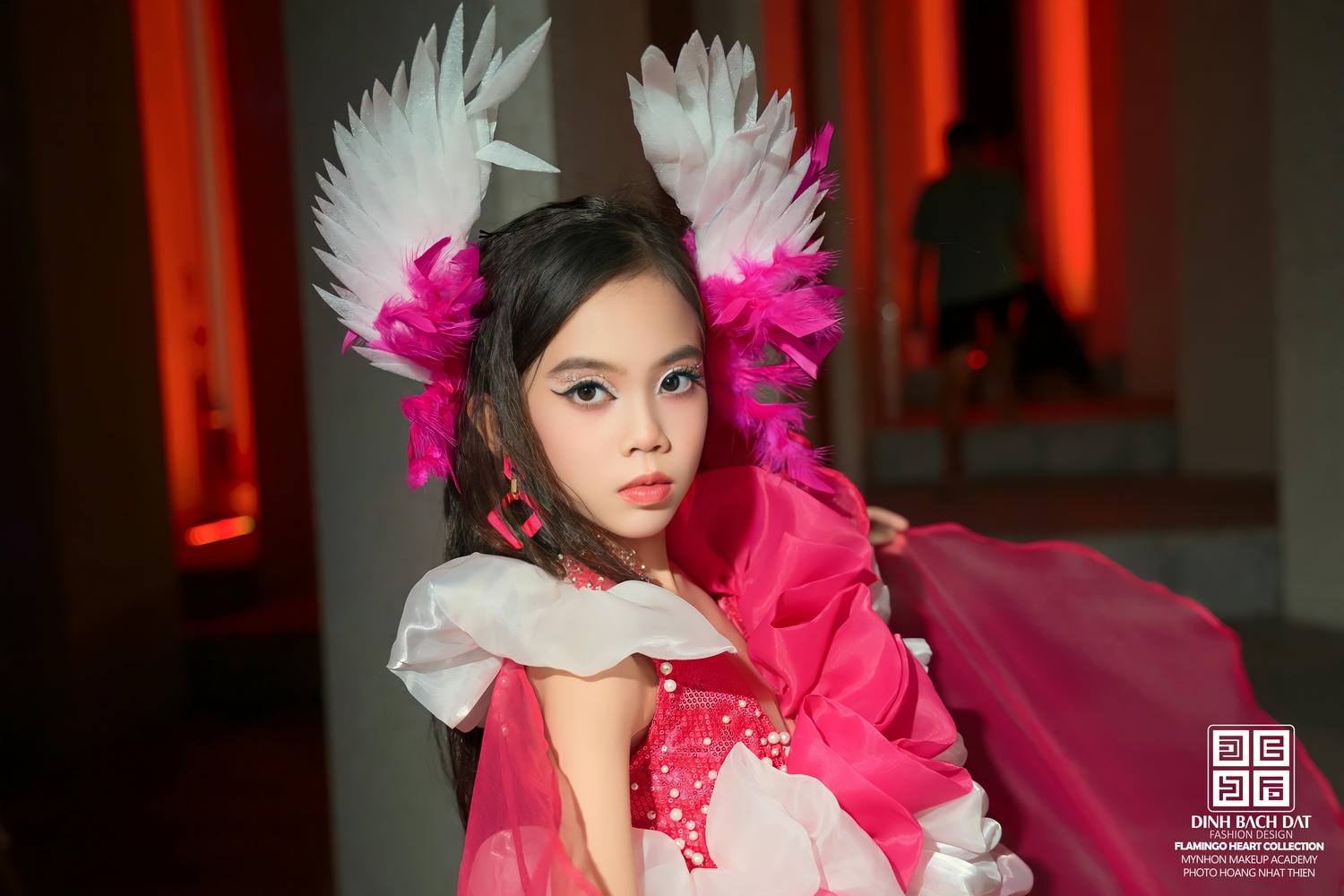Điểm nhấn làm nên sự độc nhất của thiết kế chính là khối hoa 3D ngoại cỡ được đính kết đối xứng ở vai và thân trên. Những khối hoa này không chỉ đơn thuần là chi tiết trang trí mà còn là sự mô phỏng nghệ thuật, đầy kịch tính về đôi cánh chim đang mở rộng, che chở và tôn vinh vẻ đẹp của người mặc. Sự kết hợp giữa thân váy dài thướt tha và khối hoa cầu kỳ đã tạo nên một cấu trúc trang phục vững chãi nhưng vẫn đầy chất thơ. Để hoàn thiện tạo hình thần thoại này, Kim Hân đội chiếc mũ cài đầu lớn đính lông vũ trắng và hồng, cùng với đôi hoa tai lấp lánh, tất cả cùng hòa quyện để tạo nên một hình ảnh Vedette không thể nào thay thế.