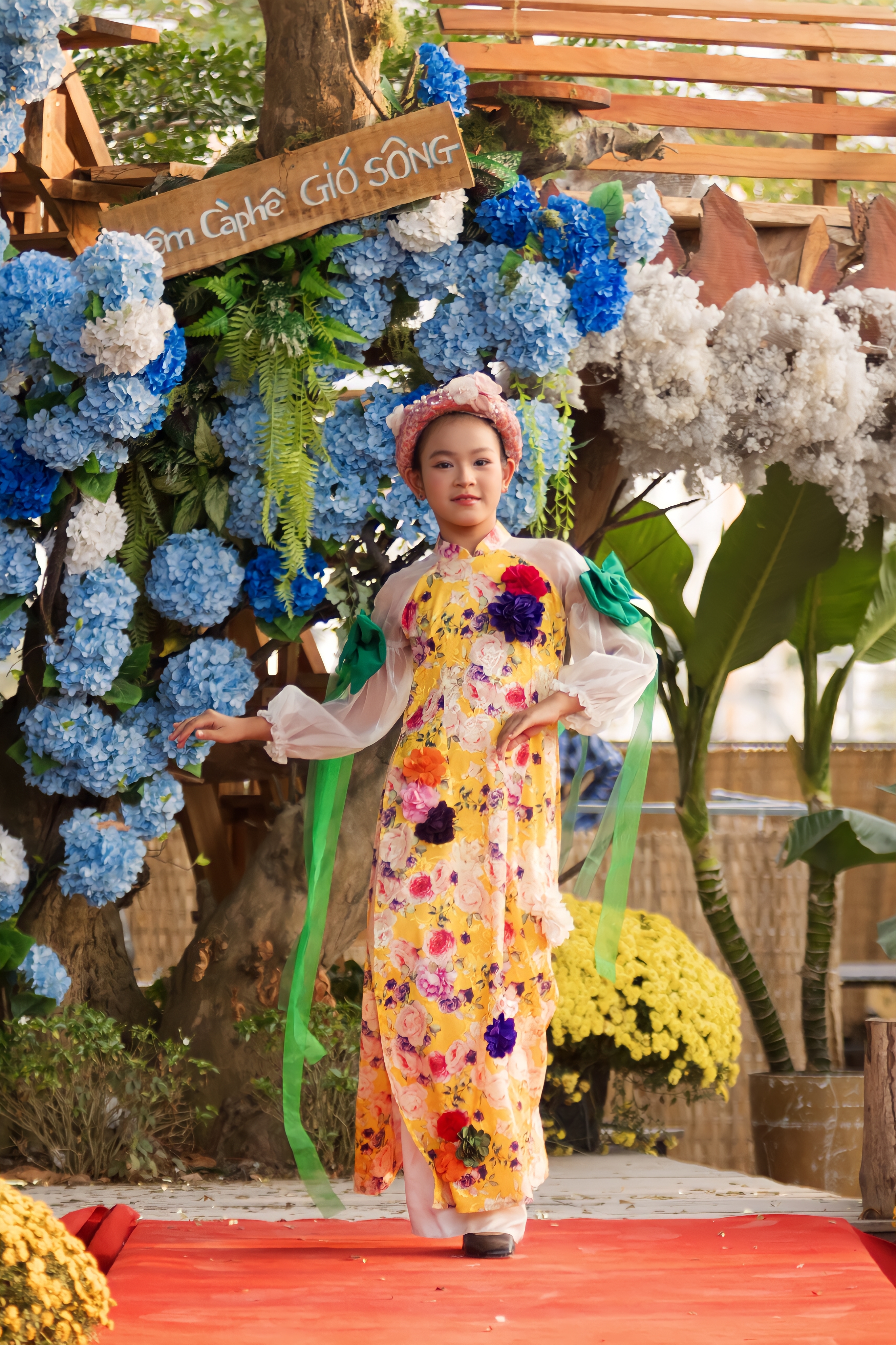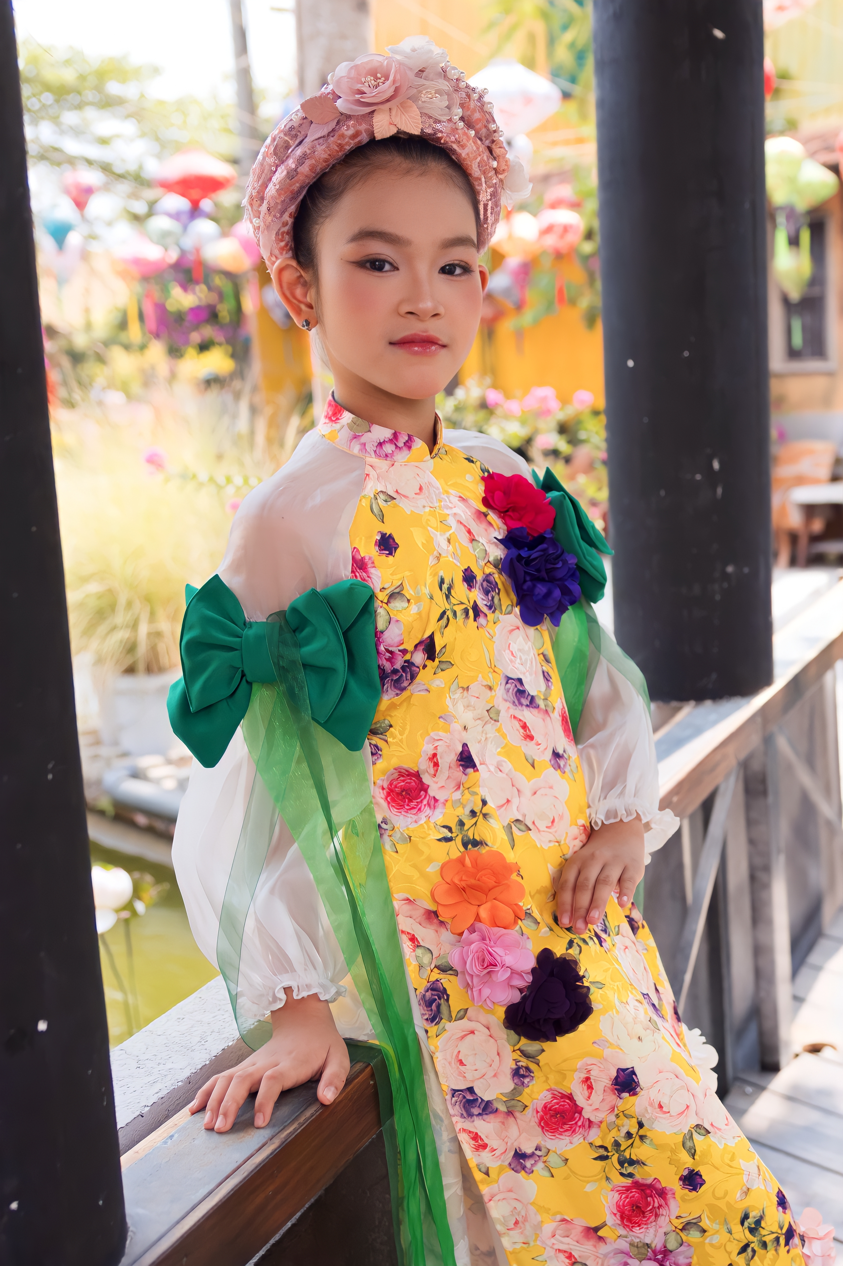 Trên nền vải vàng tươi tắn là những họa tiết hoa xuân 3D nở rộ, kết hợp cùng phần tay áo voan trắng bồng bềnh, tạo nên vẻ đẹp vừa truyền thống vừa hiện đại. Đặc biệt, chi tiết dải lụa xanh ngọc lục bảo thắt nơ lớn ở hai bên cánh tay không chỉ tạo điểm nhấn về màu sắc mà còn giúp từng bước đi, từng cái đánh tay của Bảo Anh trở nên uyển chuyển, thướt tha hơn bao giờ hết. Cô bé sải bước tự tin, làm chủ sân khấu với những cú xoay người điêu luyện, tái hiện trọn vẹn tinh thần "Họa Sắc" mà NTK muốn gửi gắm.