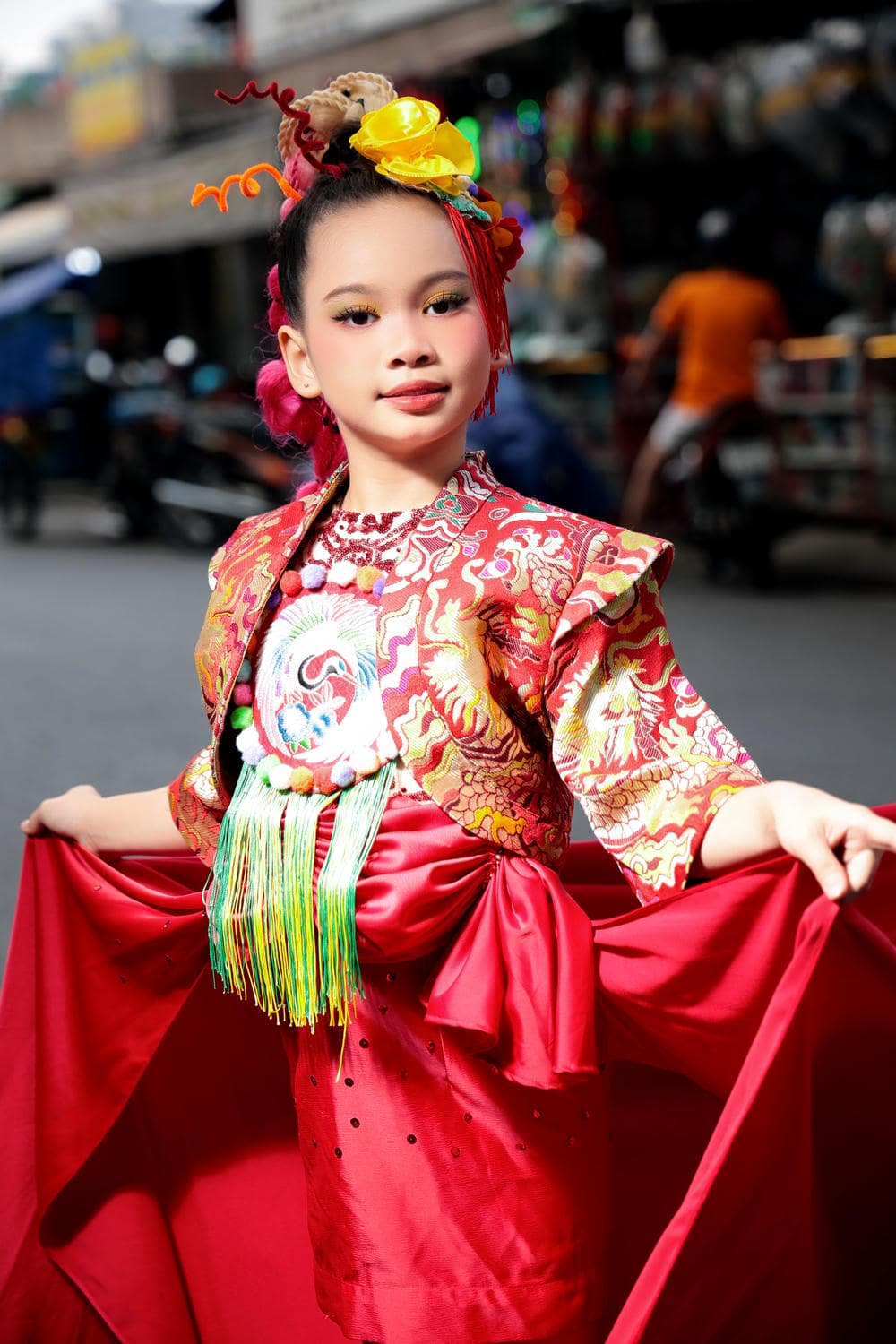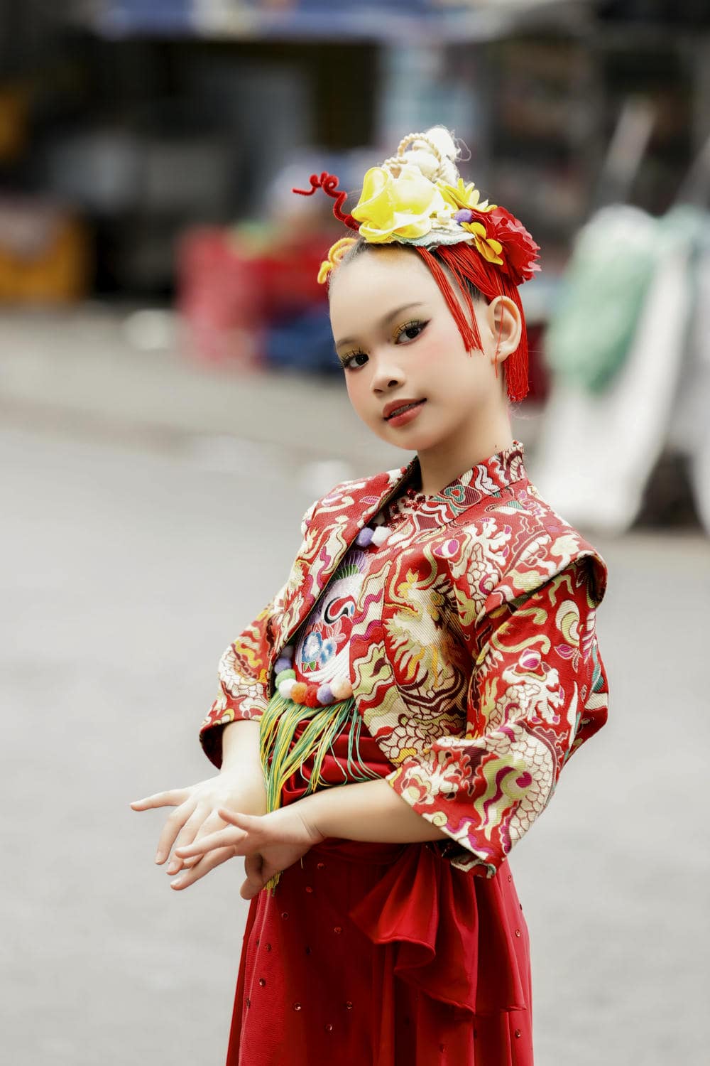 Họa tiết trên áo được thêu dệt kỳ công với hình ảnh rồng phượng cách tân, kết hợp cùng phần tua rua ngũ sắc và điểm nhấn hoa vàng trên mấn đội đầu. Sự kết hợp này tạo nên một tổng thể vừa mang đậm hơi thở di sản, vừa phảng phất nét High-fashion hiện đại.