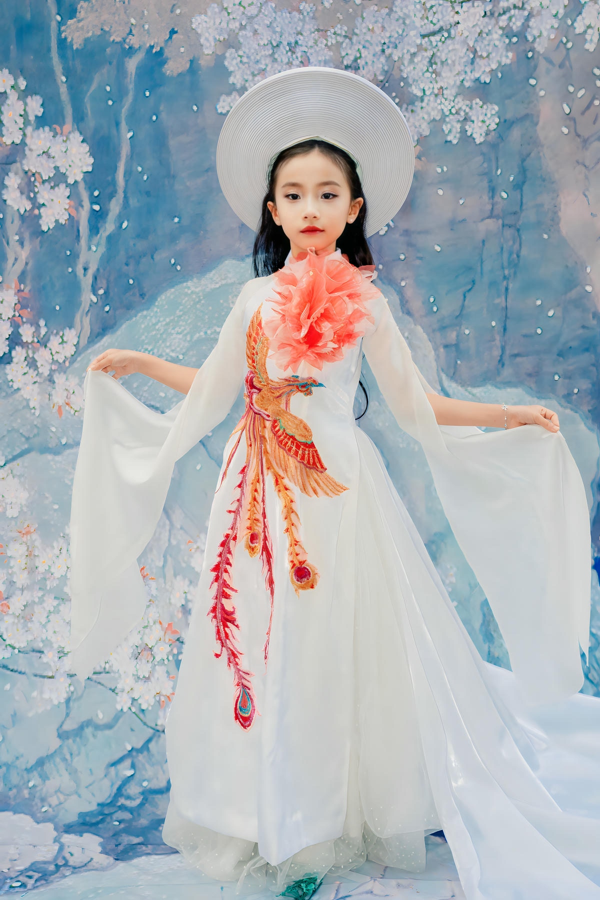 Trong BST Thanh Thu Cẩm Y của NTK ĐInh Bách Đạt, Dương Ngọc Tuệ Cát khoác lên mình chiếc áo dài trắng tinh khôi, biểu tượng của sự thuần khiết. Điểm nhấn là hình ảnh phượng hoàng cách điệu được thêu thùa tỉ mỉ, trải dài từ ngực áo xuống tà, với tông màu cam đỏ rực rỡ, tượng trưng cho sự may mắn và thịnh vượng. Chiếc nón lá truyền thống màu trắng không chỉ là phụ kiện mà còn tôn lên nét đẹp Á Đông duyên dáng của Tuệ Cát.