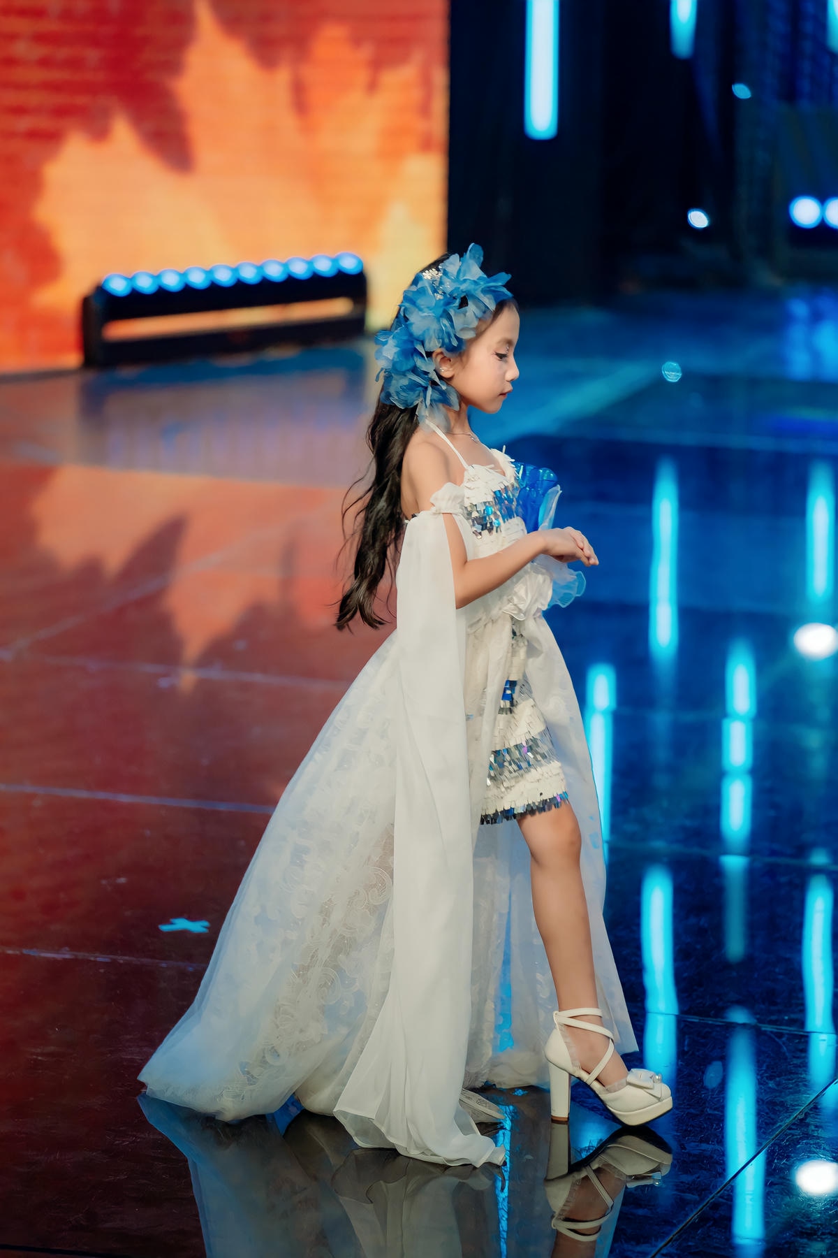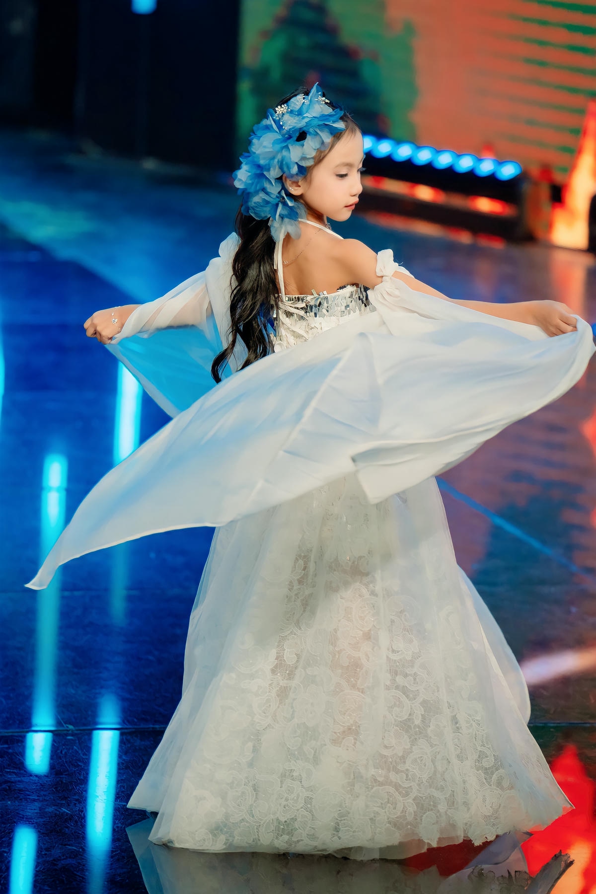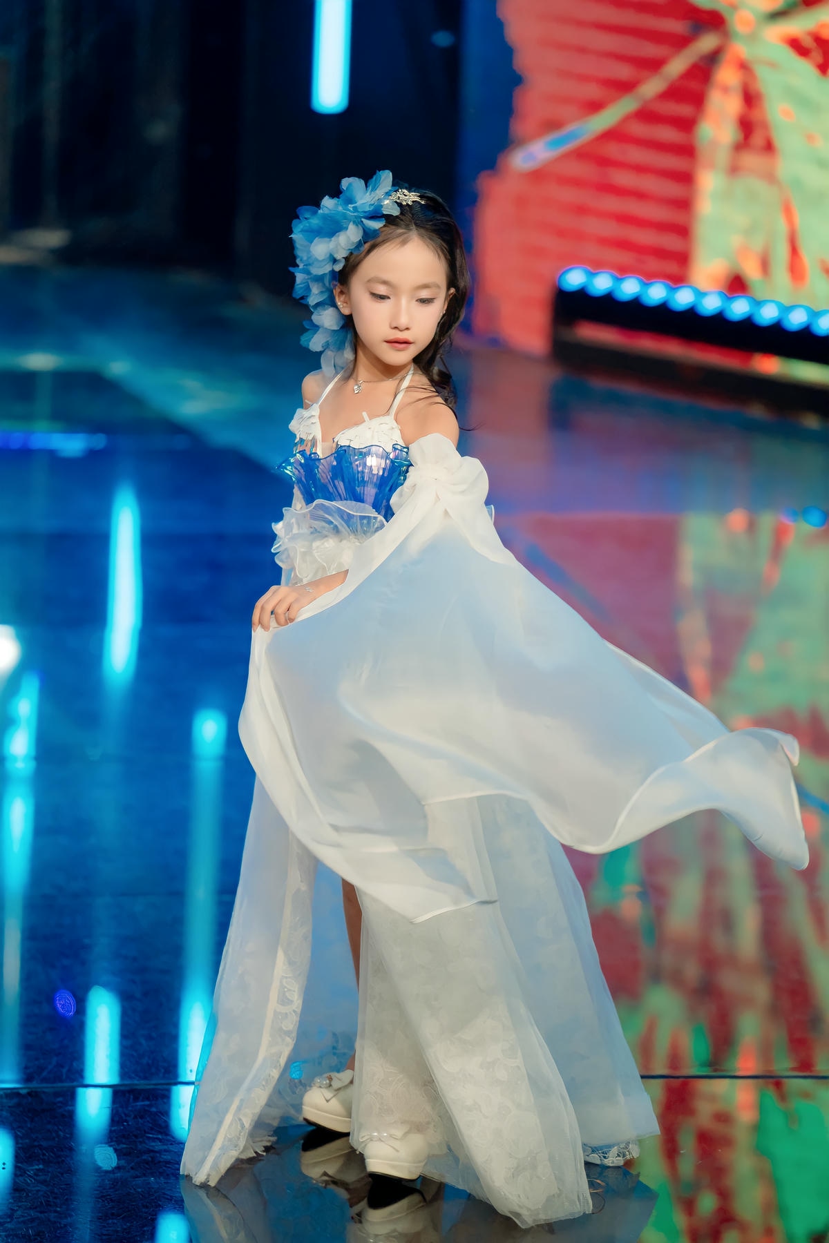 Khi ánh đèn sàn diễn bừng sáng, Tuệ Cát đã hoàn toàn lột xác, hóa thân thành một hình ảnh hoàn toàn khác biệt. Trong bức ảnh chụp trên sàn runway, cô bé trình diễn một bộ trang phục bay bổng và lộng lẫy, khác hẳn với vẻ áo dài truyền thống ở hậu trường. Chiếc váy màu trắng tinh khôi kết hợp với phần thân áo được trang trí bằng các chi tiết màu xanh da trời, tạo nên một tổng thể vừa tinh tế vừa nổi bật, gợi nhớ đến hình ảnh những đám mây hoặc sóng biển.
