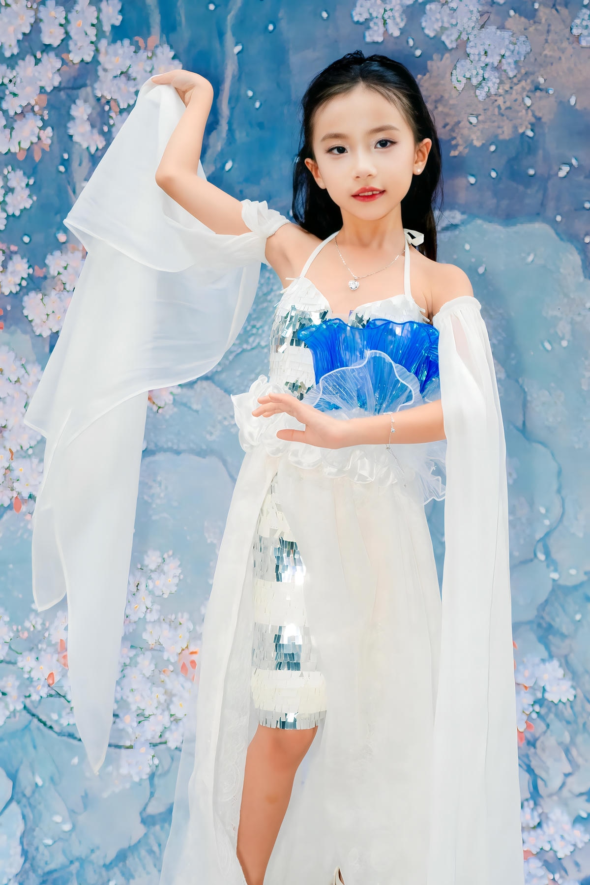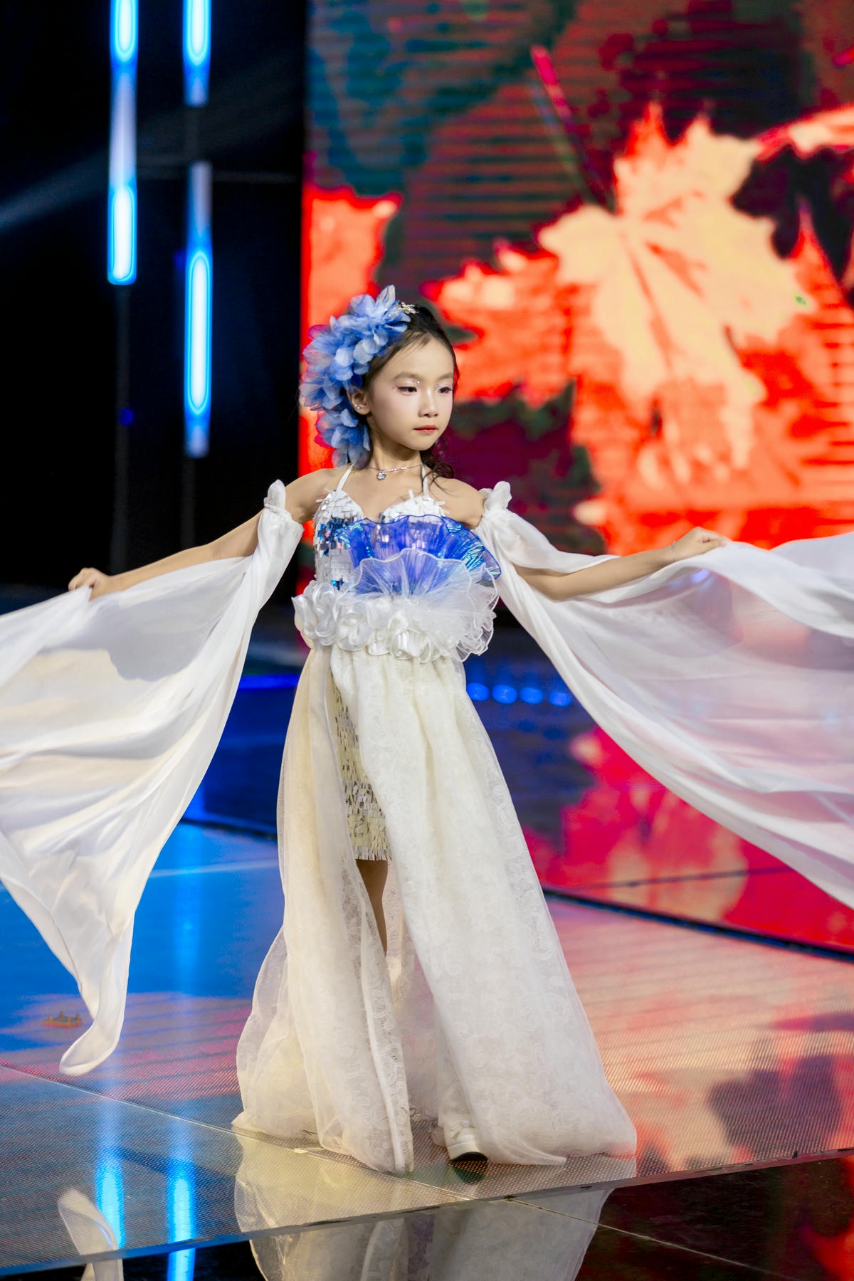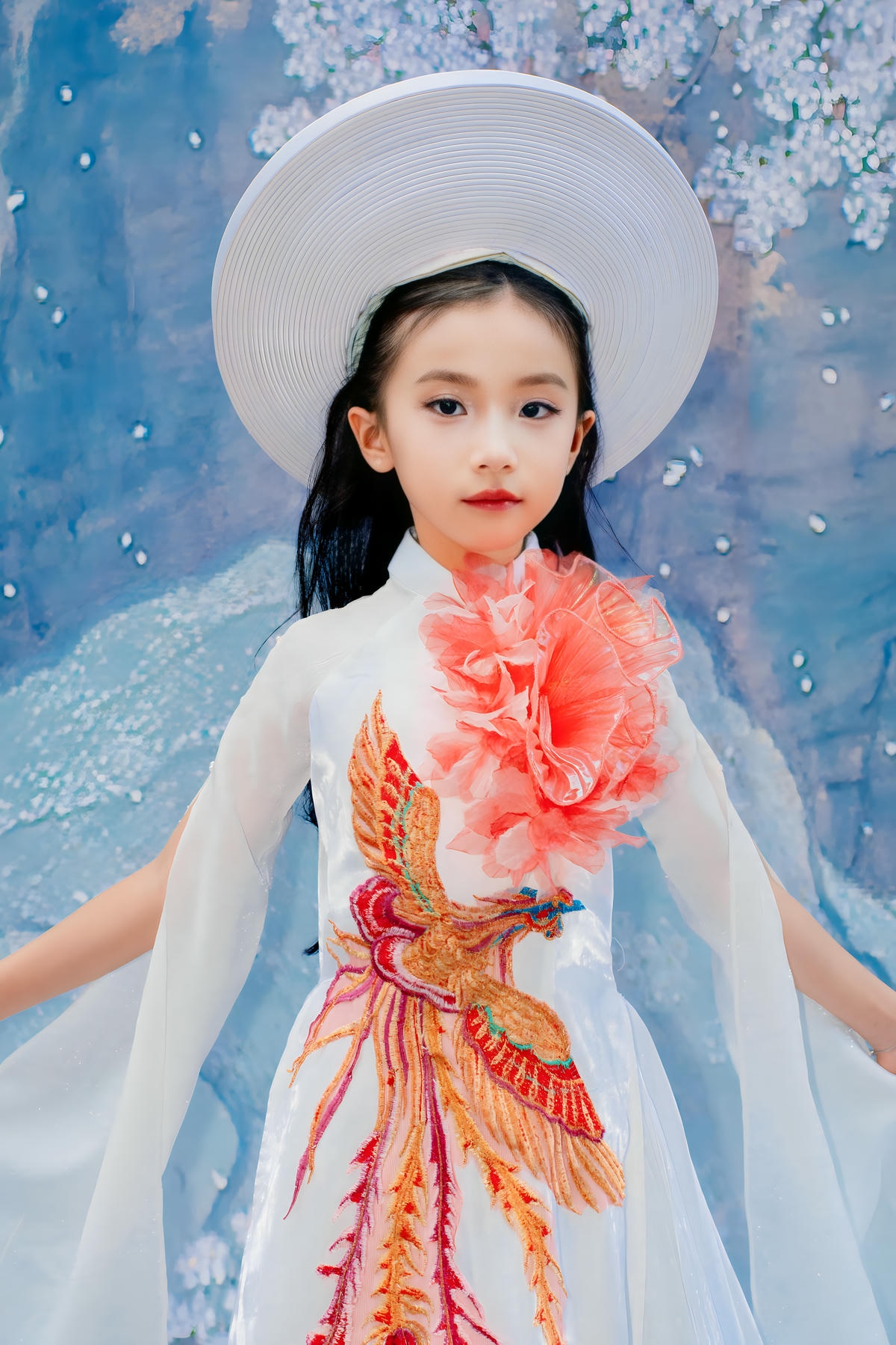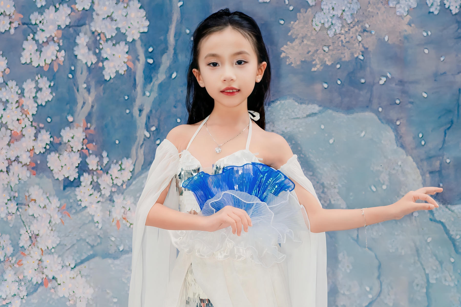 Khi ánh đèn sàn diễn bừng sáng, Tuệ Cát đã hoàn toàn lột xác, hóa thân thành một hình ảnh hoàn toàn khác biệt. Trong bức ảnh chụp trên sàn runway, cô bé trình diễn một bộ trang phục bay bổng và lộng lẫy, khác hẳn với vẻ áo dài truyền thống ở hậu trường. Chiếc váy màu trắng tinh khôi kết hợp với phần thân áo được trang trí bằng các chi tiết màu xanh da trời, tạo nên một tổng thể vừa tinh tế vừa nổi bật, gợi nhớ đến hình ảnh những đám mây hoặc sóng biển.