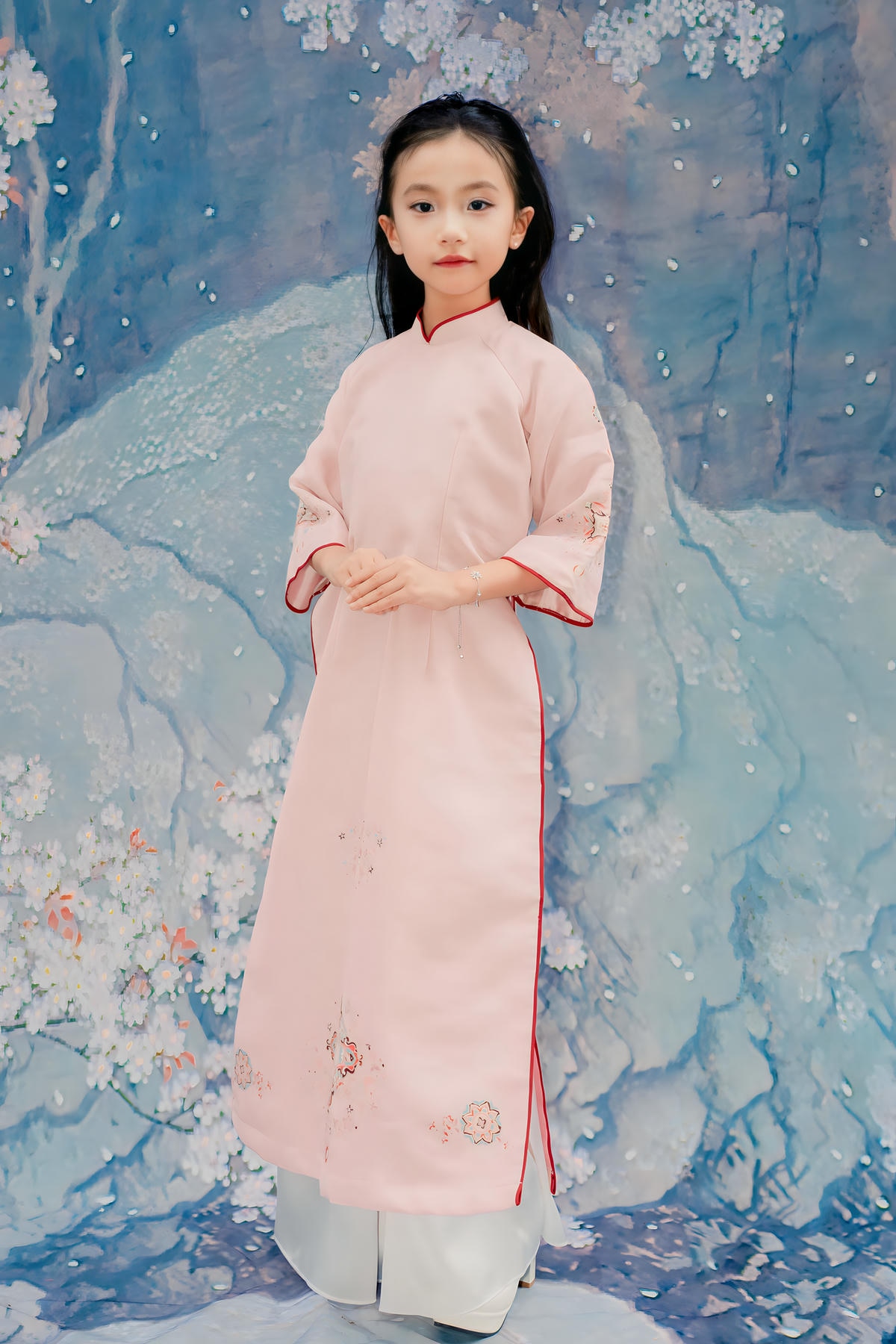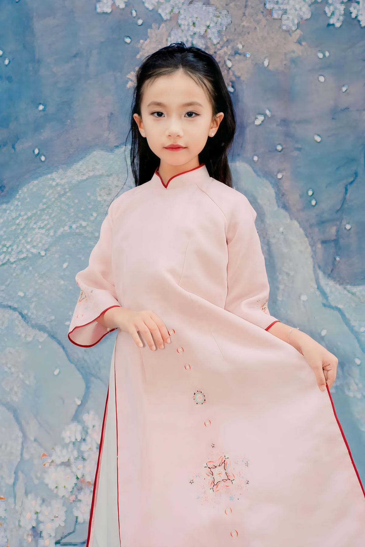 Tiếp đó, trong một thiết kế áo dài khác, Tuệ Cát diện trang phục màu hồng pastel nhẹ nhàng, với họa tiết thêu chìm tinh xảo trên thân áo, gợi lên vẻ đẹp cổ điển và nền nã. Phong thái của Tuệ Cát trong những khoảnh khắc hậu trường này tựa như một đóa hoa chớm nở, e ấp nhưng đầy sức sống, mang đến cảm giác bình yên và thanh khiết cho người xem.