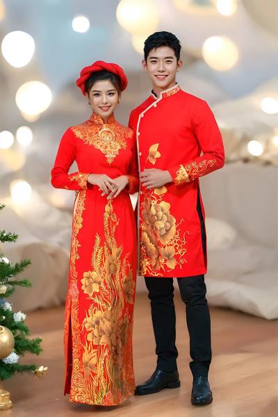 ÁO DÀI CẶP ĐÔI HOA SEN VÀNG