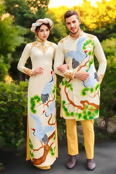 ÁO DÀI ĐÔI CHIM SẾU ĐẬU CÂY TÙNG