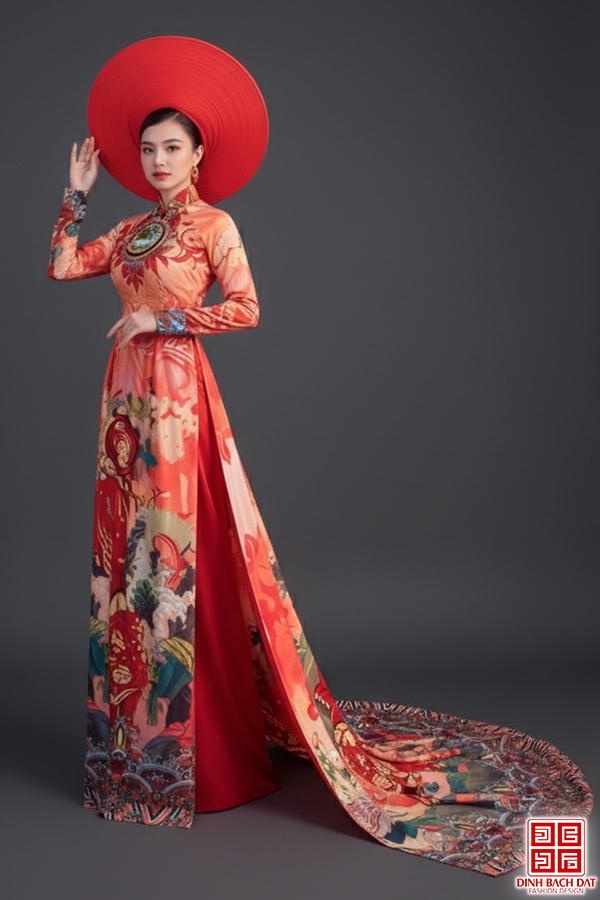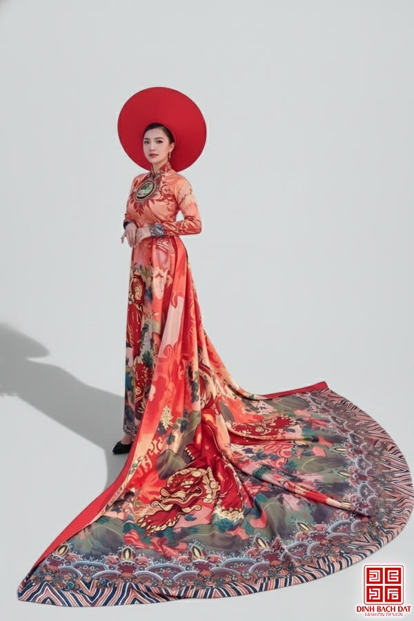 ÁO DÀI HỌA TIẾT HOA ĐUÔI CÔNG XÒE