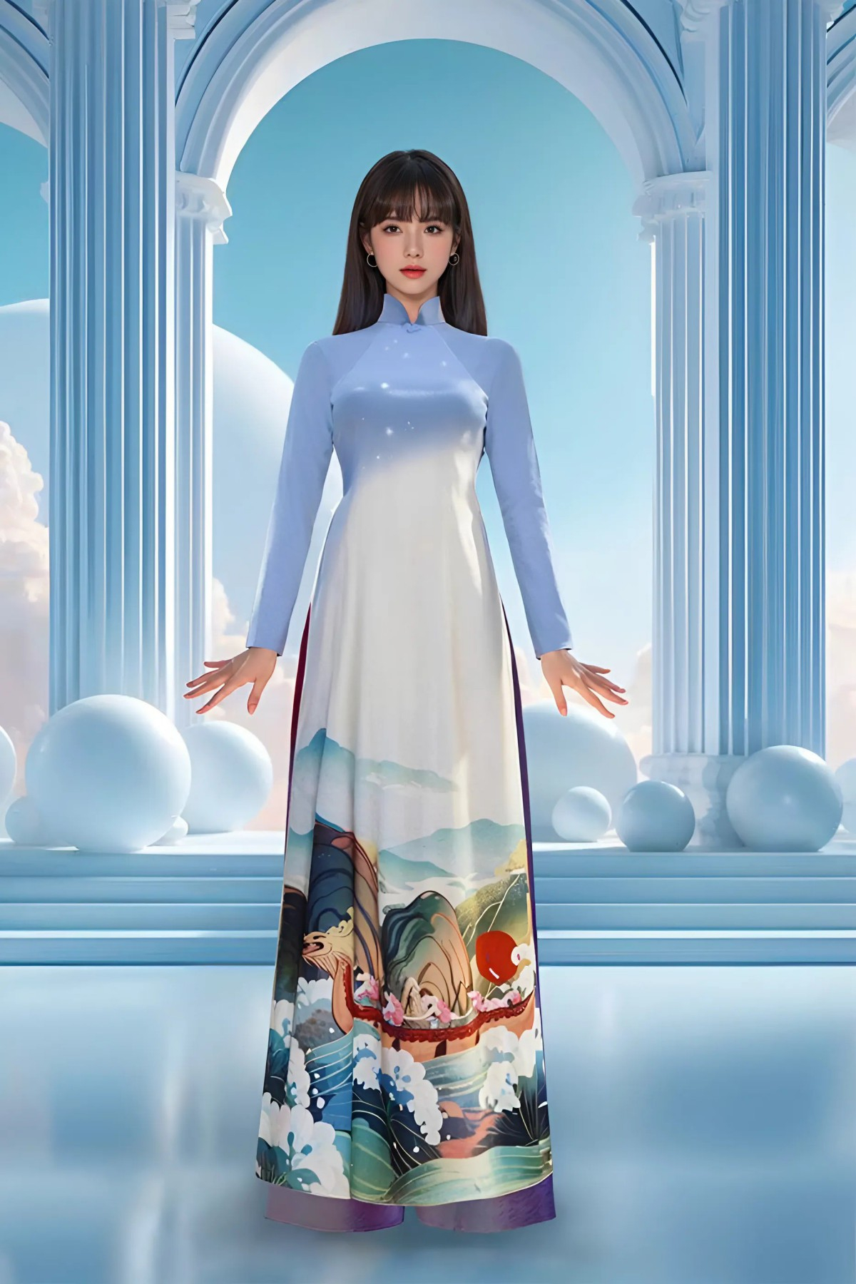 ÁO DÀI LỤA IN HÌNH THUYỀN
