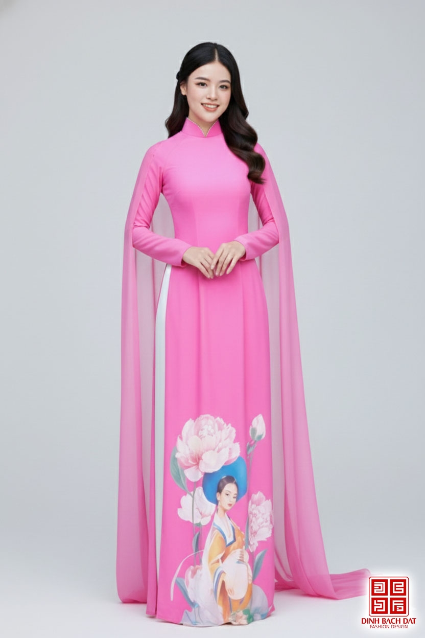 ÁO DÀI TRÌNH DIỄN IN HÌNH CÔ GÁI VÀ HOA MẪU ĐƠN