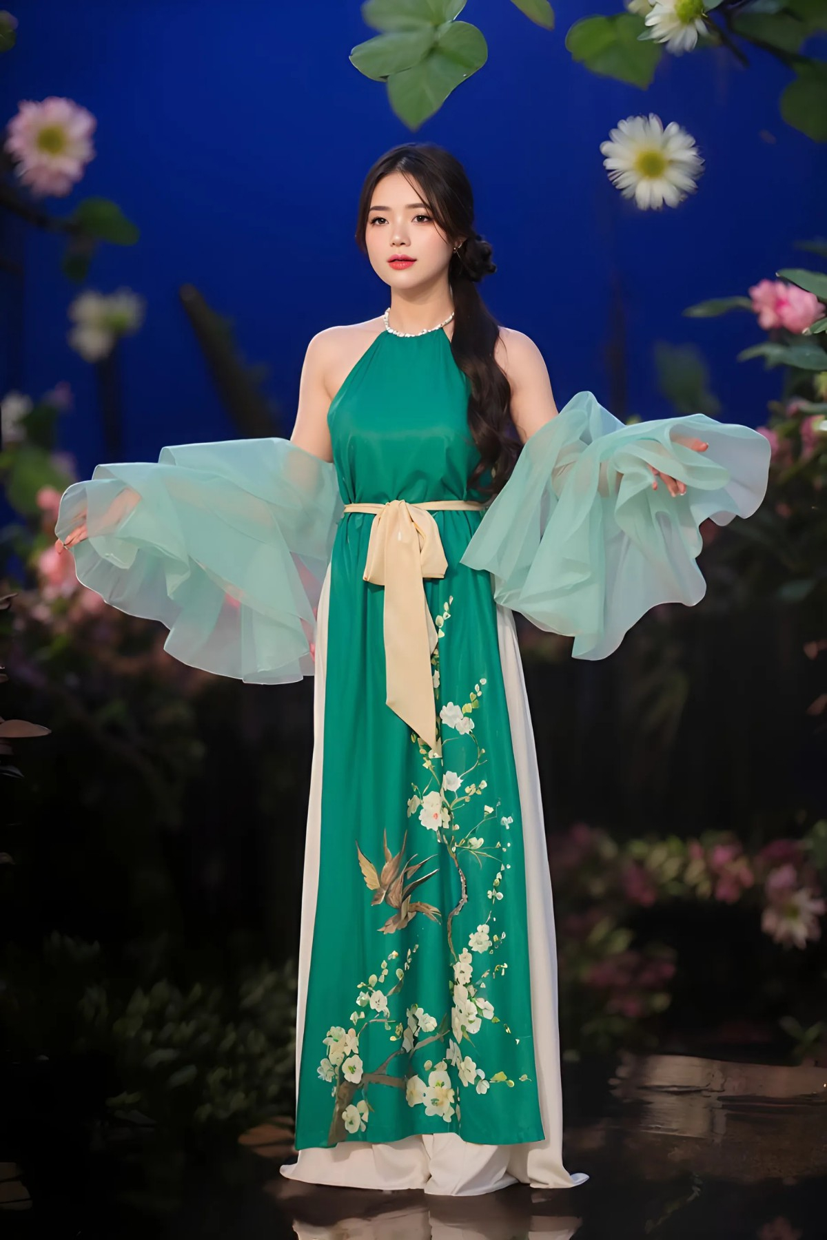 ÁO DÀI TRÌNH DIỄN HỌA TIẾT HOA LÁ VÀ CHIM - Size S