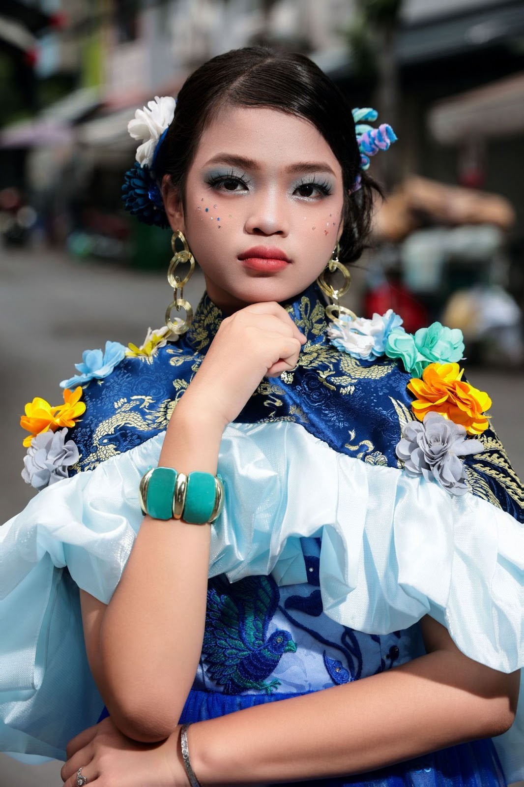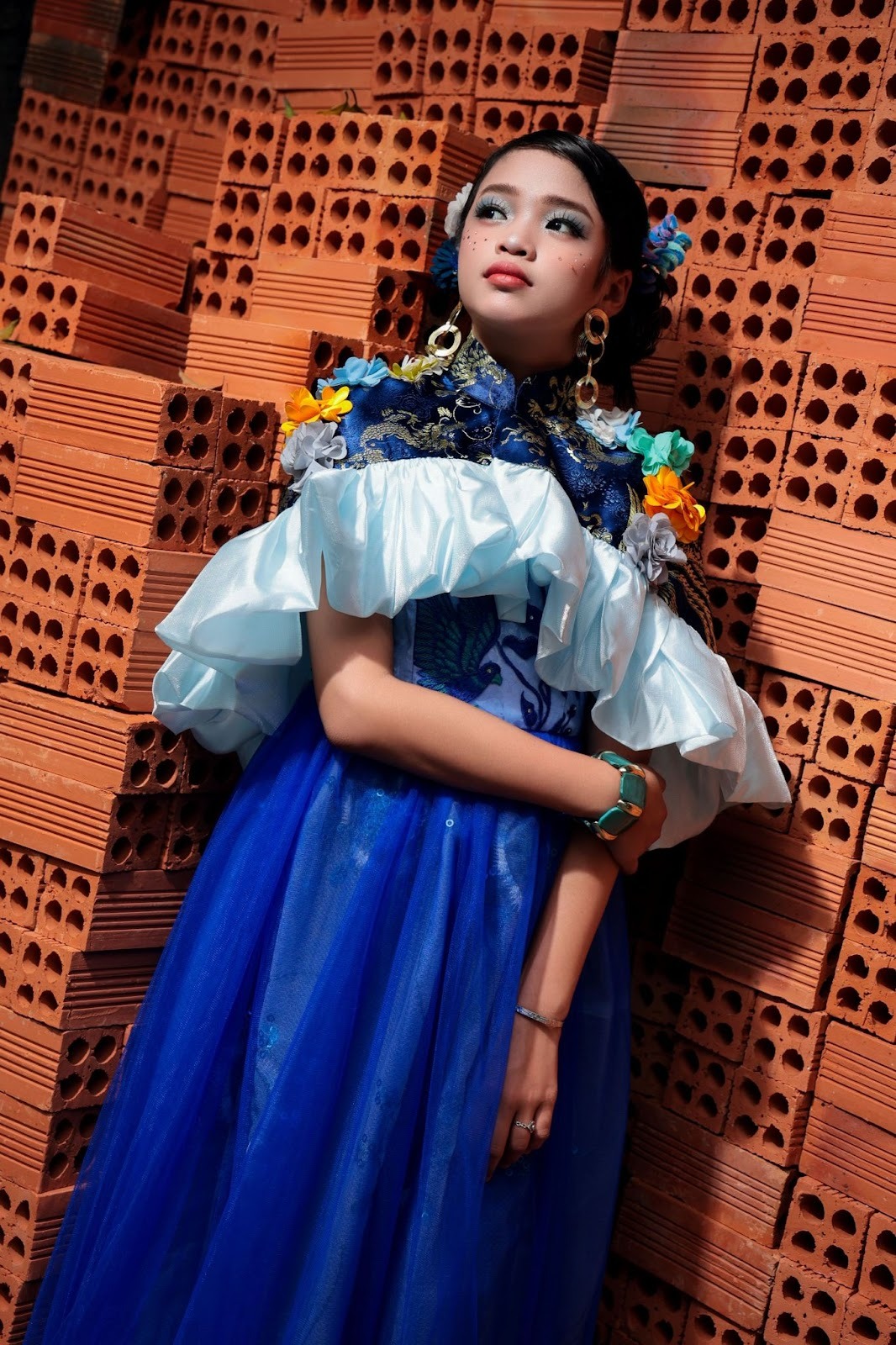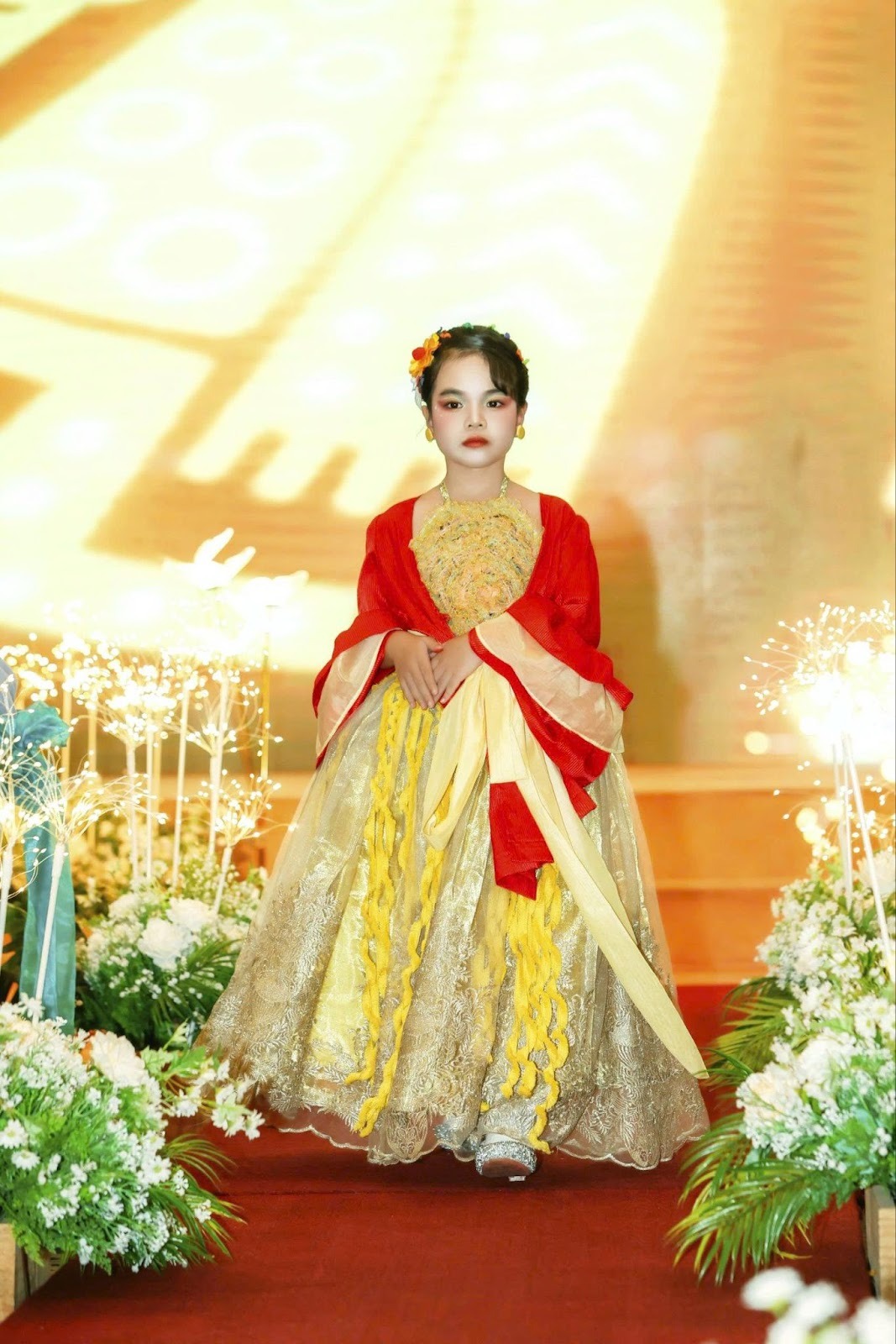 Đúng như cái tên của mình, Model Cát Tiên hiện diện như một "nàng tiên" nhỏ trong bản tình ca di sản. Cô bé sở hữu vẻ đẹp thanh tú, nhẹ nhàng với đôi mắt biết nói. Trong các thiết kế gấm vương giả, Cát Tiên mang đến sự uyển chuyển và mềm mại, gợi nhắc đến hình ảnh những mỹ nhân trong các câu chuyện dân gian xưa nhưng vẫn mang hơi thở hiện đại qua cách tạo dáng tự tin.