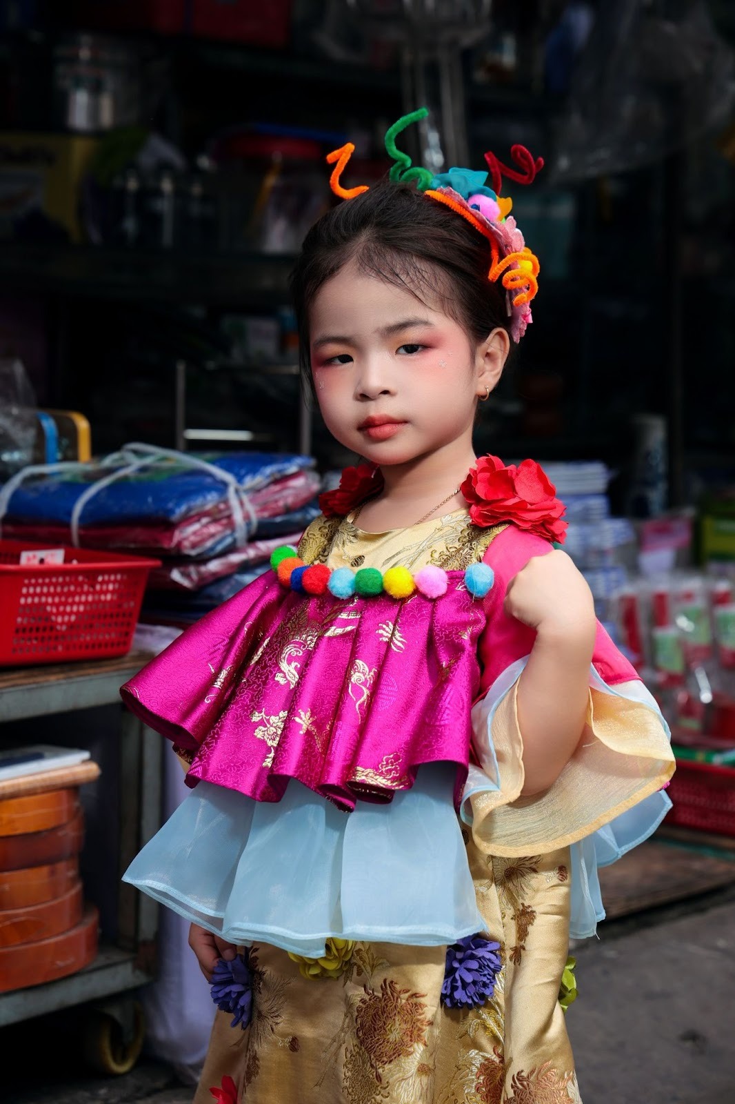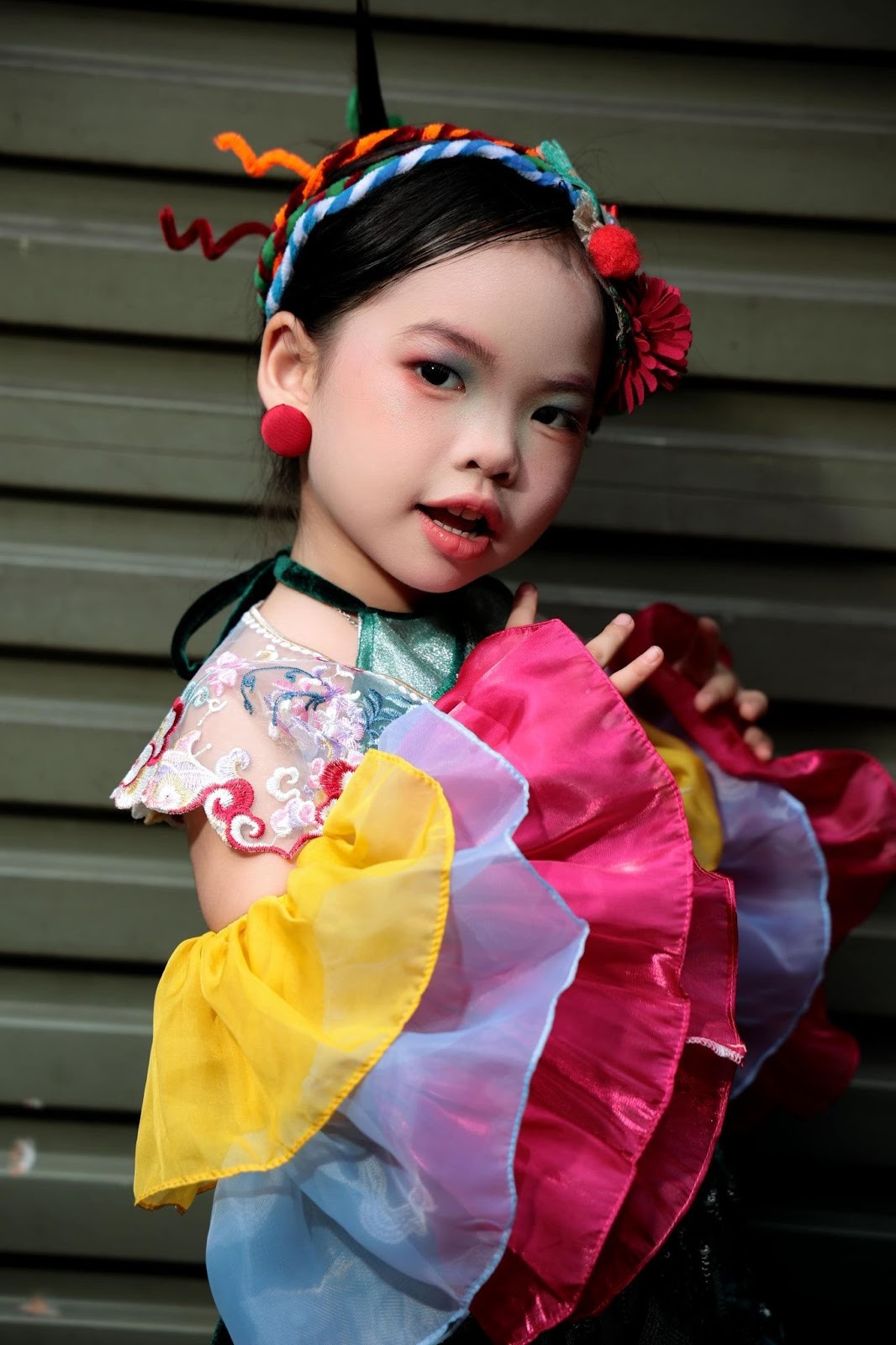 Quỳnh Anh không đi theo lối mòn của sự ngây thơ đơn thuần. Cô bé sở hữu những góc mặt sắc sảo, cực kỳ phù hợp với các concept thời trang cao cấp. Trong bộ trang phục gấm vương giả, Quỳnh Anh đã biến hóa linh hoạt, tạo nên một sự kết nối hoàn hảo giữa trang phục cầu kỳ và thần thái tự tin.