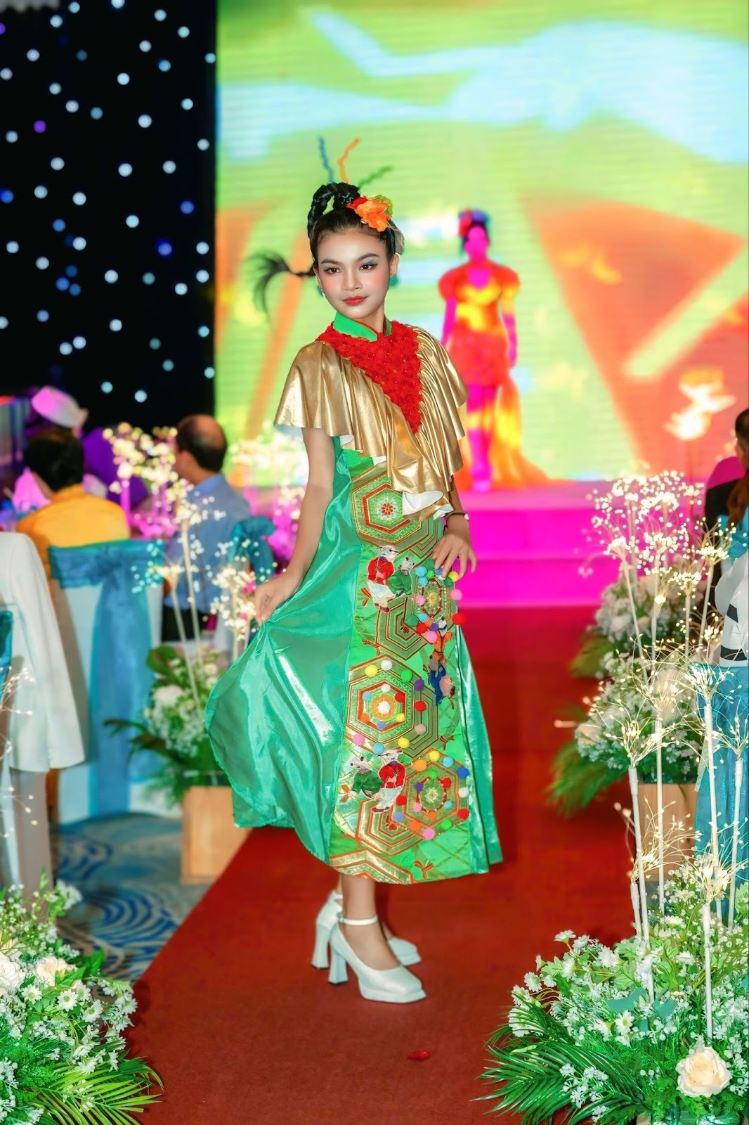 Model Hà Vy gây ấn tượng mạnh mẽ bởi gương mặt mang đậm đường nét thời trang cao cấp. Không chọn phong cách nhẹ nhàng thường thấy, Hà Vy thể hiện một bản lĩnh sân khấu vững vàng với những góc mặt sắc lạnh và ánh nhìn đầy chiều sâu. Cô bé cho thấy khả năng làm chủ các thiết kế có cấu trúc cầu kỳ, biến mỗi bước đi thành một lời khẳng định về phong cách cá nhân độc đáo.
