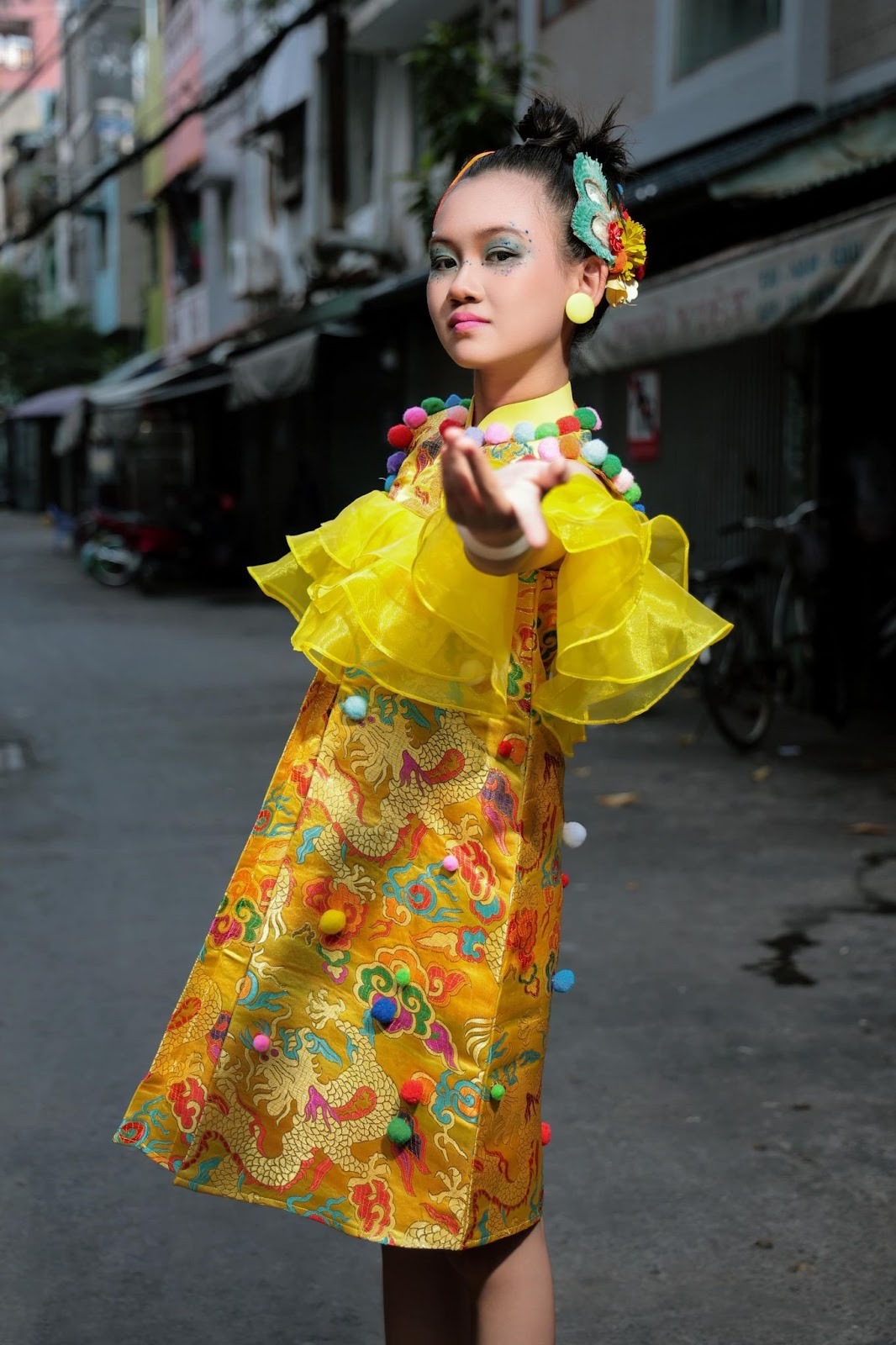 Nhã Uyên sở hữu một nét đẹp rất riêng – sự hòa quyện giữa nét đài các của những thiếu nữ xưa và sự tự tin của thế hệ mẫu trẻ hiện đại. Trong thiết kế sắc vàng đỏ chủ đạo, cô bé đã khéo léo thể hiện được tinh thần của bộ sưu tập: Sự tôn trọng và gìn giữ những giá trị văn hóa ngàn đời.