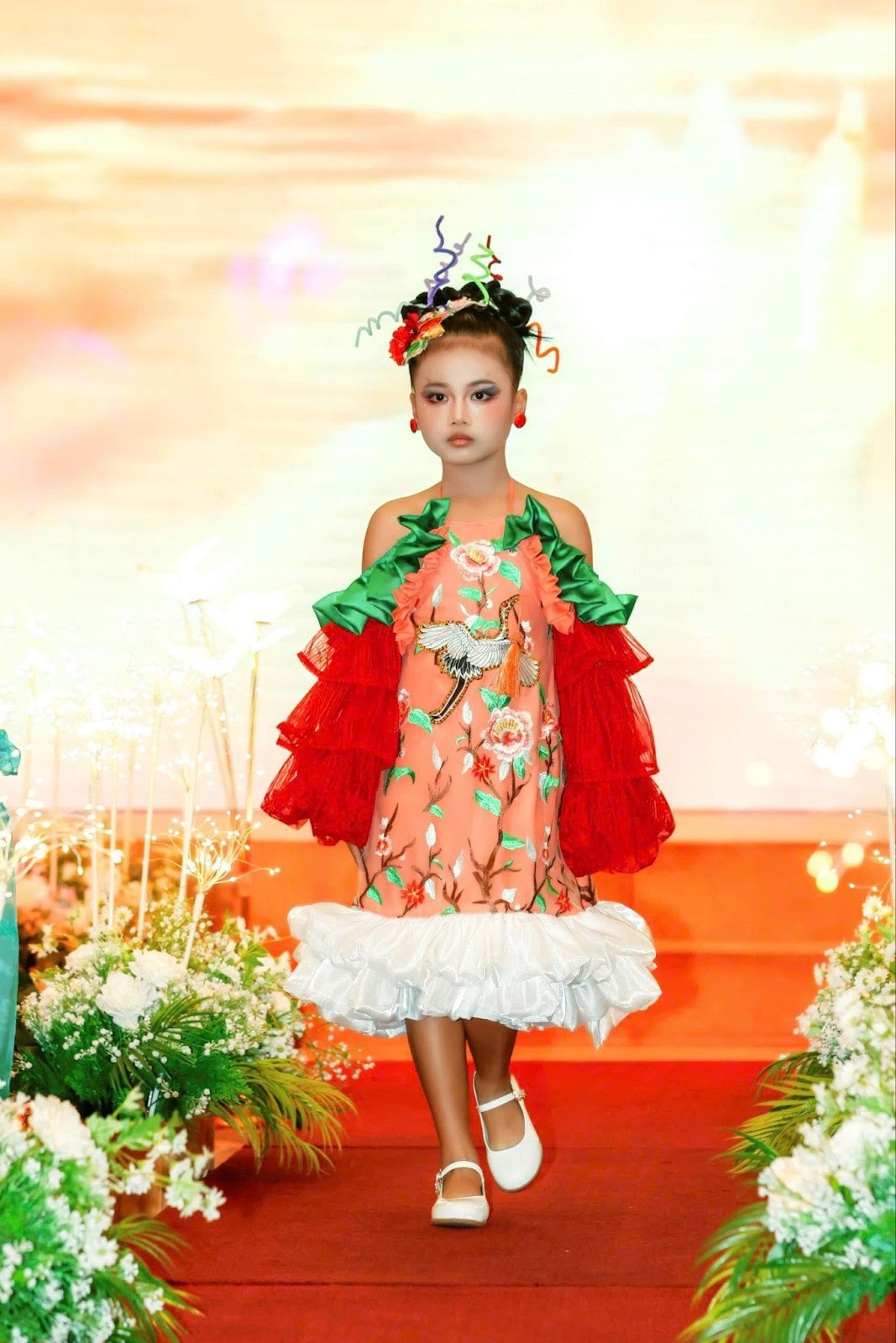 Giữa không gian thời trang lộng lẫy, Linh Đan chọn cho mình một phong cách nhẹ nhàng nhưng đầy chiều sâu. Cô bé thu hút mọi ánh nhìn bởi gương mặt hiền hậu, đôi mắt sáng và thần thái trong trẻo. Thiết kế yếm cách tân với họa tiết hoa sen và chim hạc dường như được sinh ra để dành riêng cho nét đẹp thuần Việt của Linh Đan.