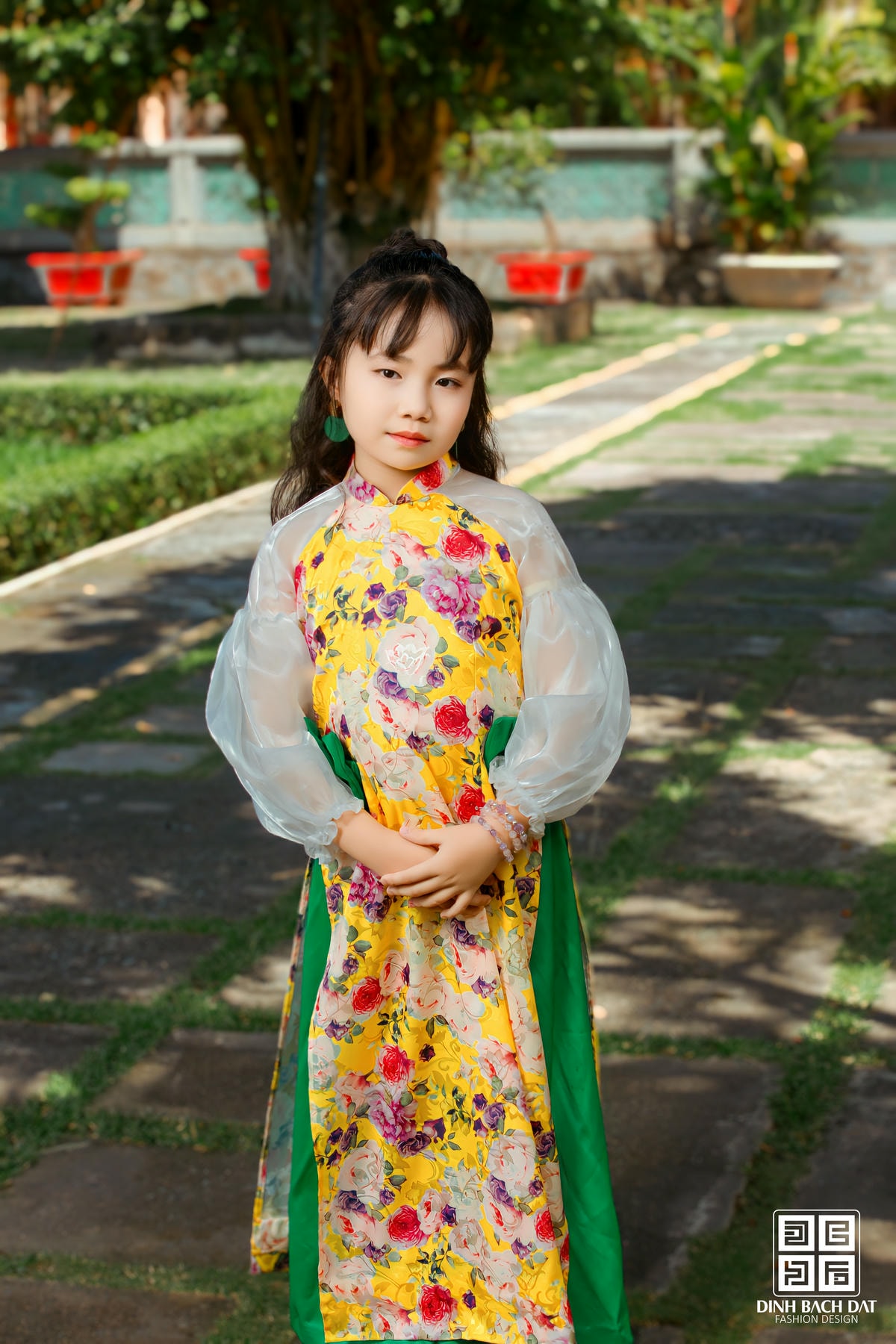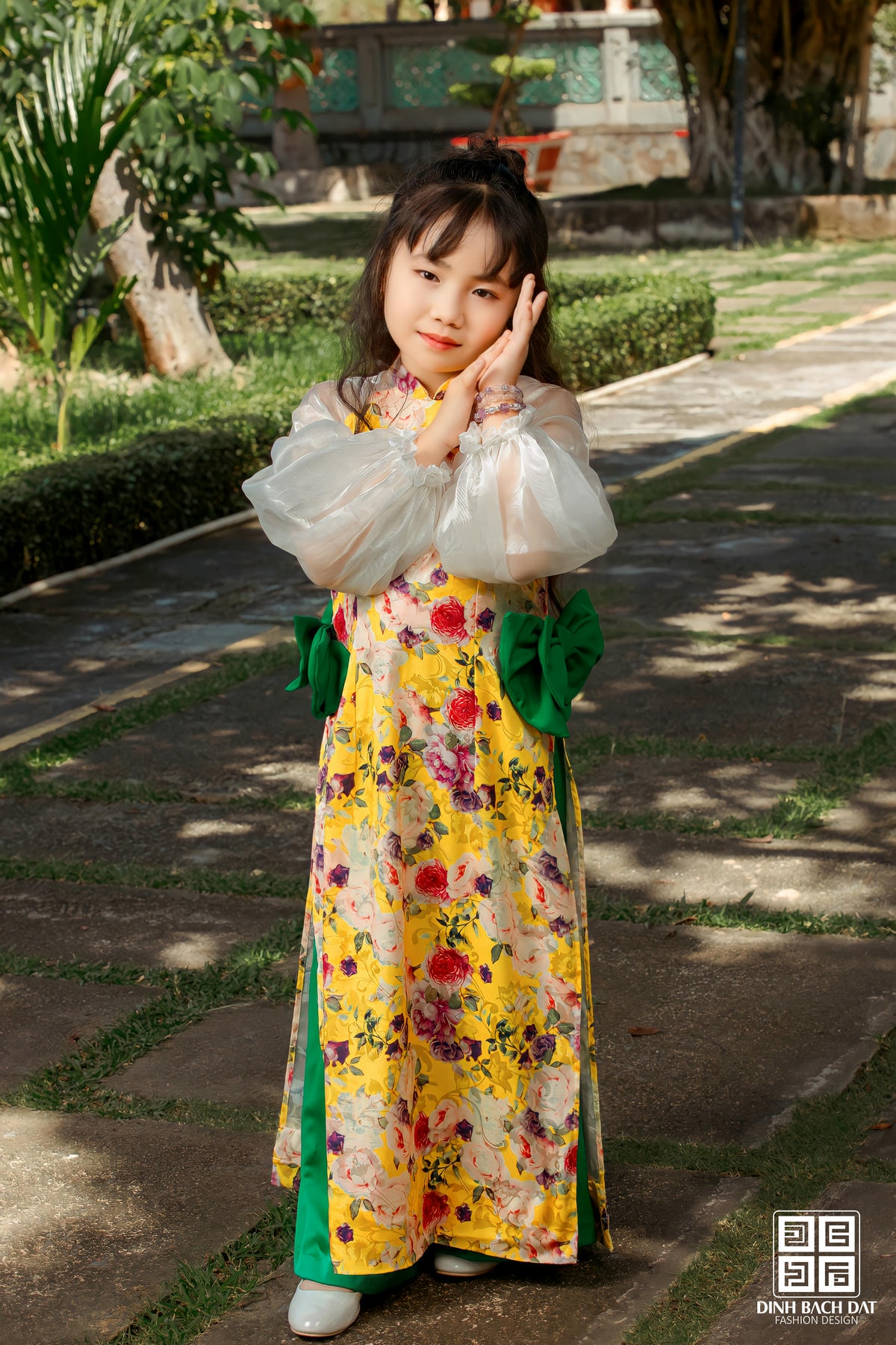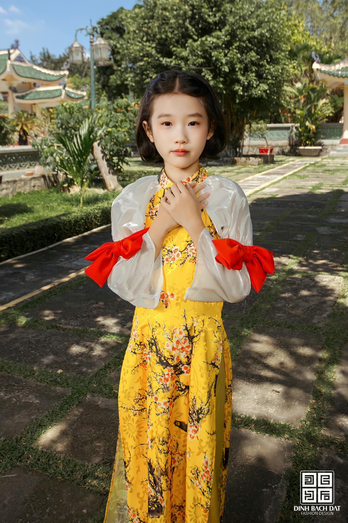 Mẫu nhí Khiết Anh mang vẻ đẹp hồn nhiên, trong trẻo với thiết kế áo dài tông Vàng chủ đạo, họa tiết hoa lá Tím, Hồng nổi bật. Điểm nhấn là chi tiết tay phồng lớn bằng chất liệu voan trắng trong suốt, tạo sự lãng mạn, mơ màng. Thần thái ngọt ngào đã làm dịu đi sự táo bạo của màu sắc, mang đến một hình ảnh quý phái nhưng vẫn rất ngây thơ.