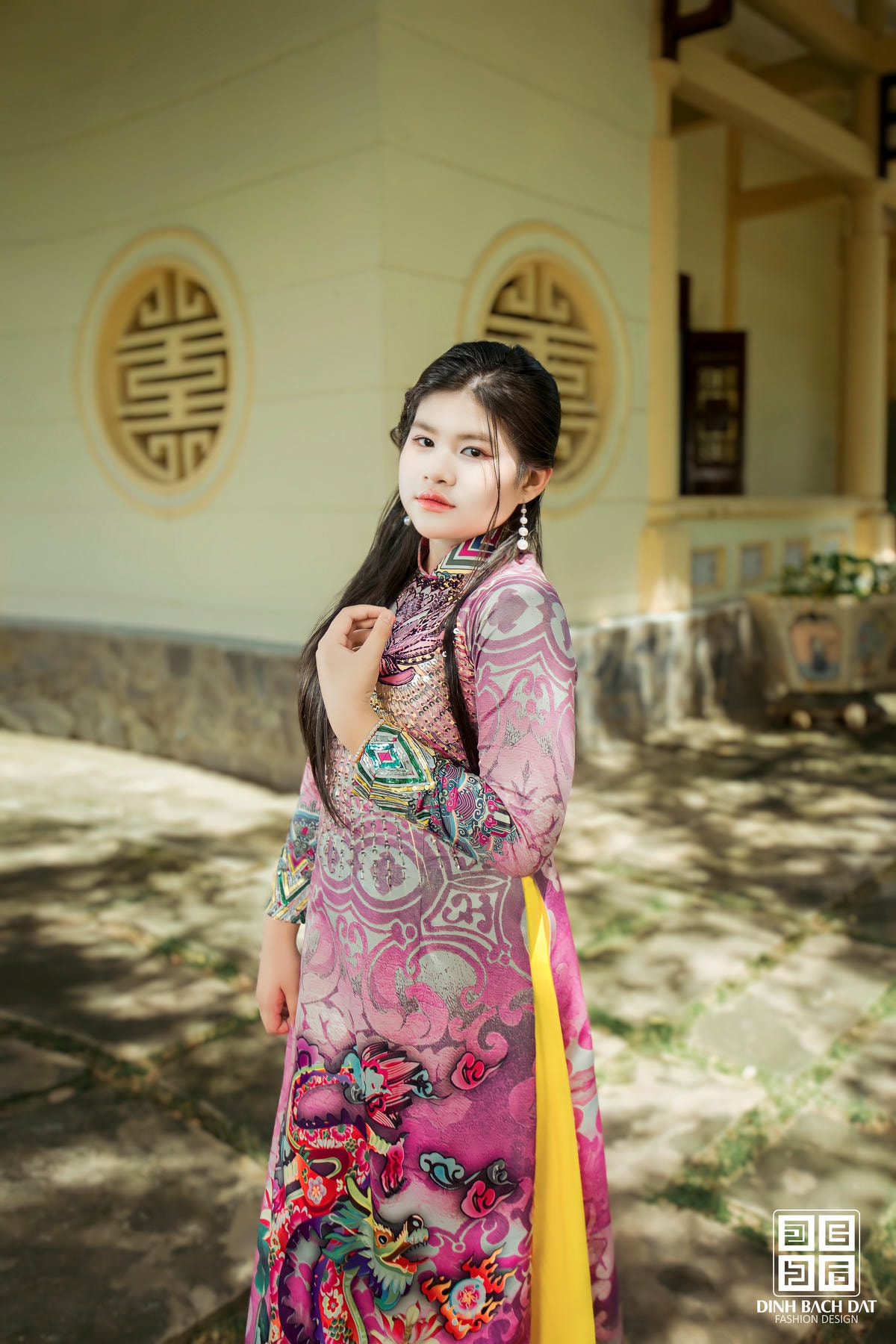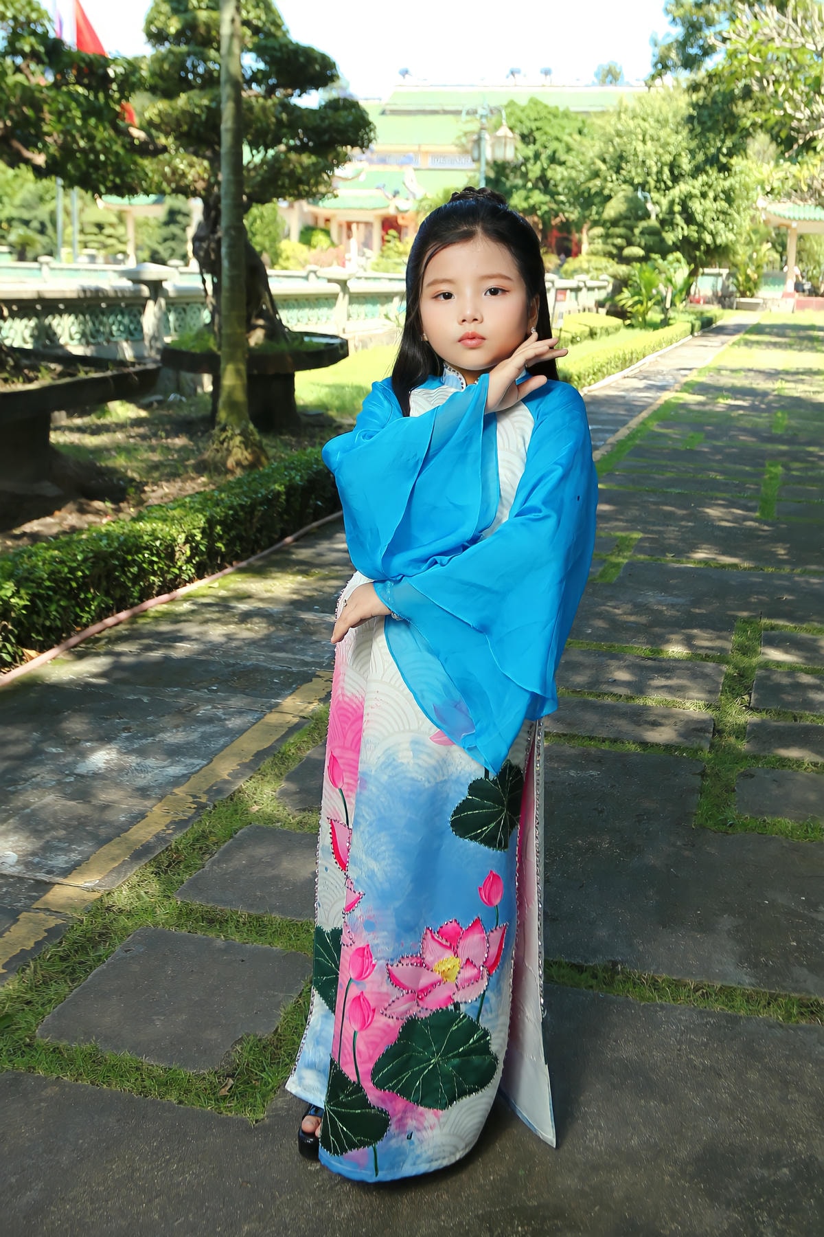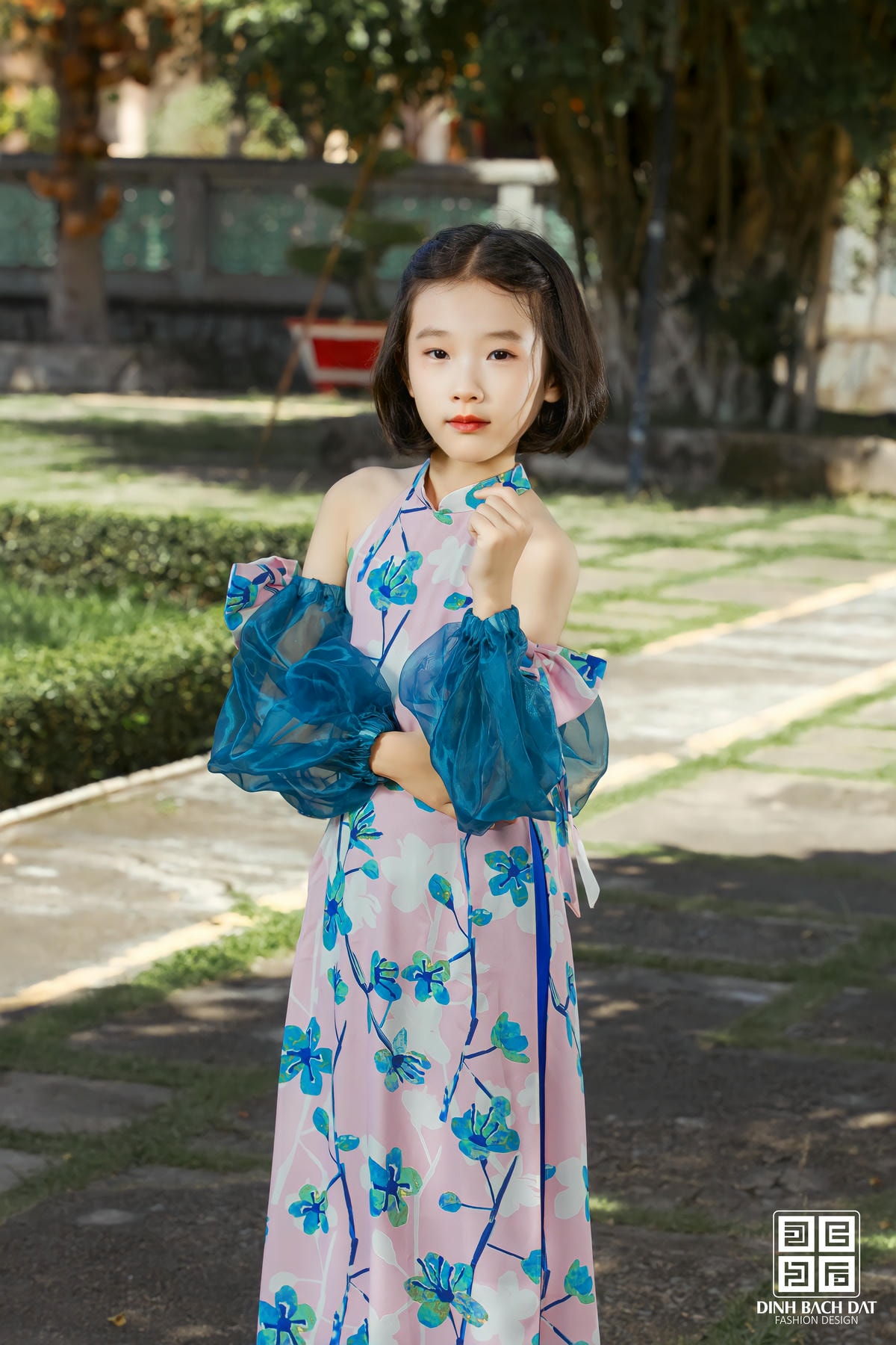 Mẫu nhí Khiết Anh mang vẻ đẹp hồn nhiên, trong trẻo với thiết kế áo dài tông Vàng chủ đạo, họa tiết hoa lá Tím, Hồng nổi bật. Điểm nhấn là chi tiết tay phồng lớn bằng chất liệu voan trắng trong suốt, tạo sự lãng mạn, mơ màng. Thần thái ngọt ngào đã làm dịu đi sự táo bạo của màu sắc, mang đến một hình ảnh quý phái nhưng vẫn rất ngây thơ.