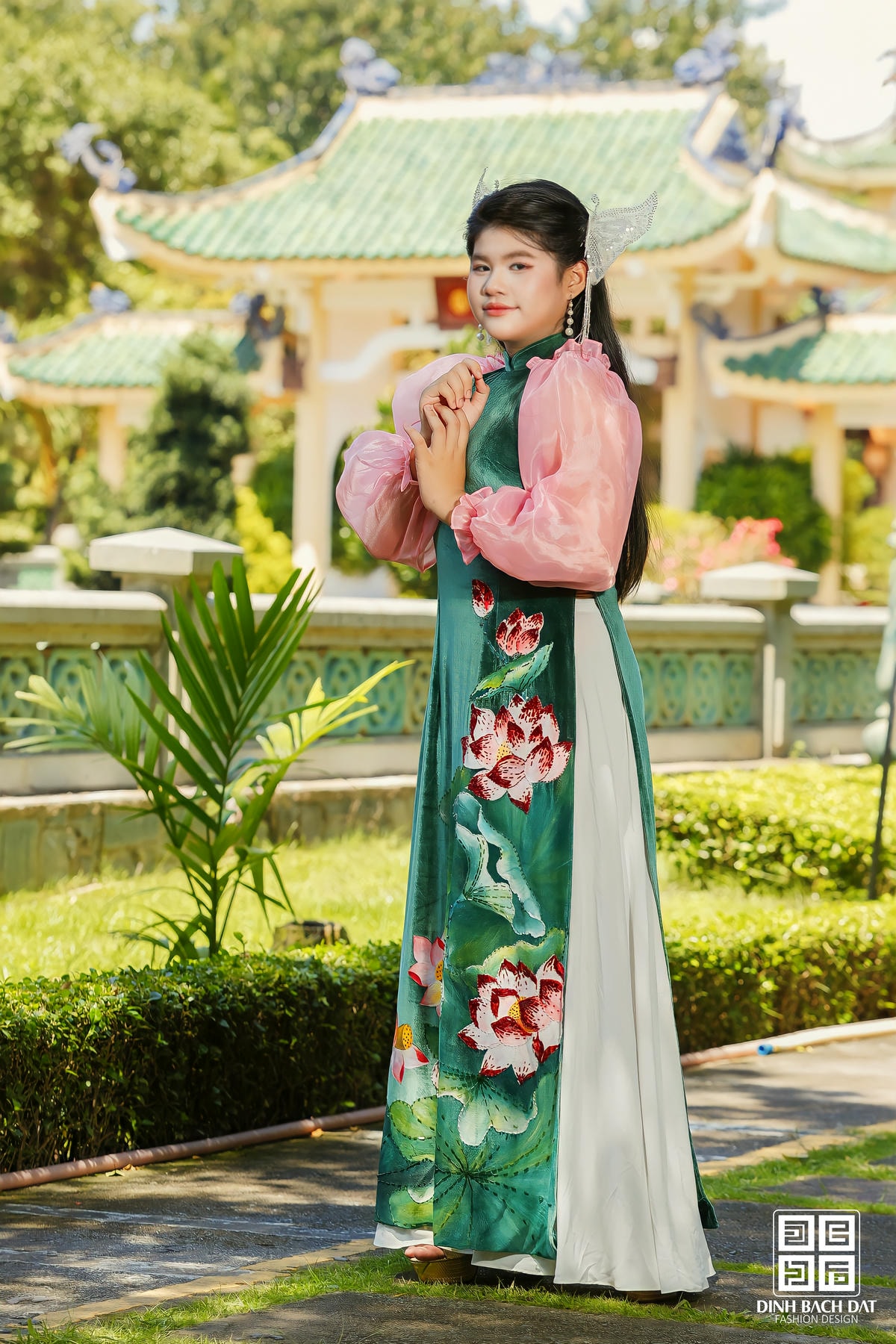 Mira Bảo Anh mang đến vẻ đẹp tinh khiết, gần gũi với thiên nhiên qua các thiết kế áo dài họa tiết sen, hạc. Thiết kế thứ nhất nổi bật với sen hồng trên nền xanh coban táo bạo. Thiết kế thứ hai dịu mát hơn với tông xanh ngọc/xanh lá, thể hiện sự thanh tao, thơ mộng của vẻ đẹp đồng quê Việt Nam. Thần thái hồn nhiên, duyên dáng của mẫu nhí đã làm nổi bật sự mềm mại và chiều sâu của các họa tiết văn hóa.